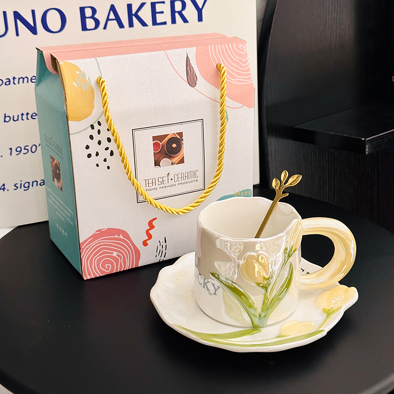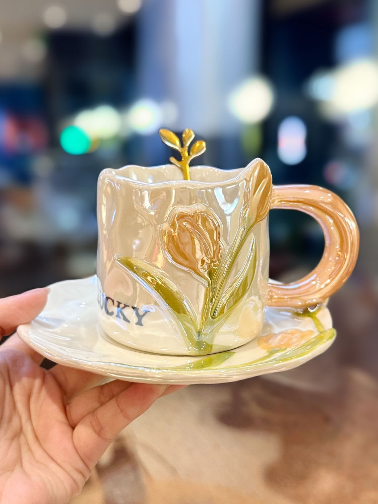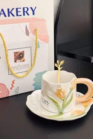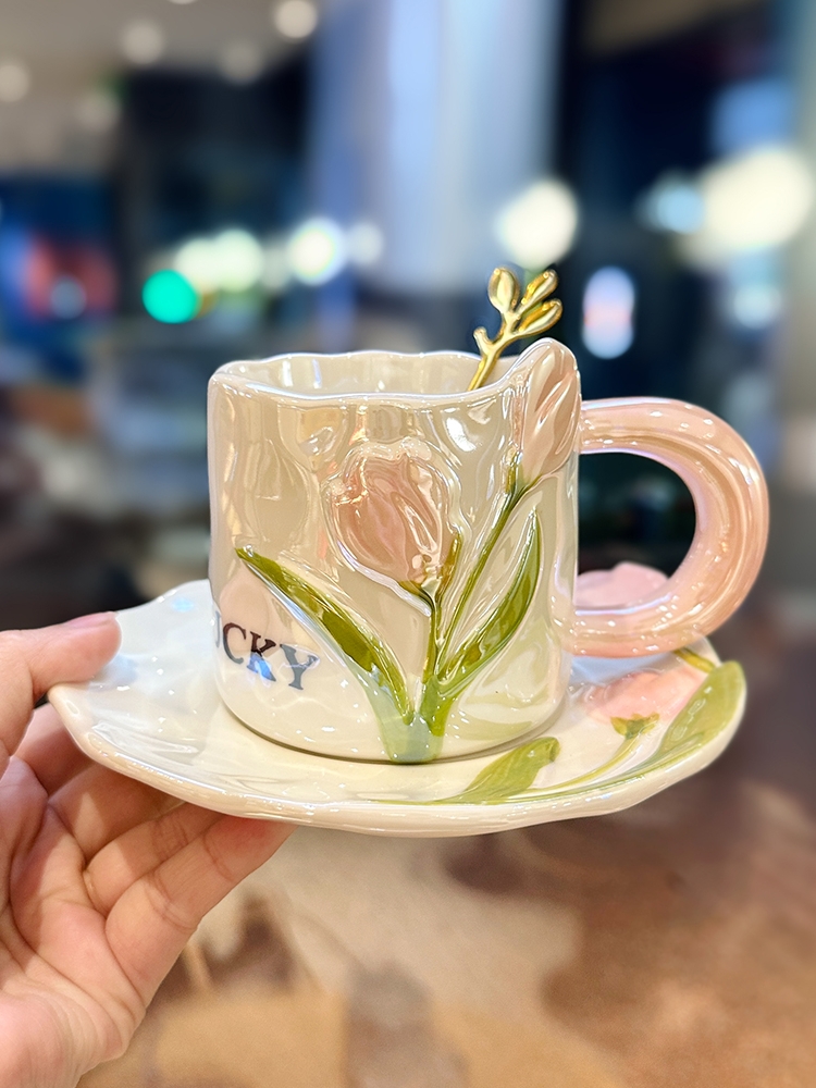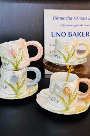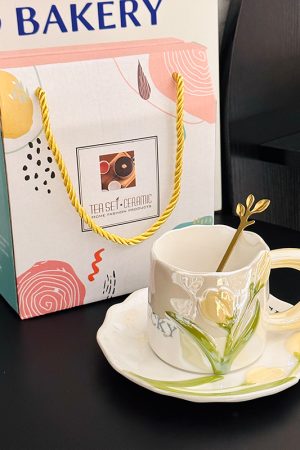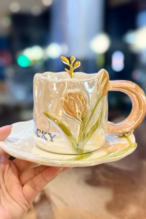 Delicate Pearl Glaze Tulip Ceramic Cup and Saucer Set – Elegant Cof – Birthday Outfit