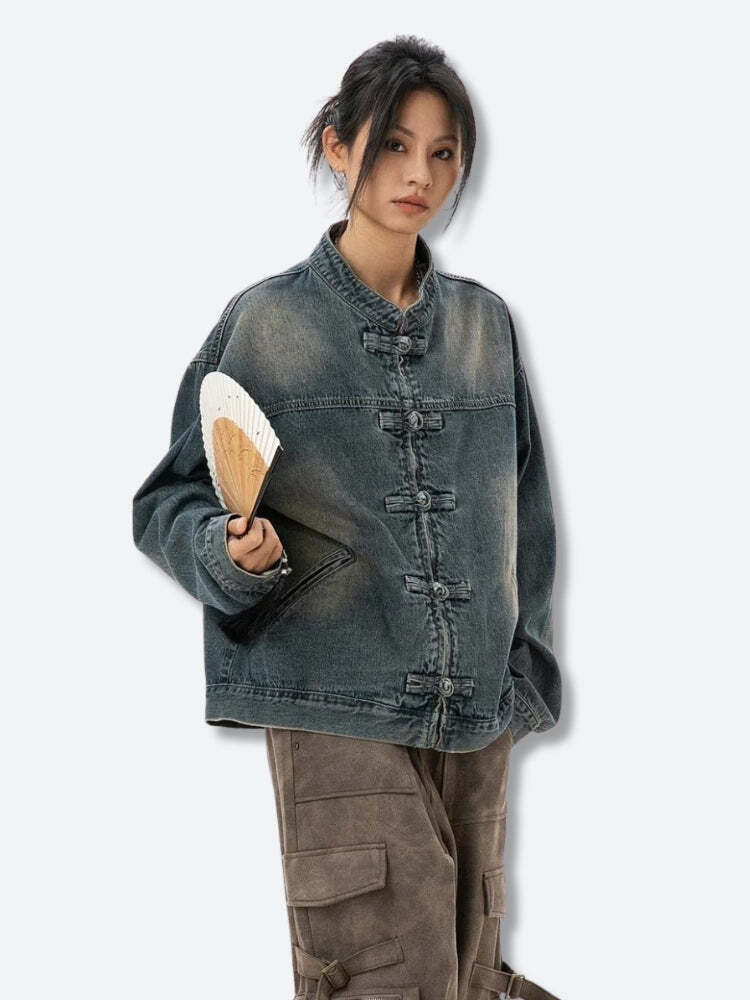 The Distressed Denim Jacket blends classic denim with traditional frog button closures for a unique twist. Its washed finish offers a vintage vibe, while the mandarin collar adds sophistication. Perfect with cargo pants for streetwear or jeans for a casual, coordinated look.