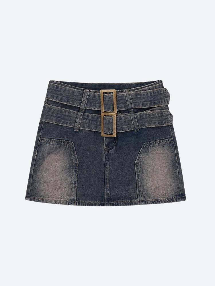 Showcase a blend of urban edge and playful flair with this distinctive double-belted denim mini skort. Perfect for those who dare to tread the line between bold and casual, it offers the practicality of shorts and the style of a skirt. The weathered denim finish and frayed edges capture a rebellious spirit, while the double buckled belts add a touch of utilitarian chic.