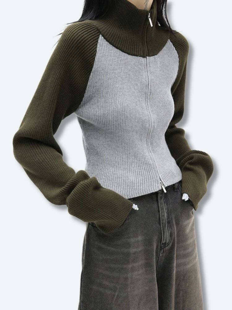 The Double Zip-Up Ribbed Cardigan offers a sleek, versatile style with a high neck and full zip closure. Wear it zipped for warmth or half-open for a relaxed look. Perfect with wide-leg jeans or high-waisted pants.