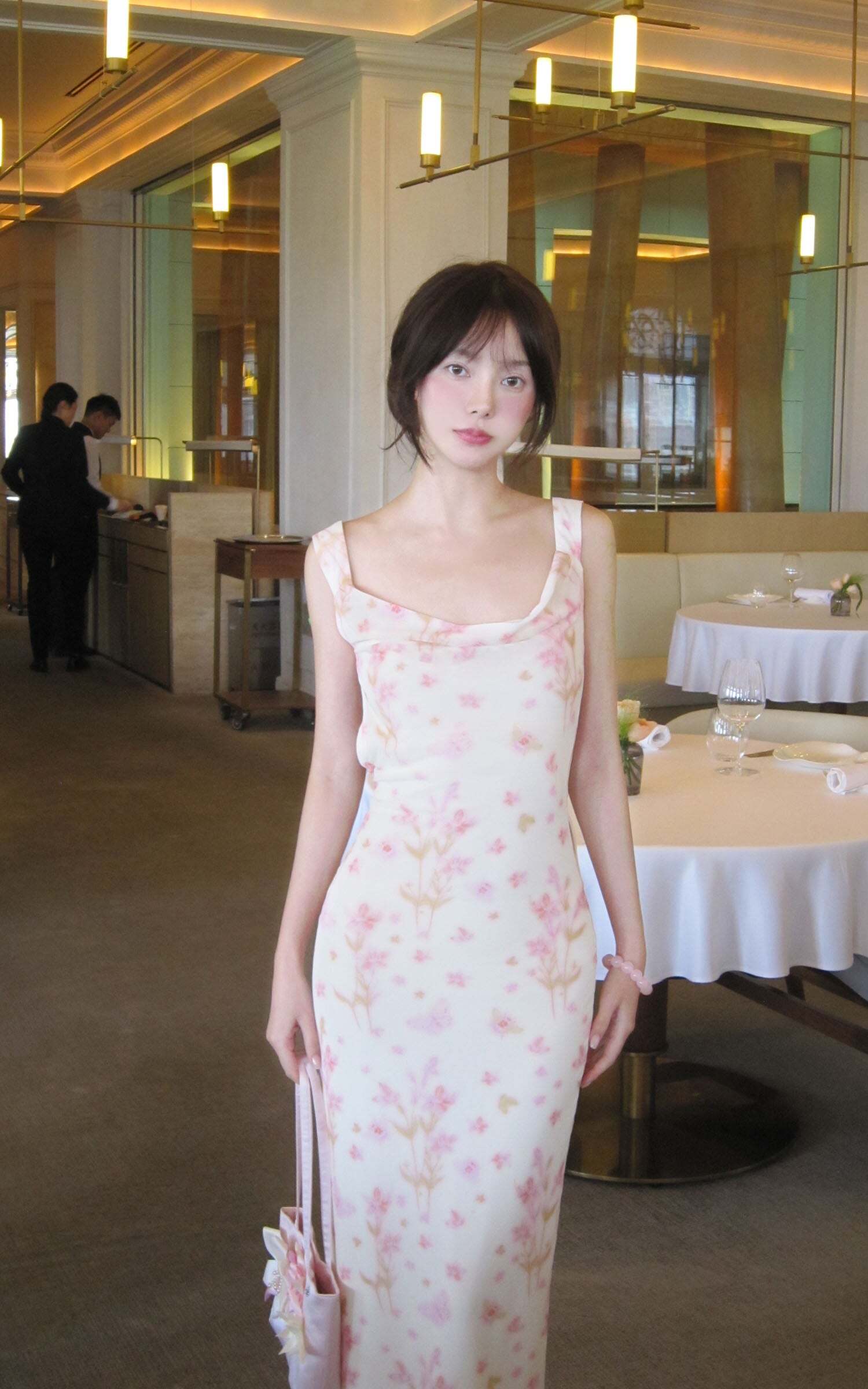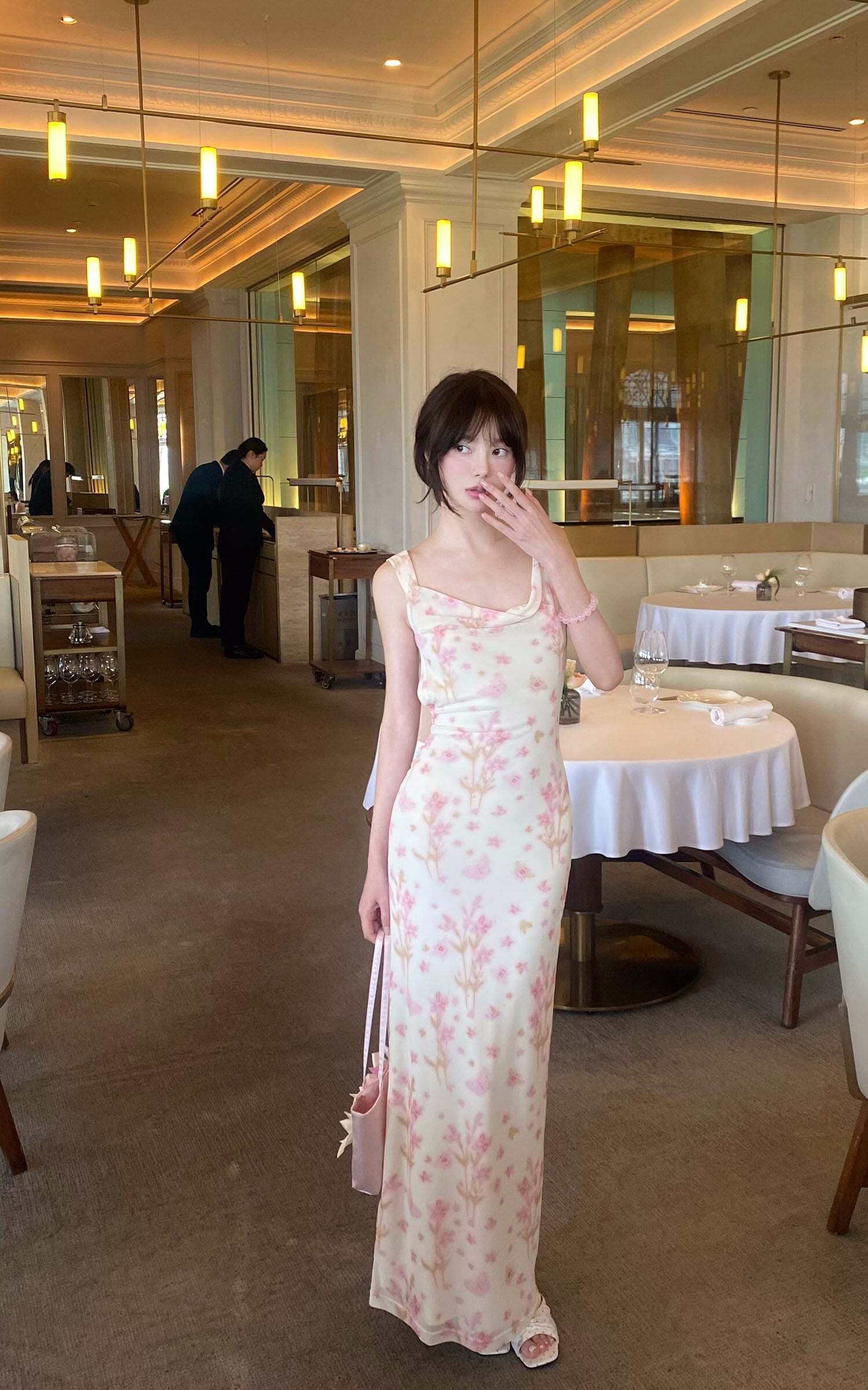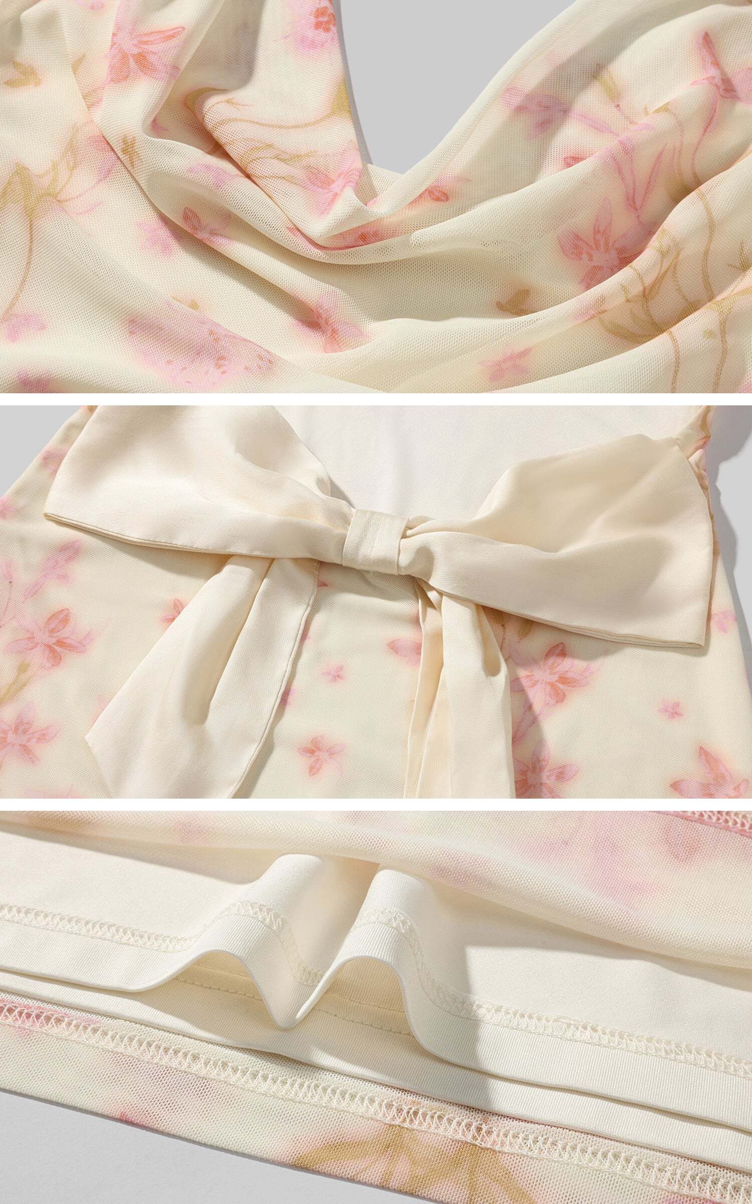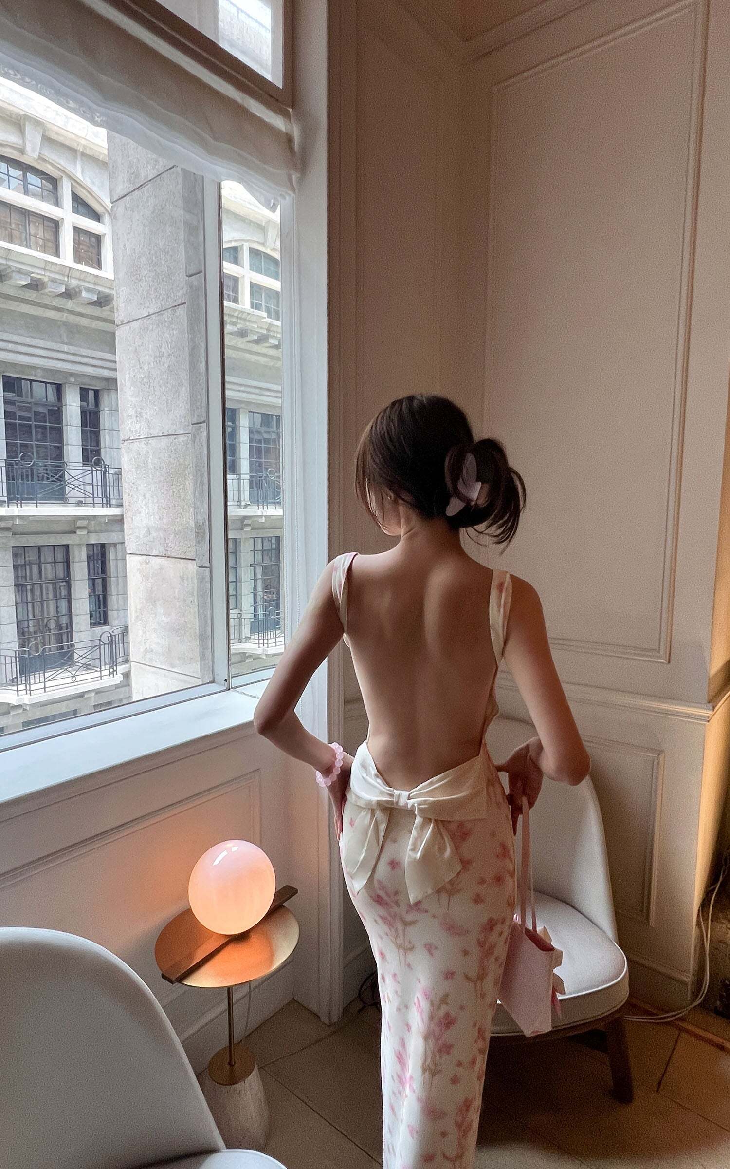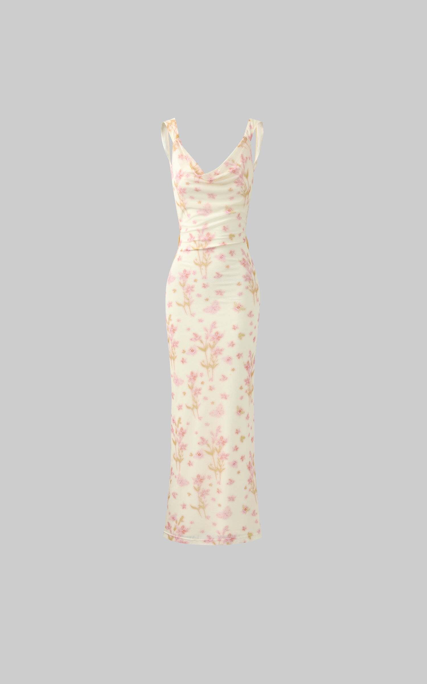 Romance lingers in every thread of this figure-skimming mesh maxi. The soft floral print cascades like spring petals, while a cowl neckline and dramatic backless cut reveal just enough. Finished with an oversized bow for a dreamy exit, it’s made for candlelit dinners and stolen glances.