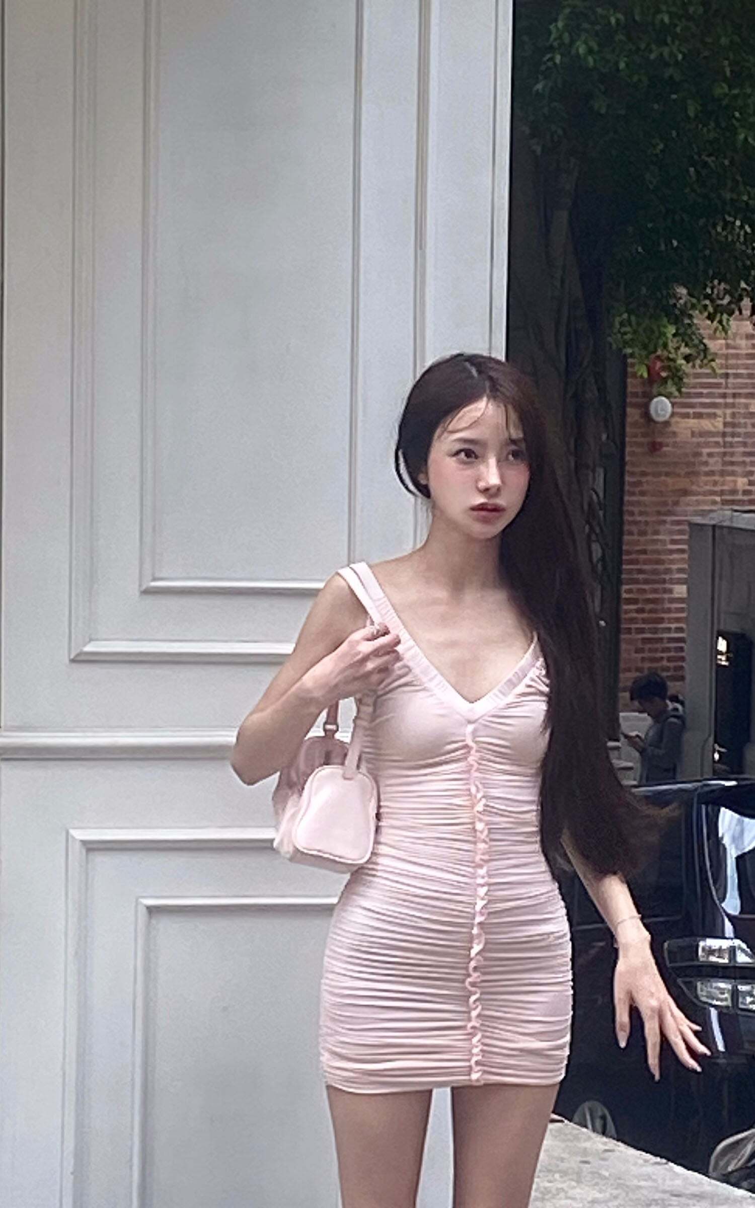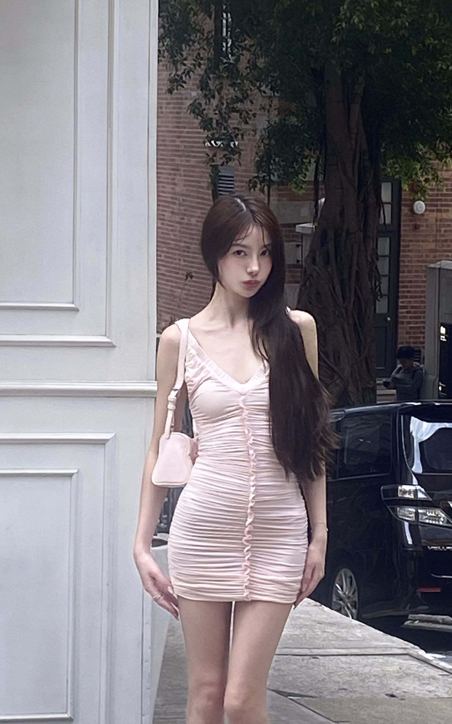 The kind of dress that turns sidewalks into runways. This ultra-feminine bodycon mini hugs in all the right places, made from soft stretch mesh with delicate ruching throughout. A deep V neckline and ruffle-trimmed center seam add that perfect mix of sweet and flirty. Light, playful, and effortlessly sexy — it’s a dress made for long city walks and late-night glances.