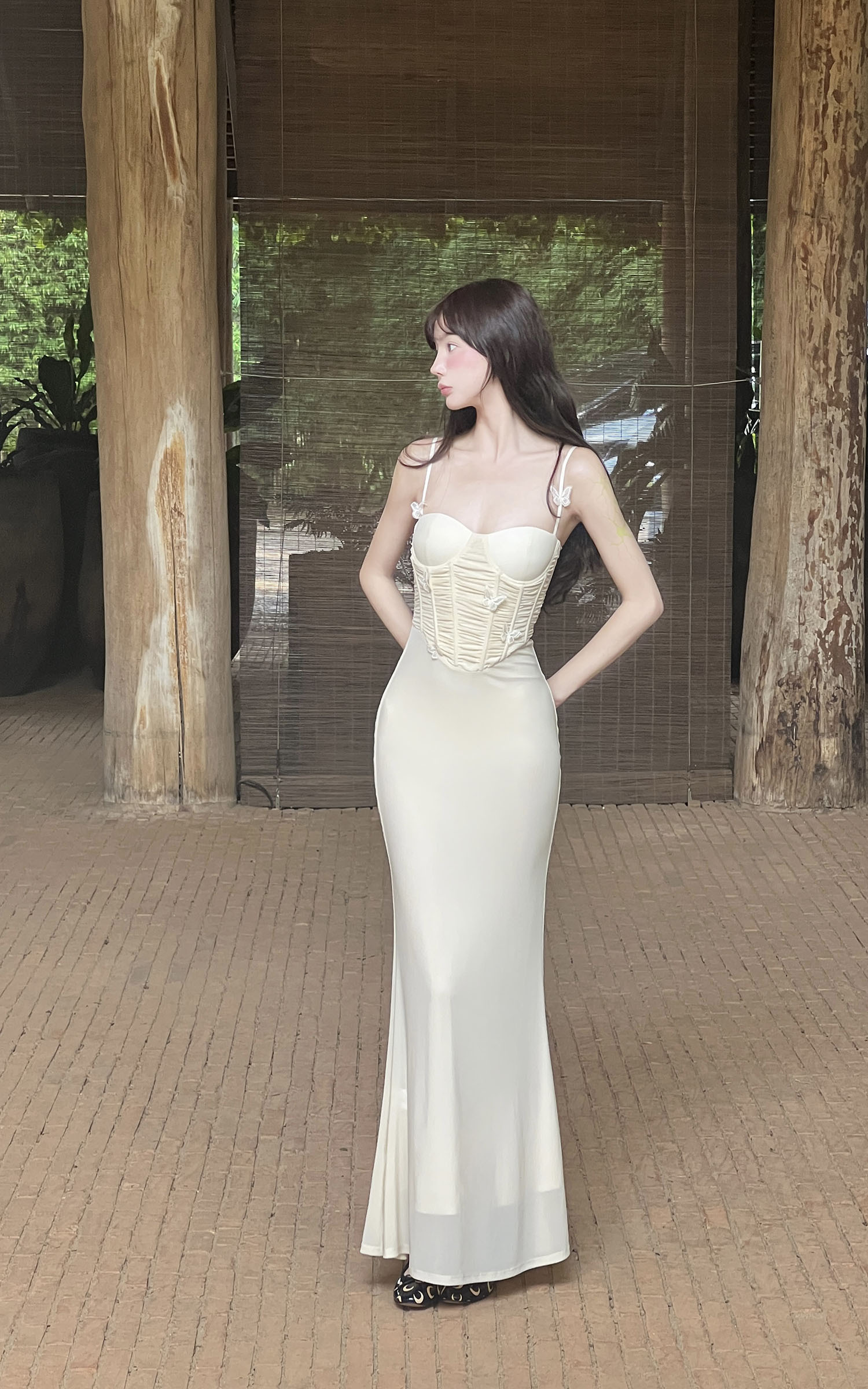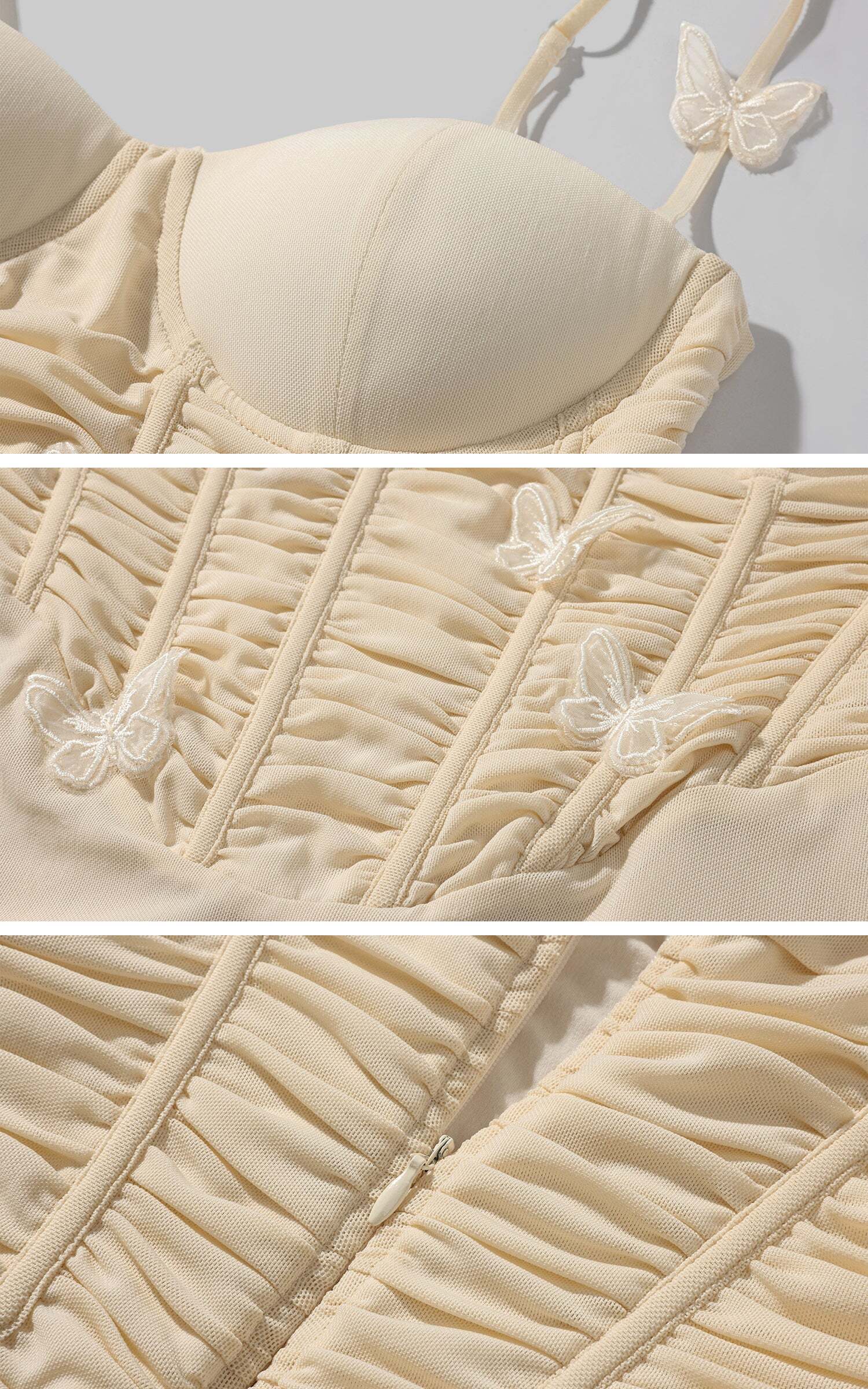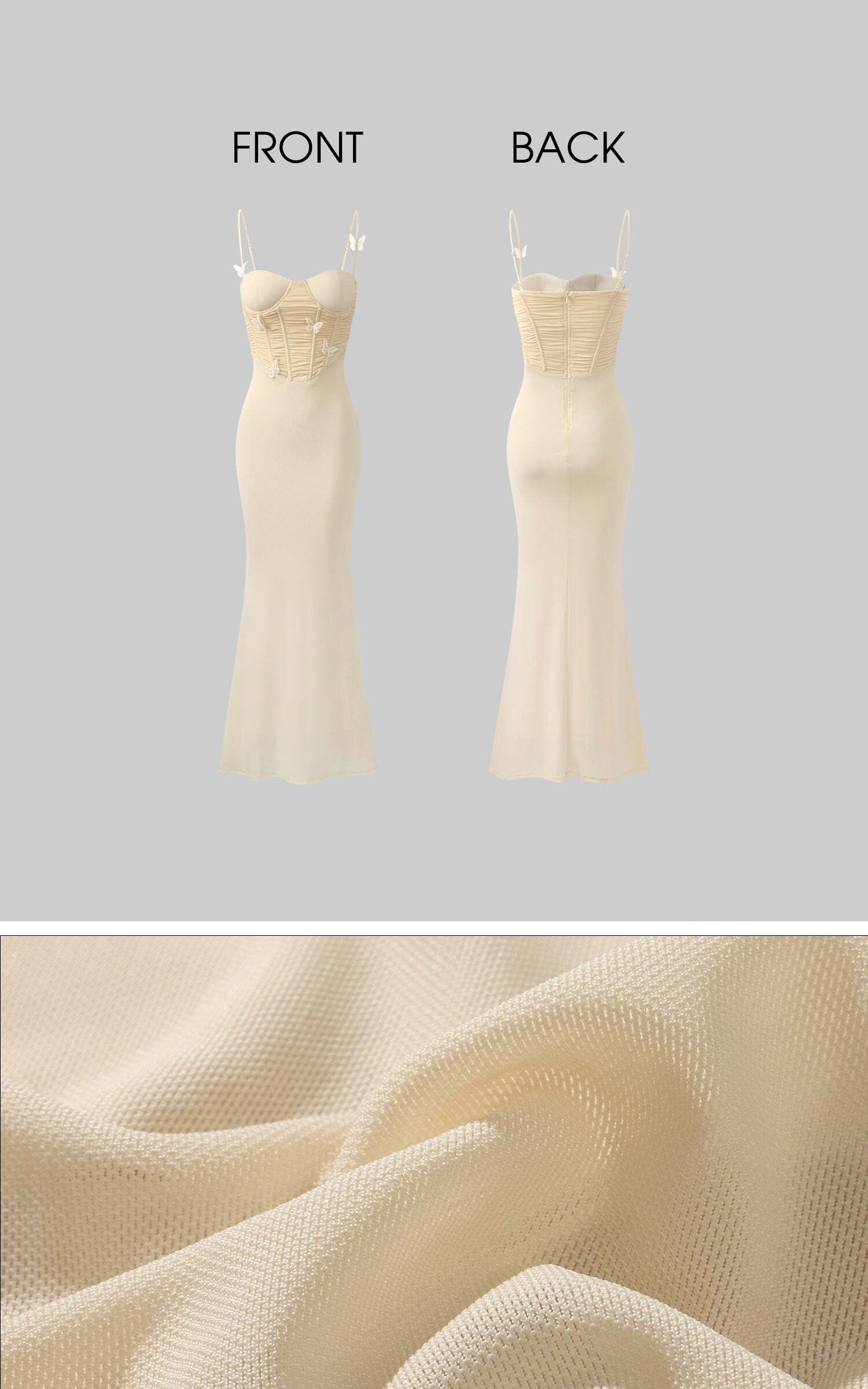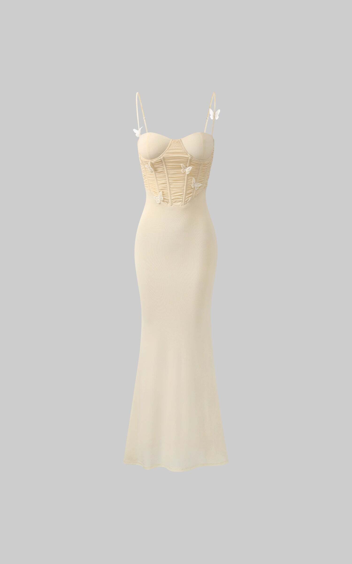 A fairytale silhouette kissed with soft drama. This mesh maxi dress is shaped by a ruched corset bodice adorned with dainty butterfly appliqués that flutter with every move. The molded cups and boning offer subtle structure, while the flared hem adds an effortless grace. Perfect for twilight dinners or garden rendezvous—just add a whisper of perfume and barely-there heels.