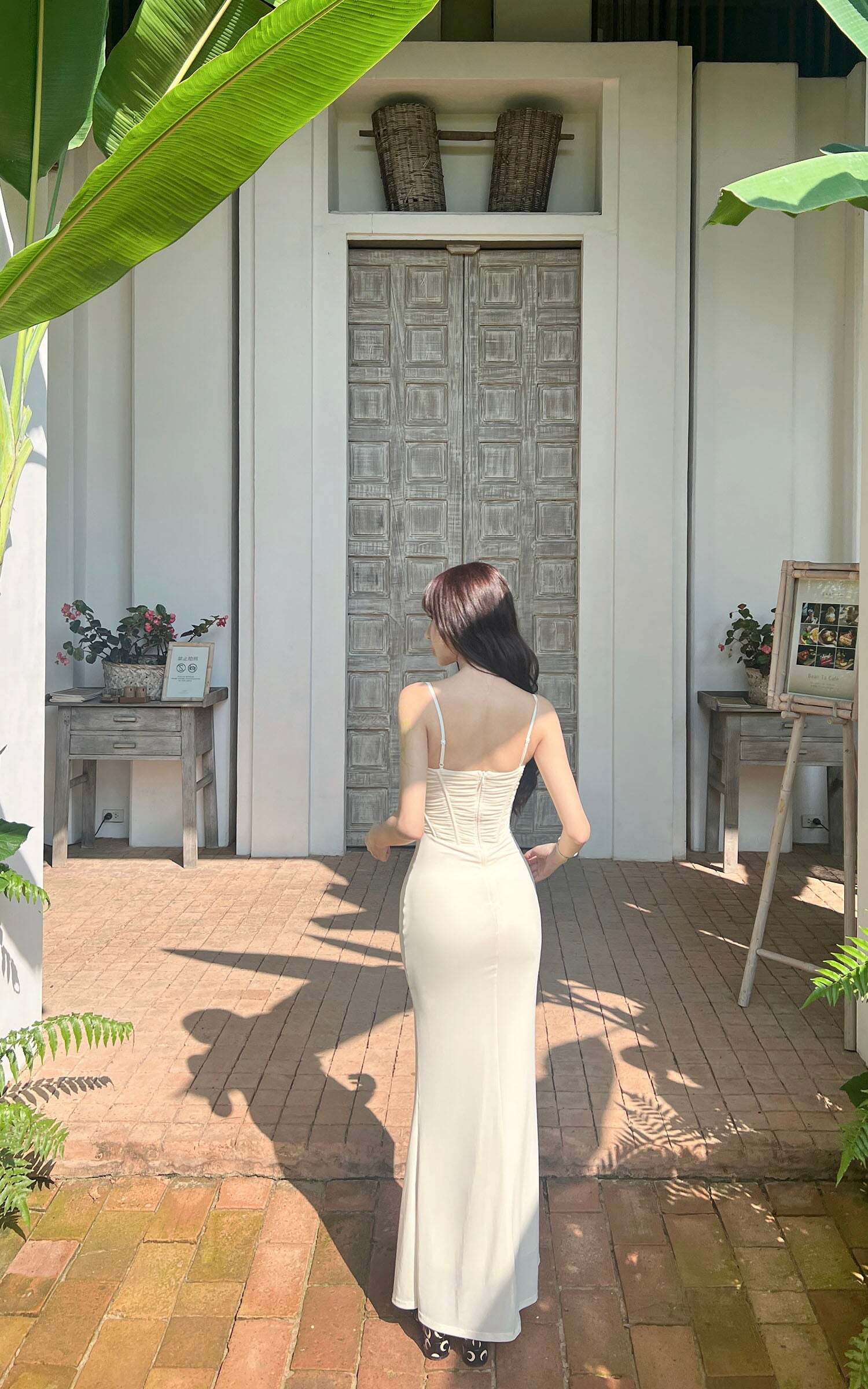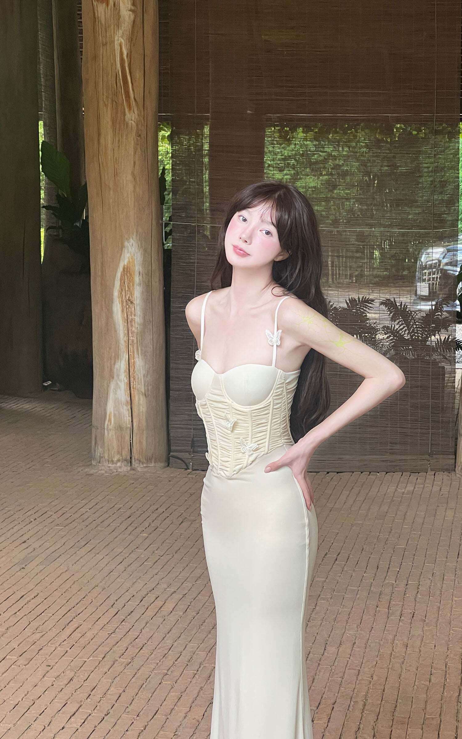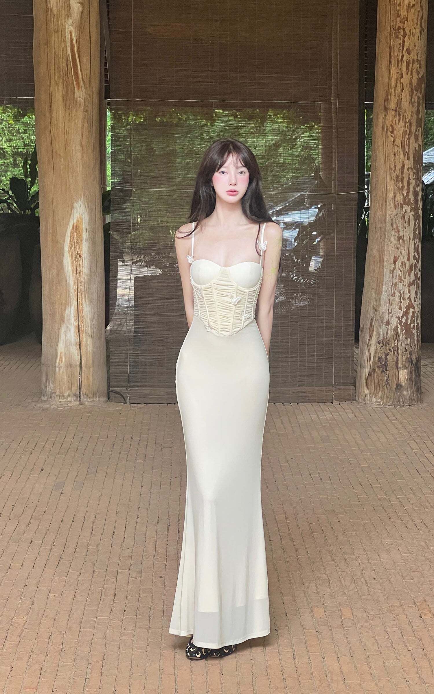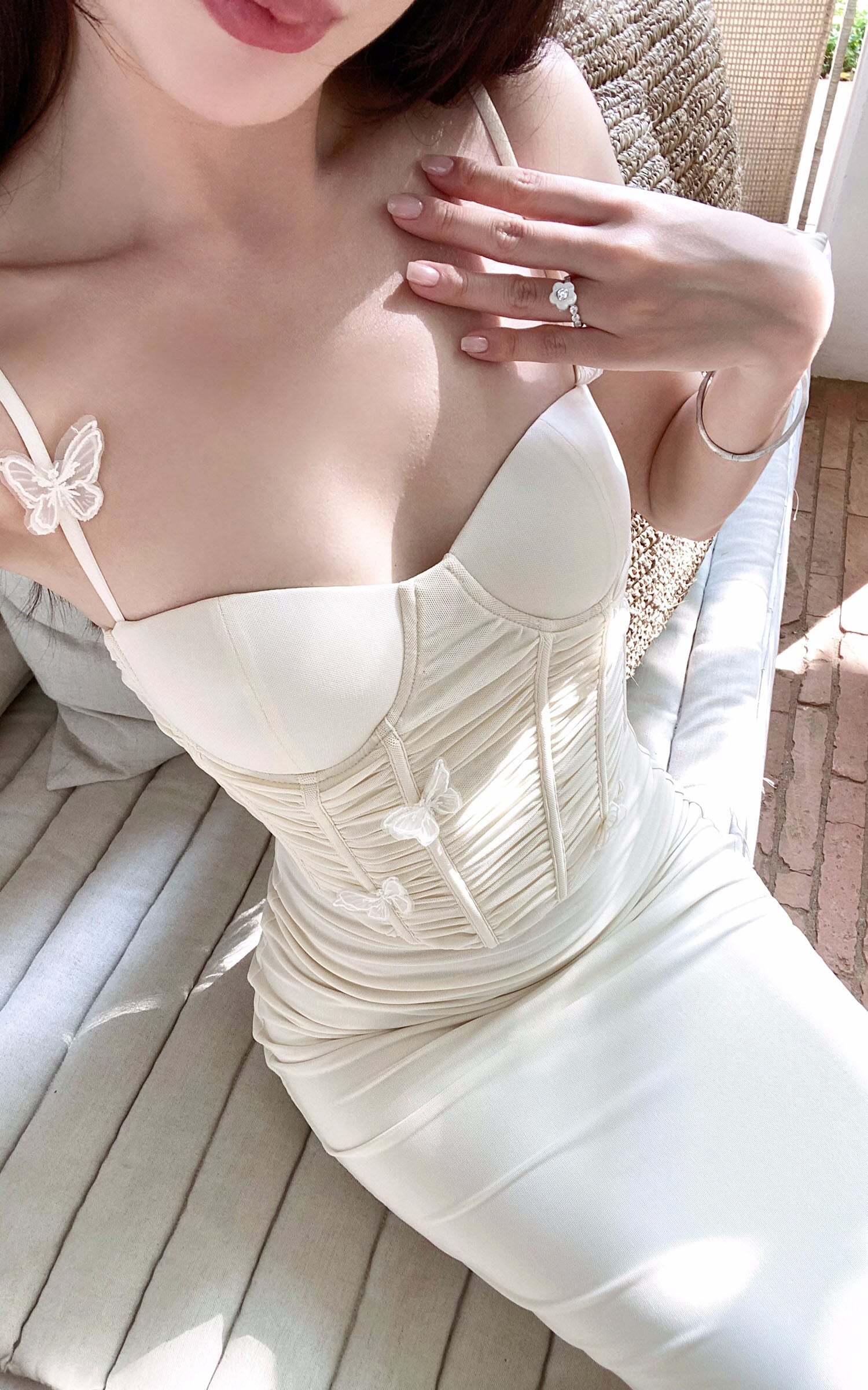 A fairytale silhouette kissed with soft drama. This mesh maxi dress is shaped by a ruched corset bodice adorned with dainty butterfly appliqués that flutter with every move. The molded cups and boning offer subtle structure, while the flared hem adds an effortless grace. Perfect for twilight dinners or garden rendezvous—just add a whisper of perfume and barely-there heels.