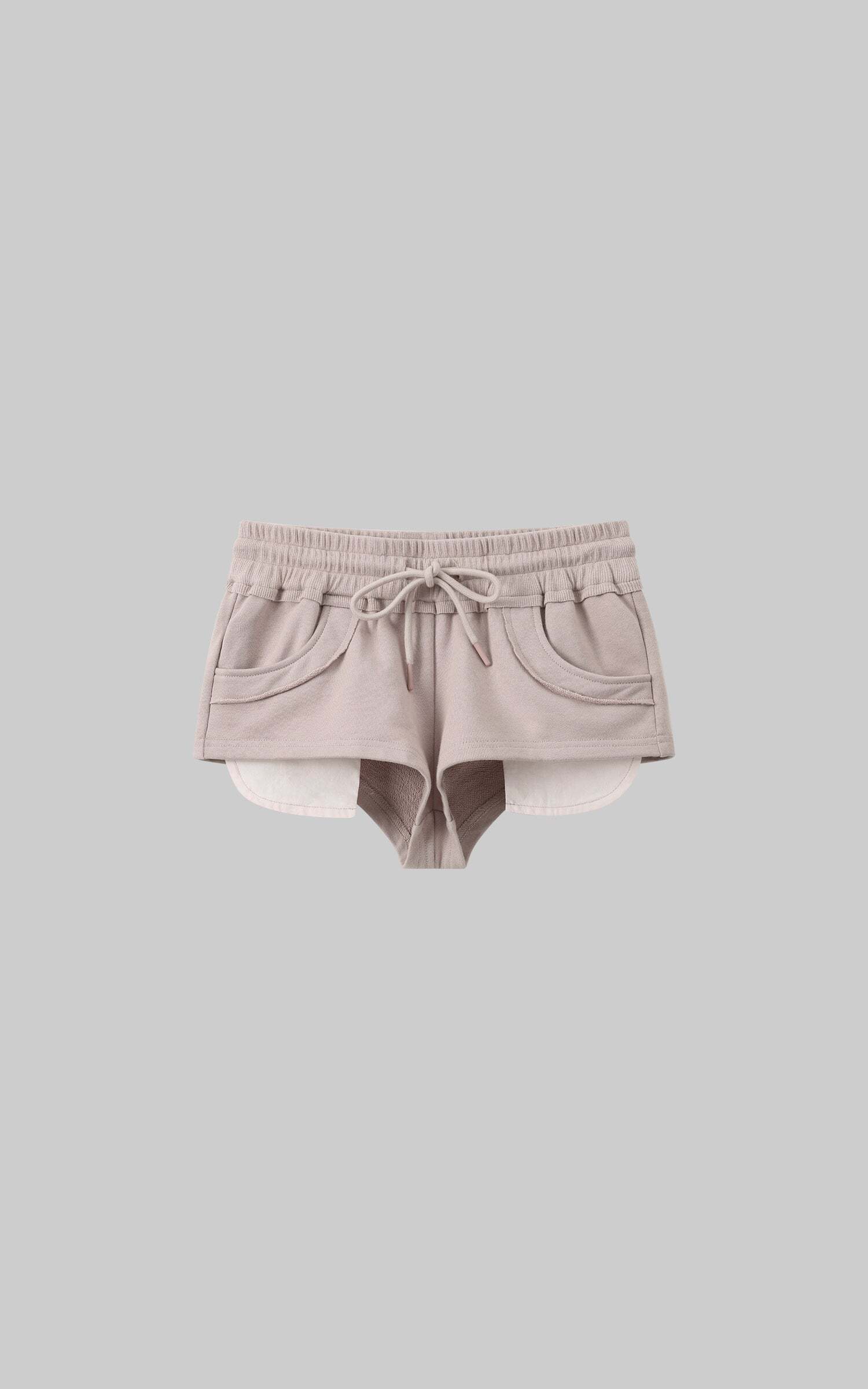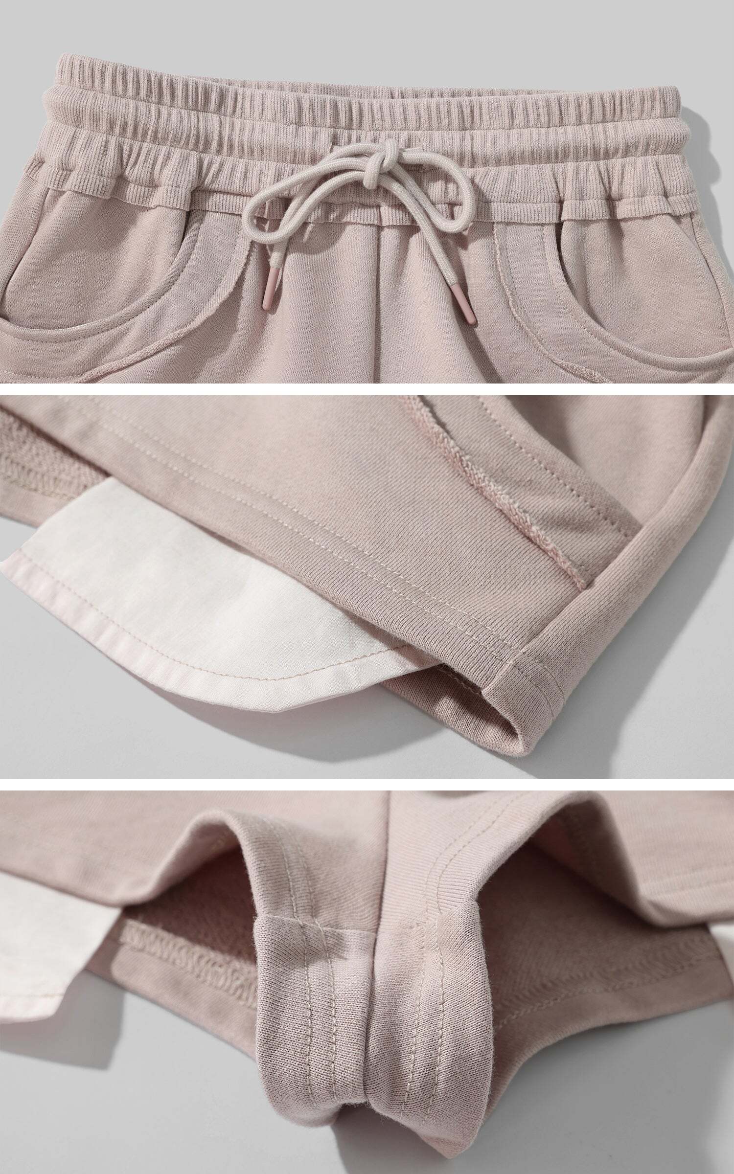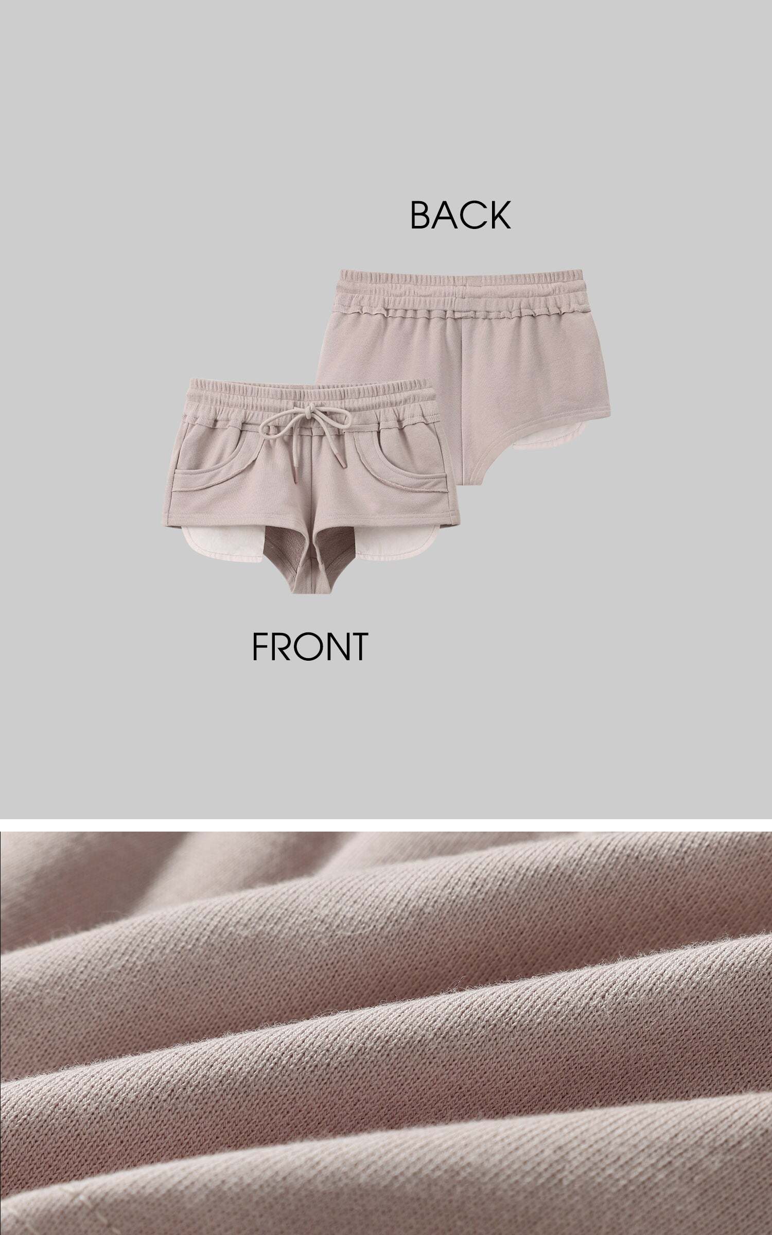 A fresh twist on your go-to lounge staple. These ultra-soft shorts feature a curved hemline trimmed with contrast fabric that subtly peeks out, giving the illusion of layers without the fuss. The mid-rise silhouette flatters with a wide elastic waistband and adjustable drawstring, offering a comfy yet cinched fit. Rounded patch pockets in the front add structure and a touch of utilitarian charm. Perfect for slow mornings, lazy afternoons, or laid-back coffee runs — just throw on a baby tee or bandeau top and you’re effortlessly styled.