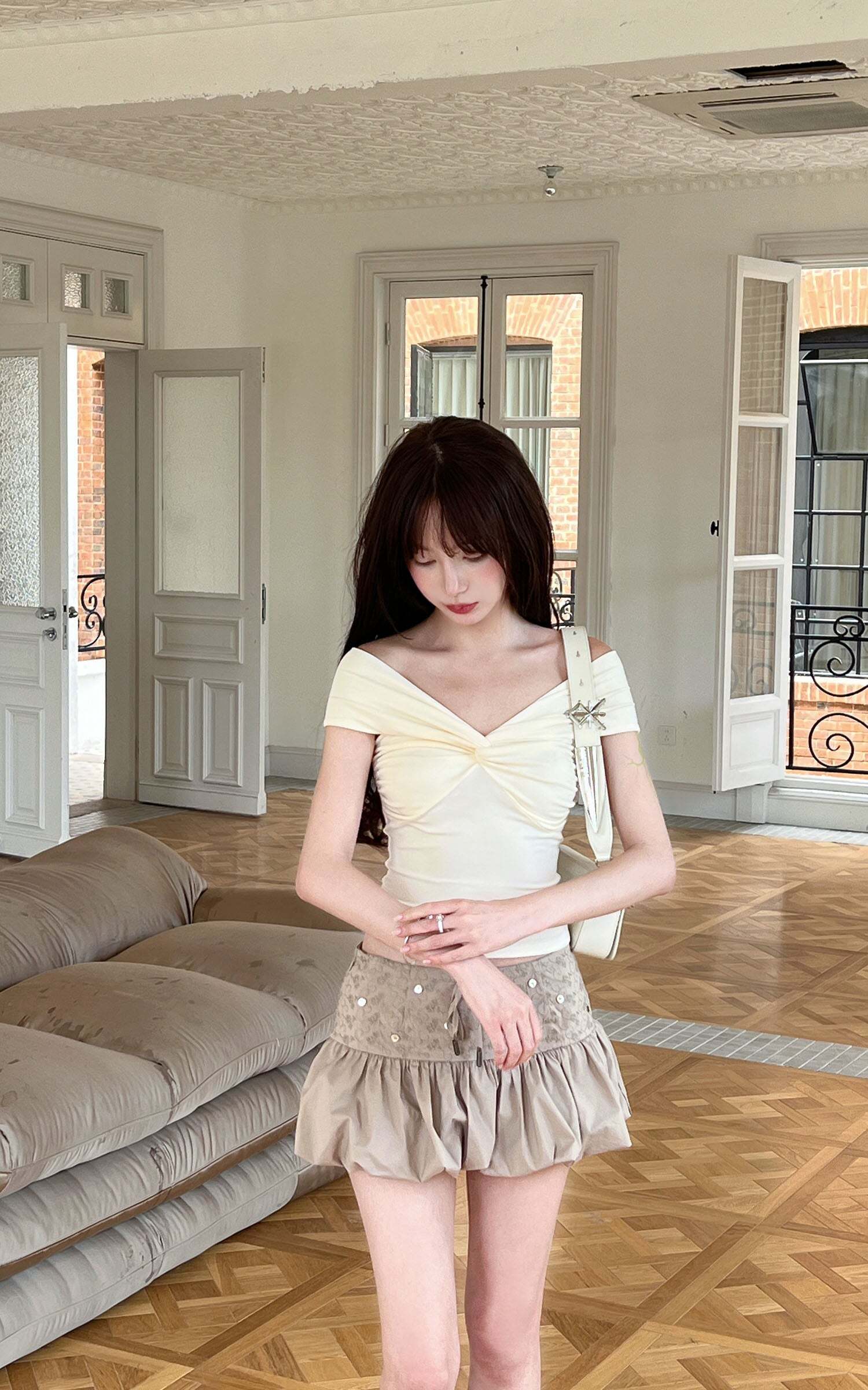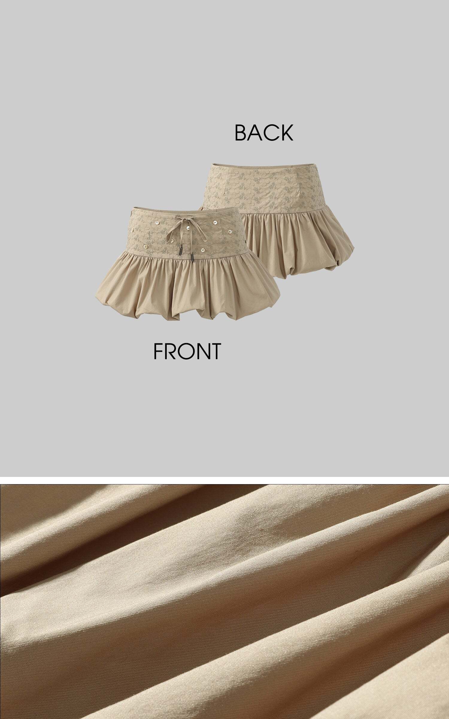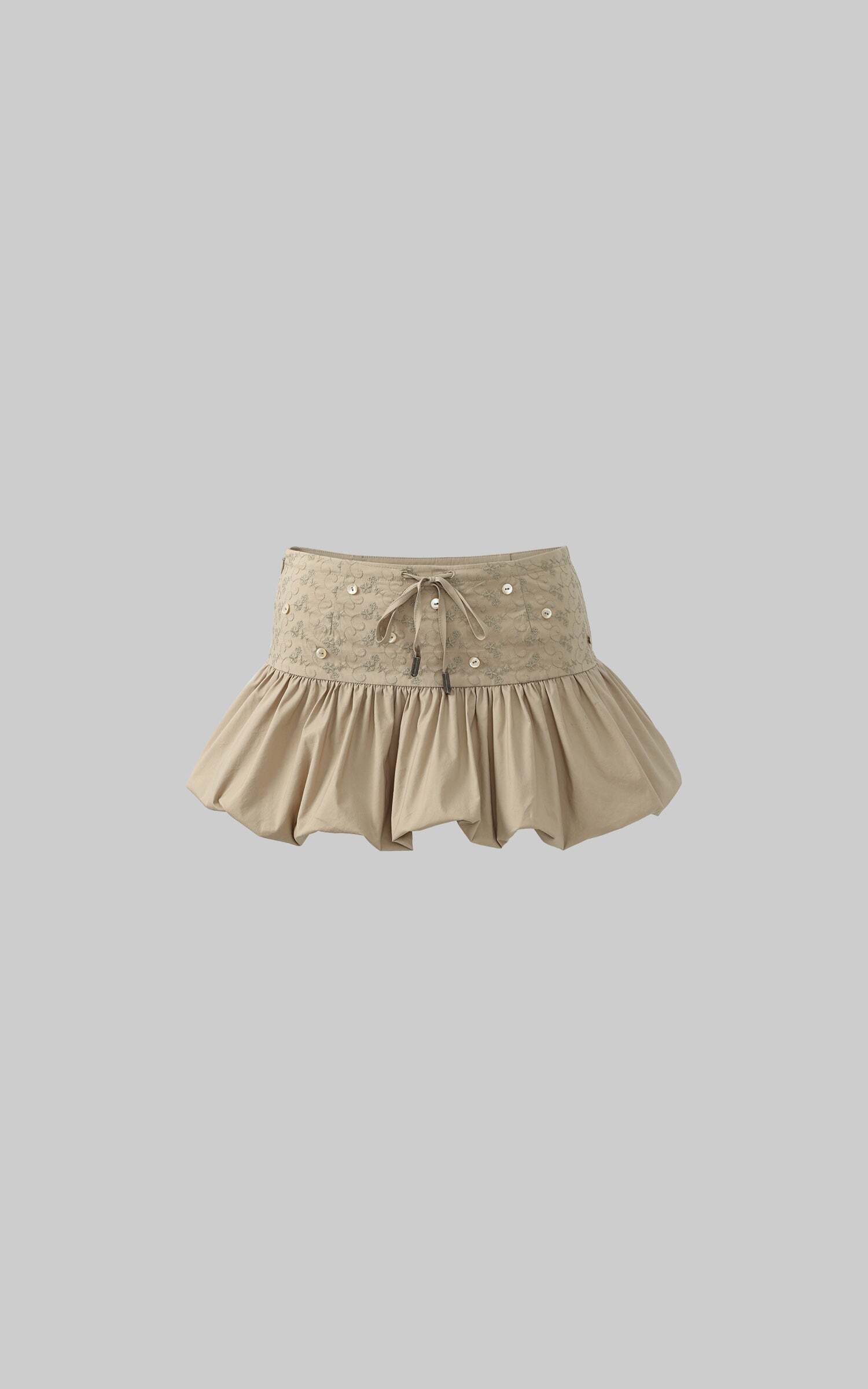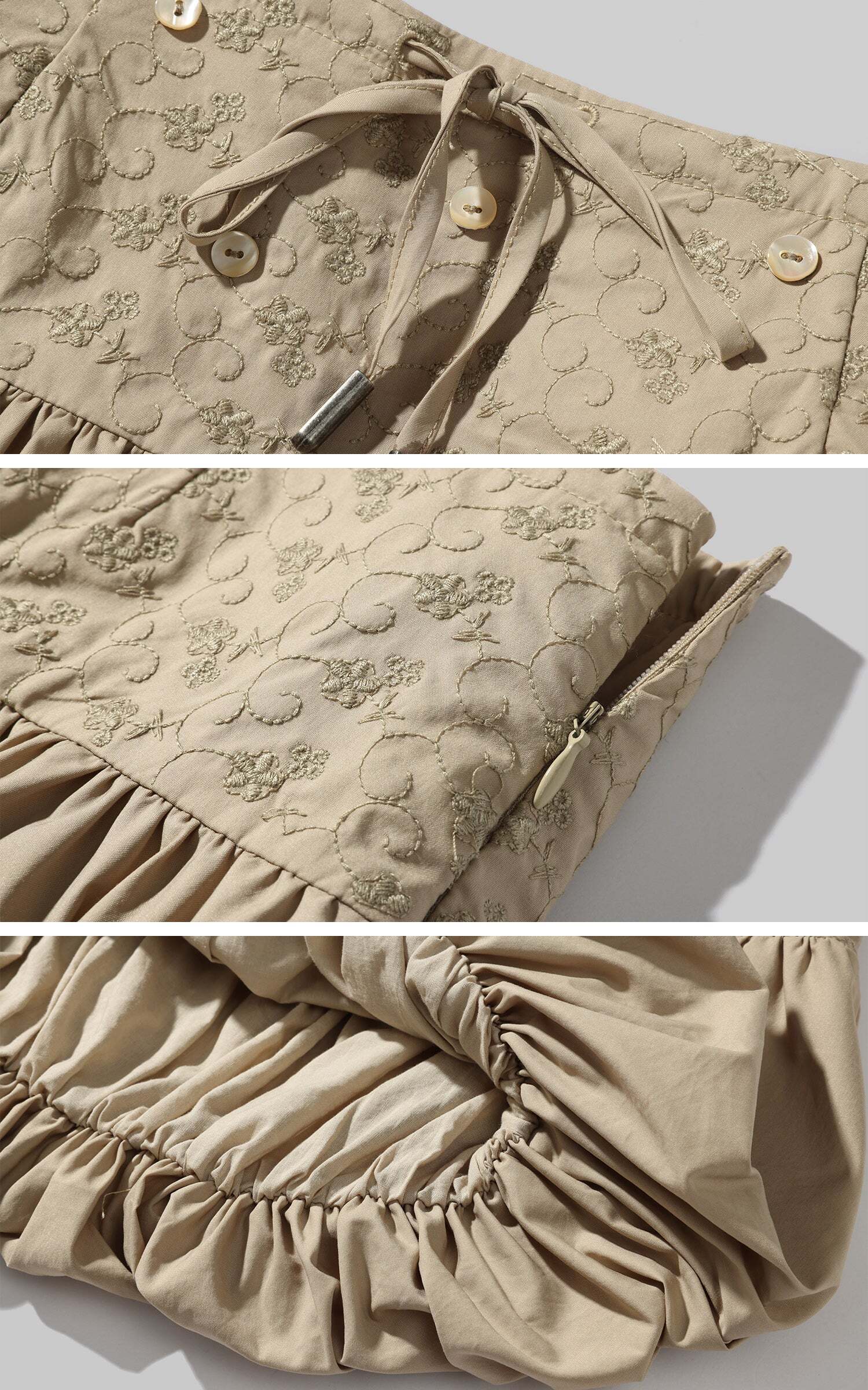 This dreamy mini skirt brings a sweet yet structured twist to your summer wardrobe. The high-waist design features delicate floral embroidery on a structured cotton canvas, contrasted with a voluminous flounced hem that sways with every step. Button accents and a center drawstring add a touch of playful detail, while the hidden side zipper ensures a smooth silhouette. Style it with a ruched off-shoulder top or a lace-trimmed cami for an effortlessly romantic look.