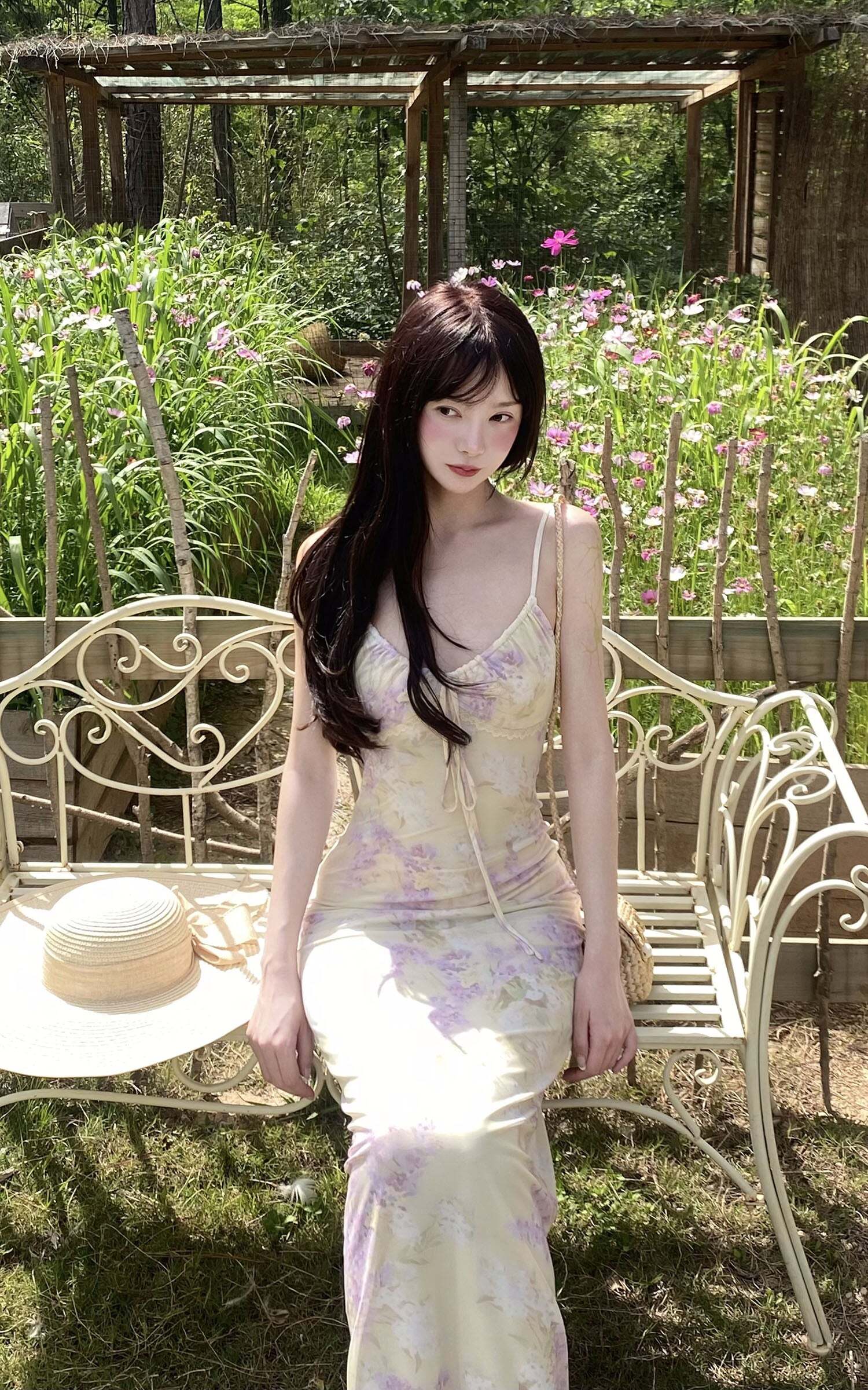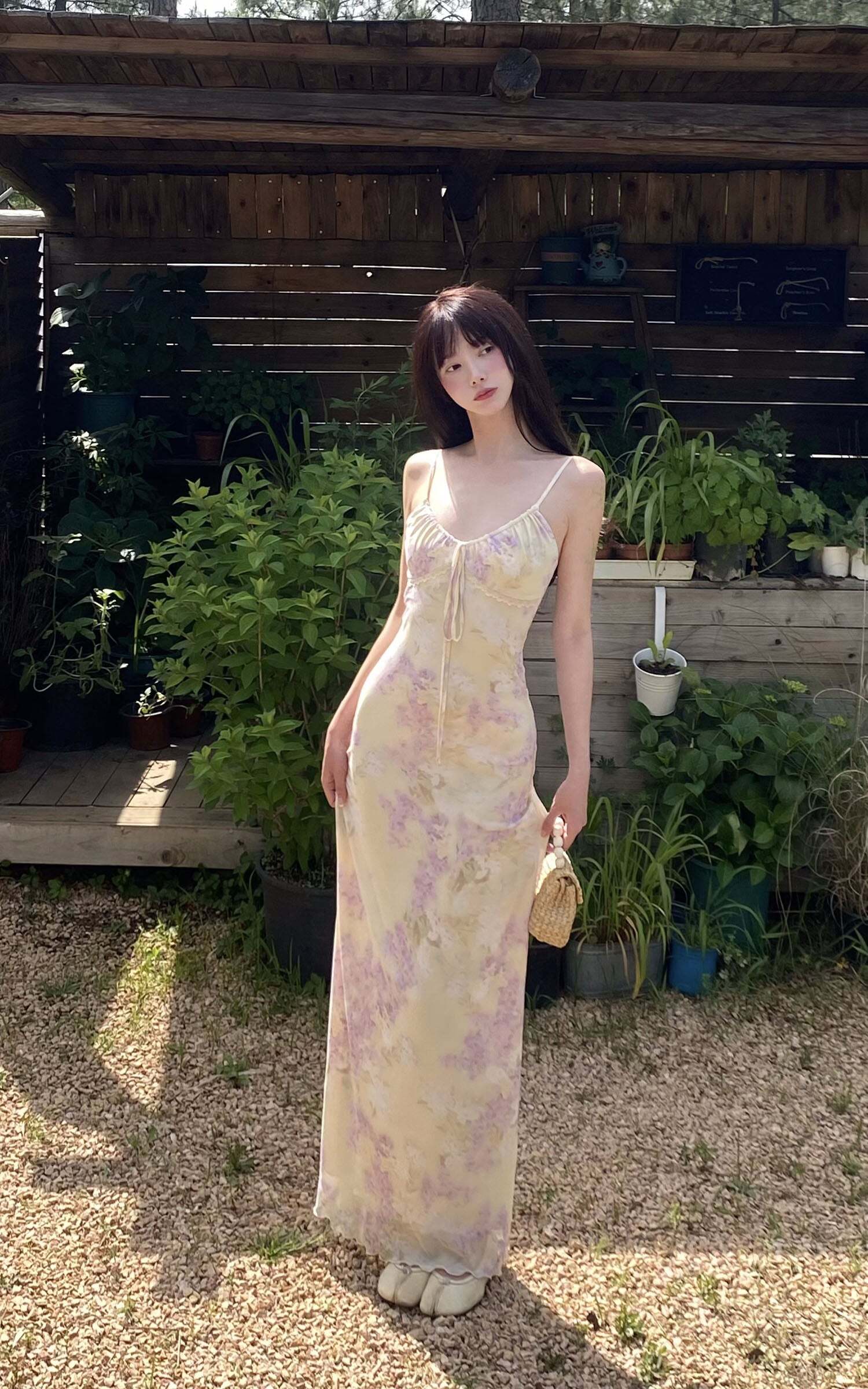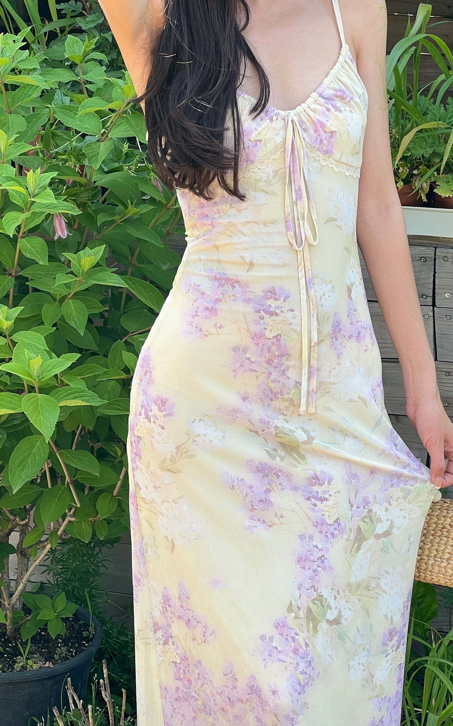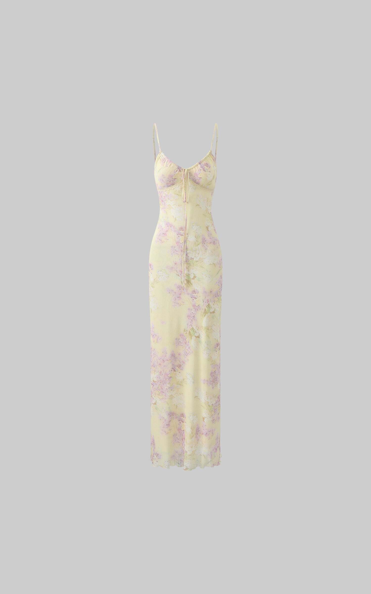 Sun-soaked and kissed with florals, this soft mesh maxi dress is your ticket to garden romance. Designed with delicate adjustable straps, a softly ruched bust, and an ultra-flattering body-skimming fit, it cascades down to a sheer hem that floats as you walk. A drawstring bow detail adds a whisper of charm, while the dainty lace trim kisses the neckline for a vintage touch. Pair with ballet flats and sun-dappled memories.