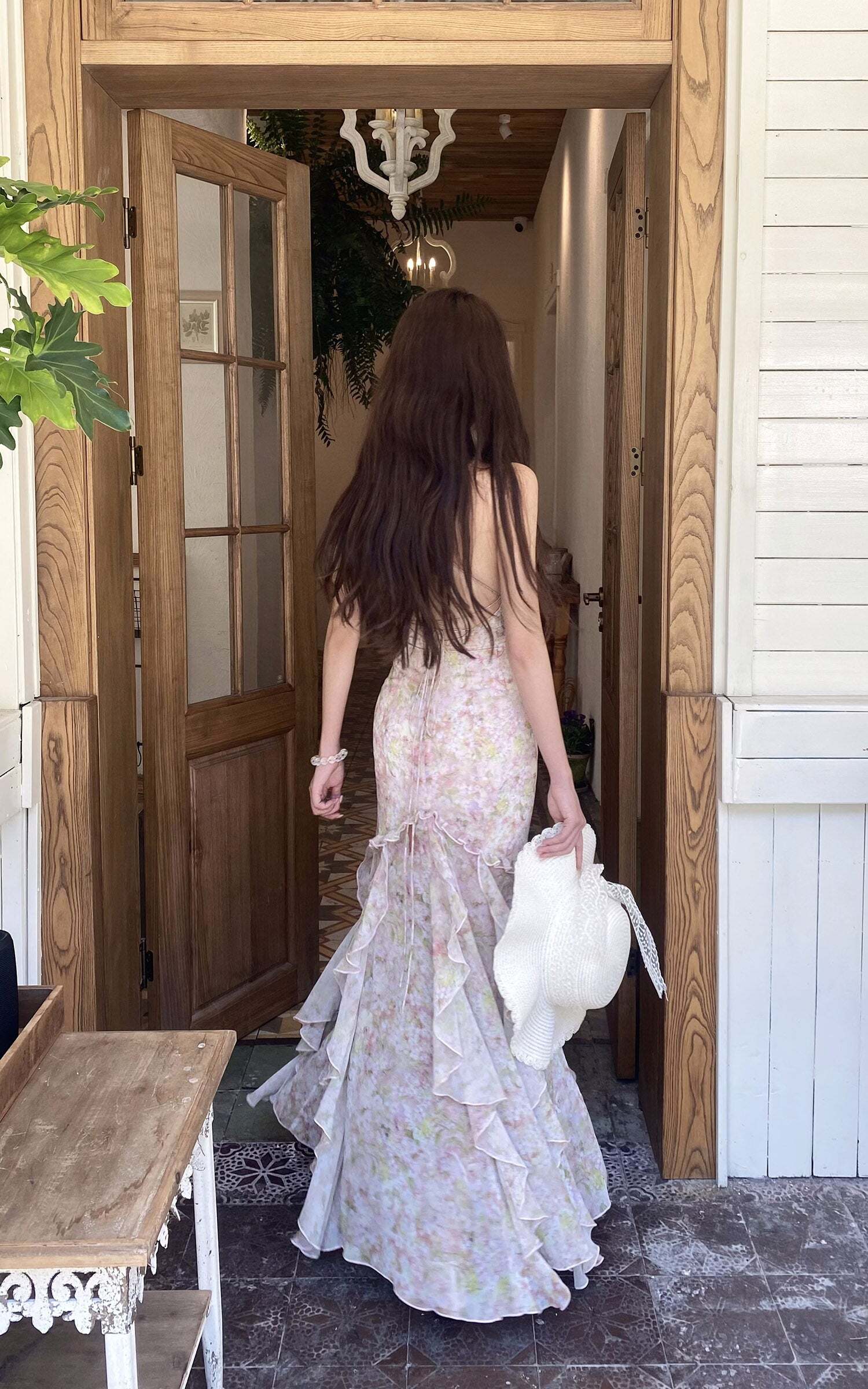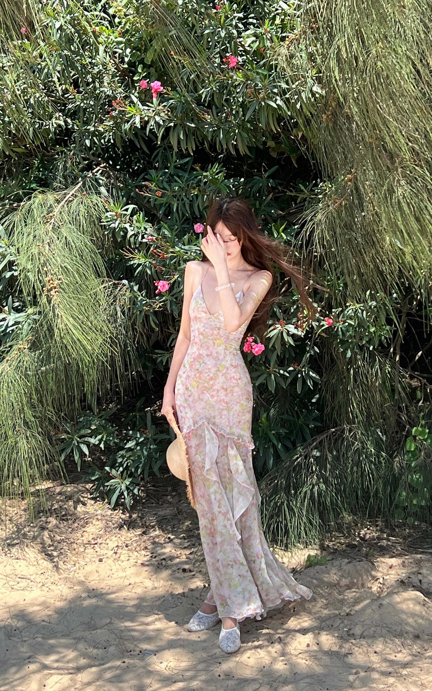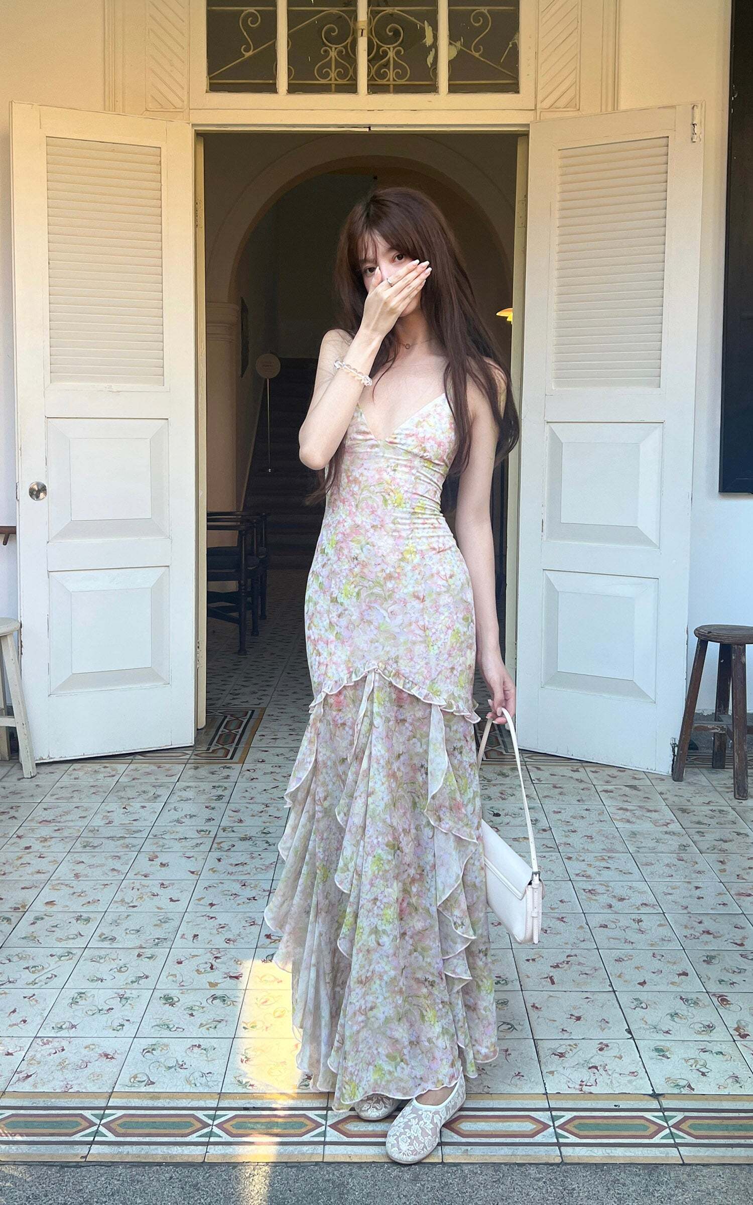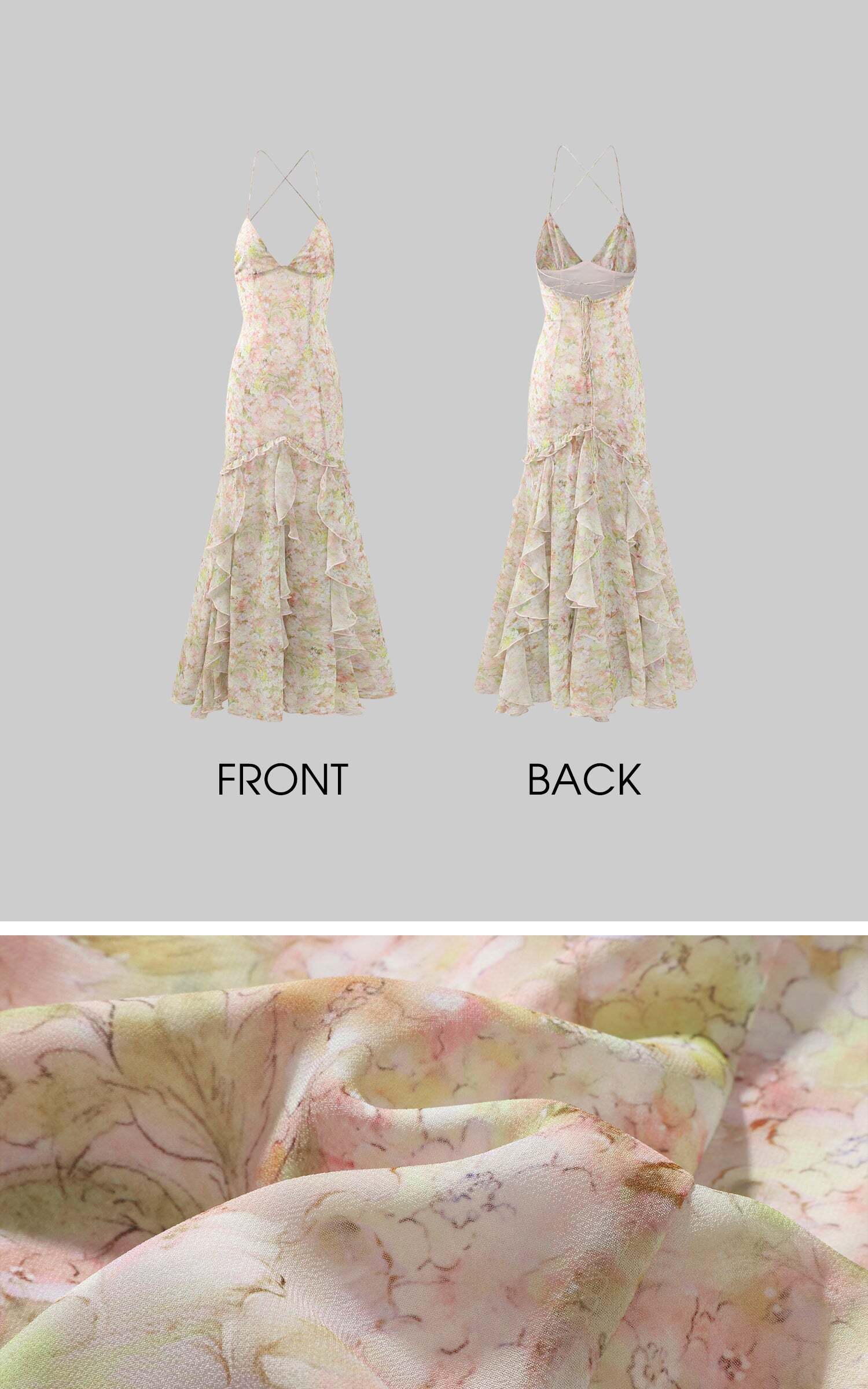 Delicate and dreamlike—this floral maxi dress is cut from a sheer, airy chiffon that drapes effortlessly along the figure. The deep V neckline and gathered bust flatter the upper body, while cascading ruffles create a mermaid hem that flows with every step. Barely-there straps crisscross at the back, revealing just the right amount of skin for sunlit afternoons. Perfect for garden picnics, beach dates, or twirling through a hidden alleyway café.