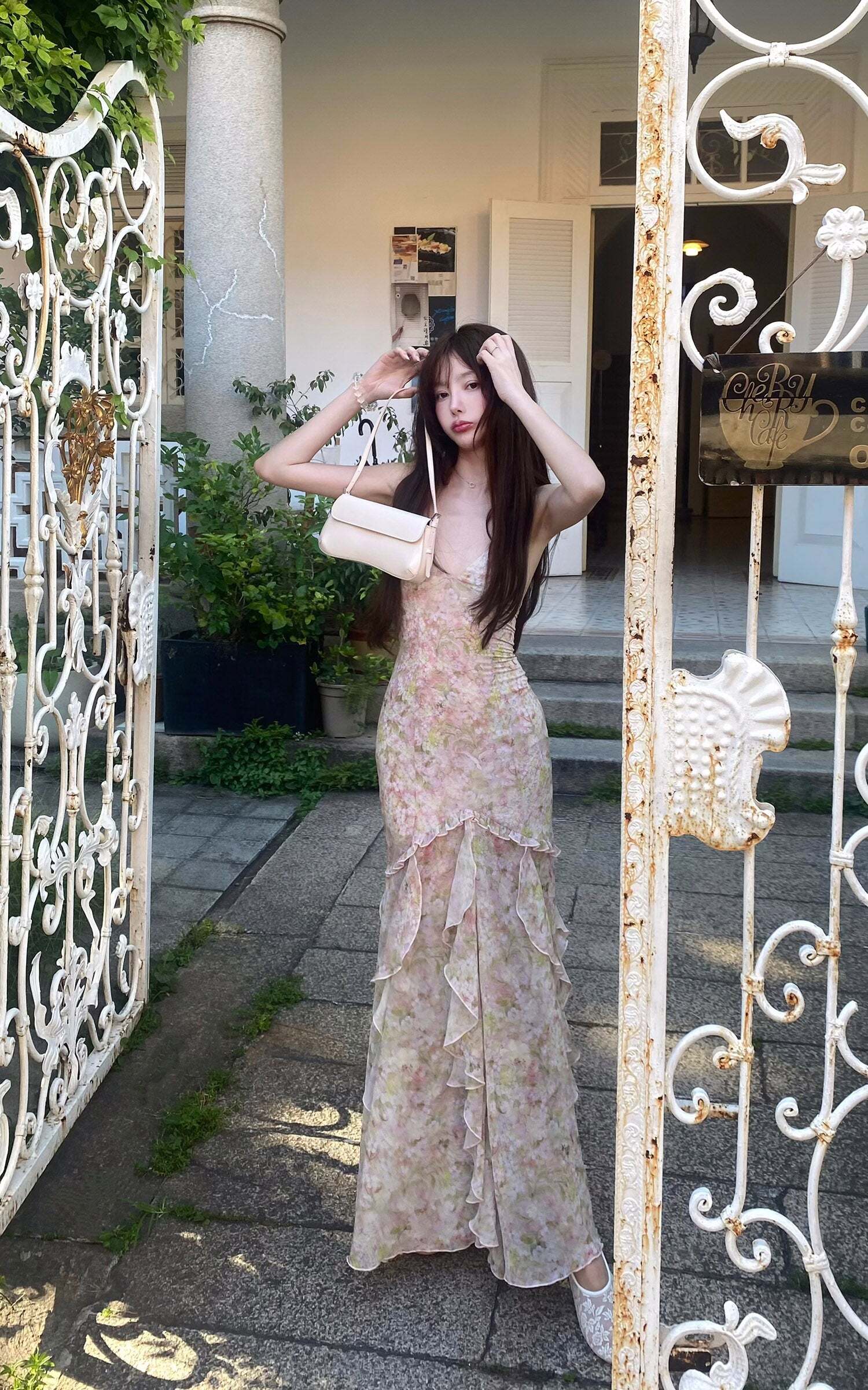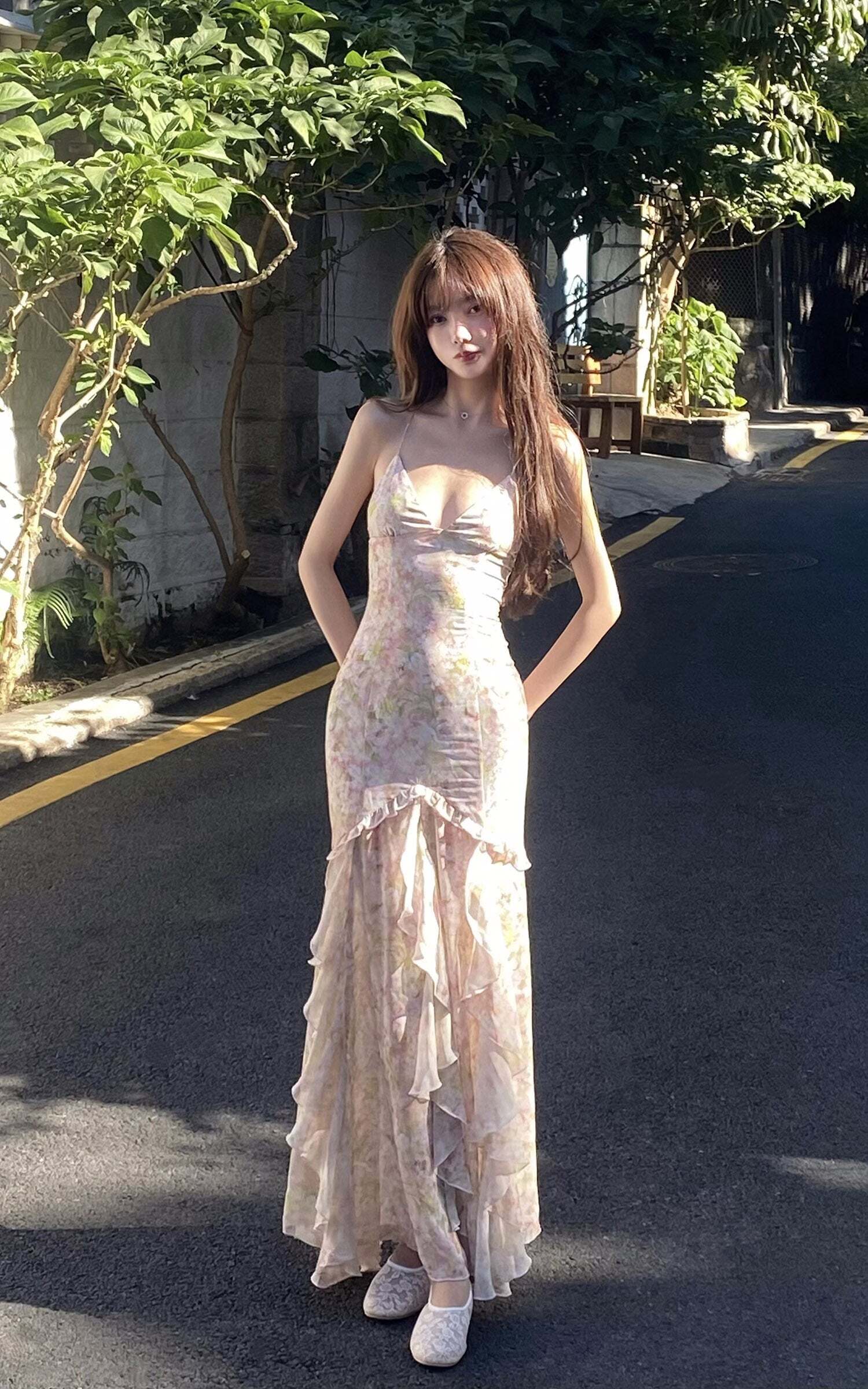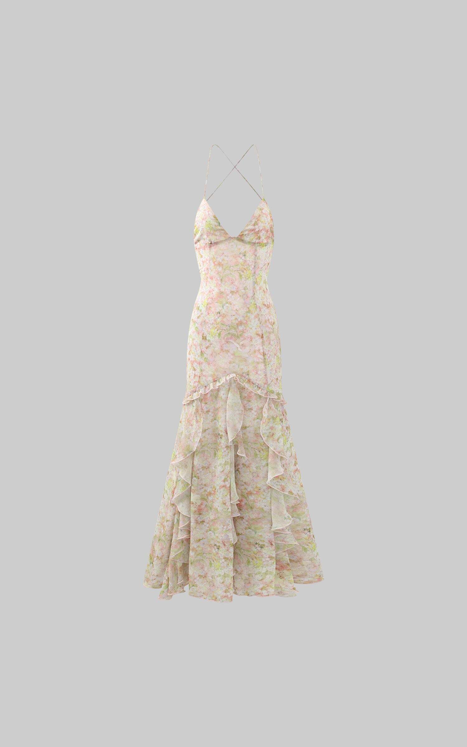 Delicate and dreamlike—this floral maxi dress is cut from a sheer, airy chiffon that drapes effortlessly along the figure. The deep V neckline and gathered bust flatter the upper body, while cascading ruffles create a mermaid hem that flows with every step. Barely-there straps crisscross at the back, revealing just the right amount of skin for sunlit afternoons. Perfect for garden picnics, beach dates, or twirling through a hidden alleyway café.