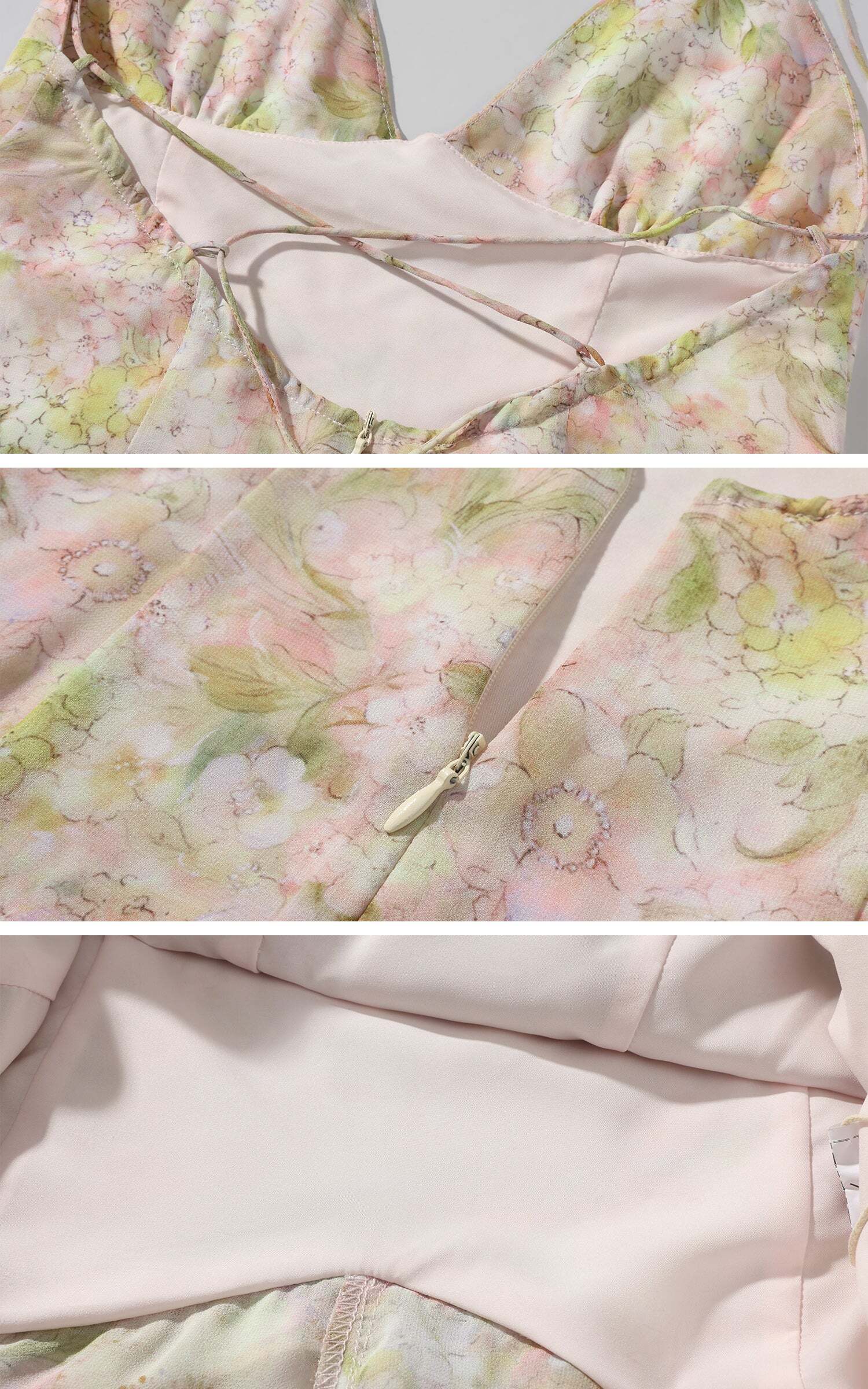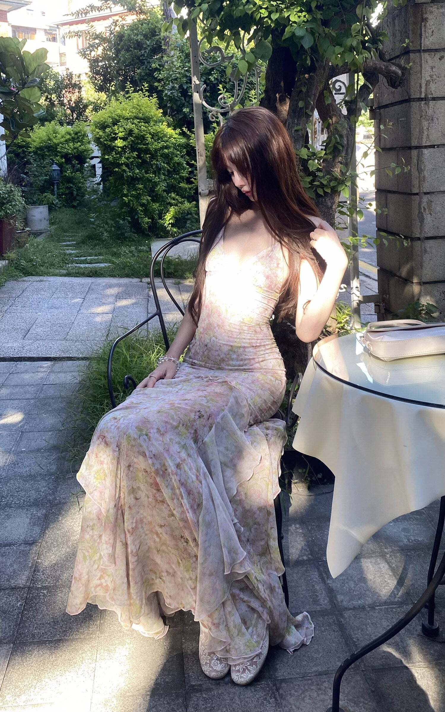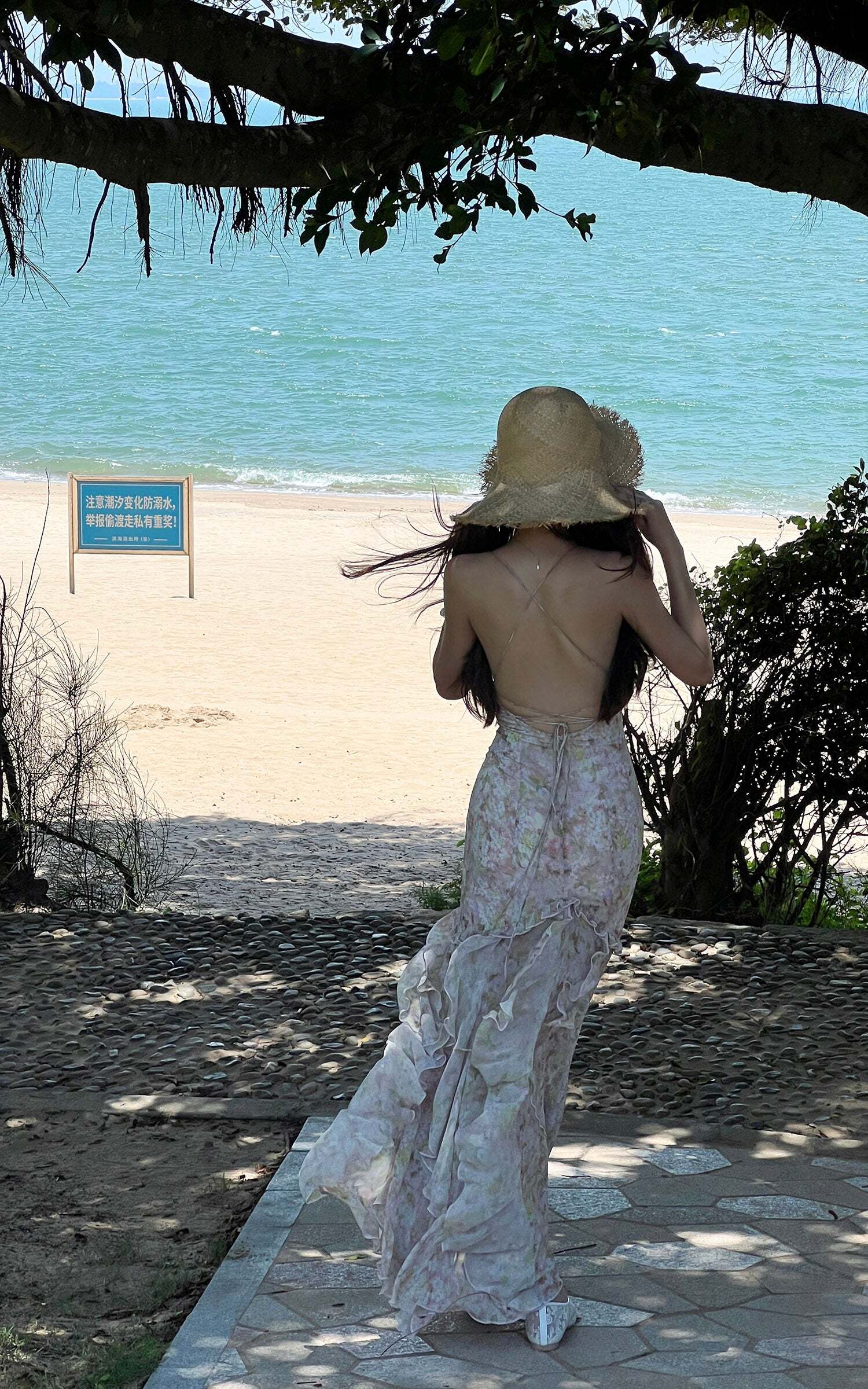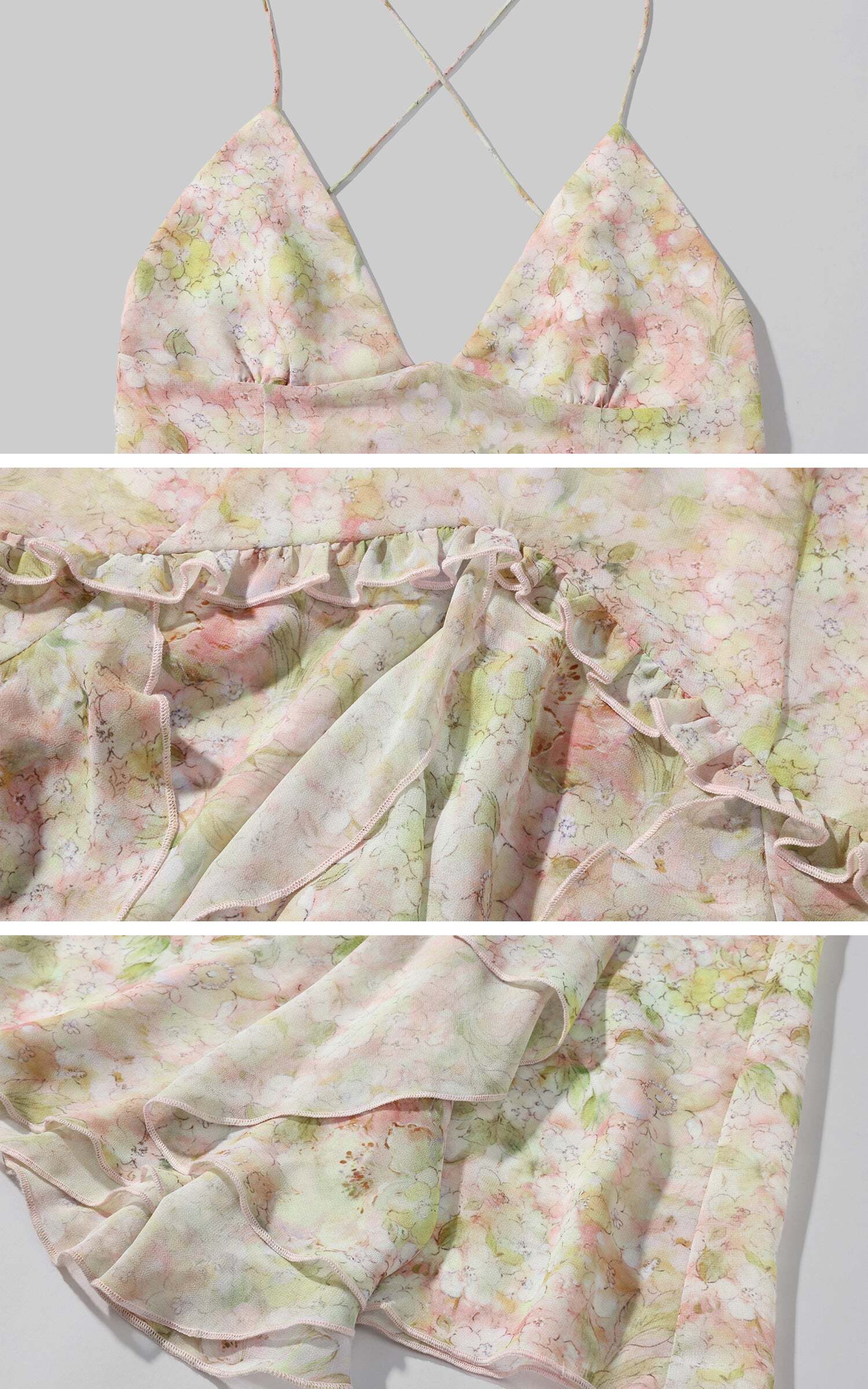 Delicate and dreamlike—this floral maxi dress is cut from a sheer, airy chiffon that drapes effortlessly along the figure. The deep V neckline and gathered bust flatter the upper body, while cascading ruffles create a mermaid hem that flows with every step. Barely-there straps crisscross at the back, revealing just the right amount of skin for sunlit afternoons. Perfect for garden picnics, beach dates, or twirling through a hidden alleyway café.