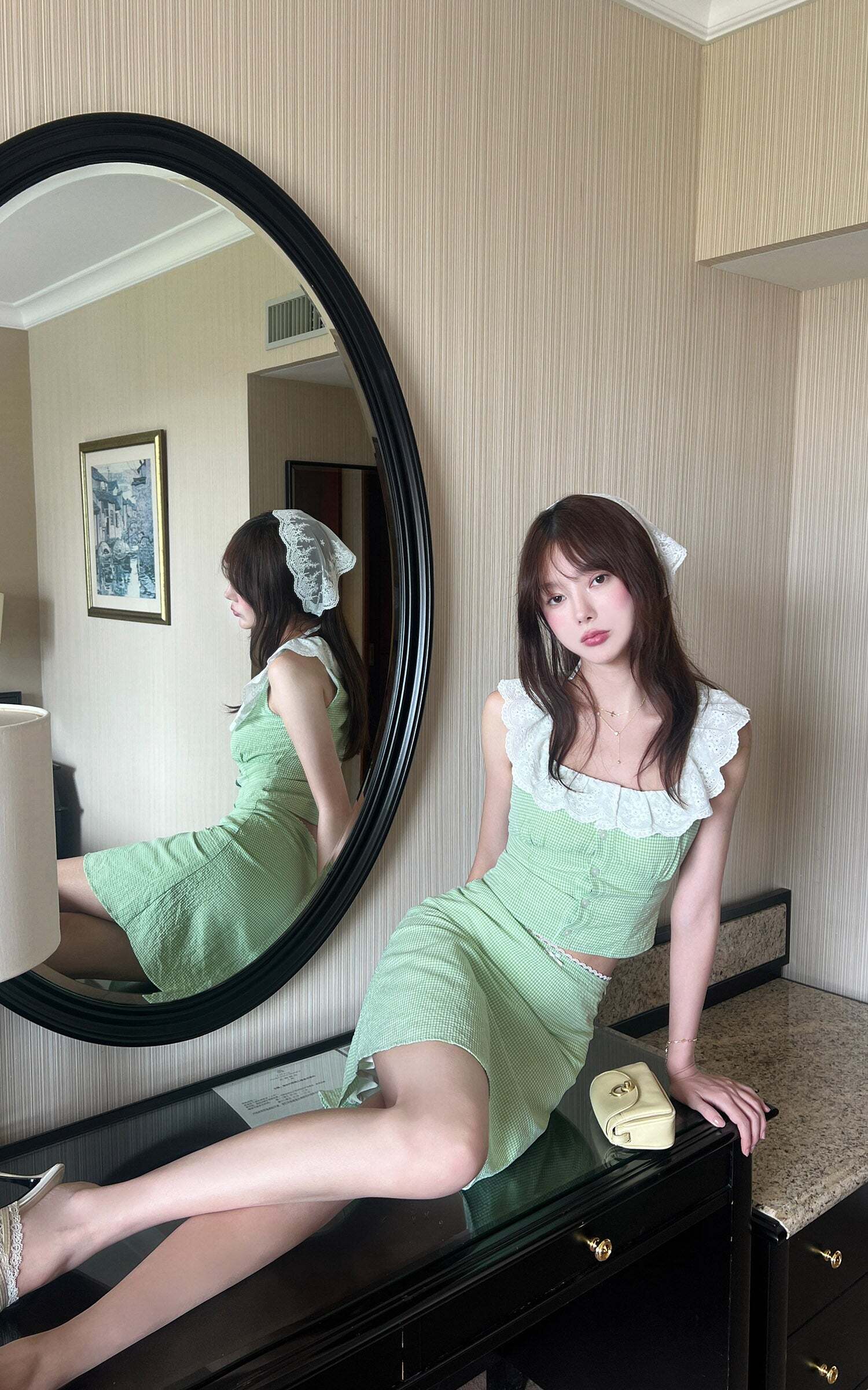 Playful yet polished—this gingham co-ord set pairs a lace-trimmed square neck top with a high-rise mini skirt for a look that’s equal parts charming and sun-drenched. The sleeveless blouse features an embroidered eyelet ruffle neckline and dainty buttons down the front, while the skirt sits snugly with a soft A-line flare, detailed with a tiny bow and side zip. Crafted in a breezy cotton blend with full lining, it’s made for fountain-side daydreams and romantic café escapes.