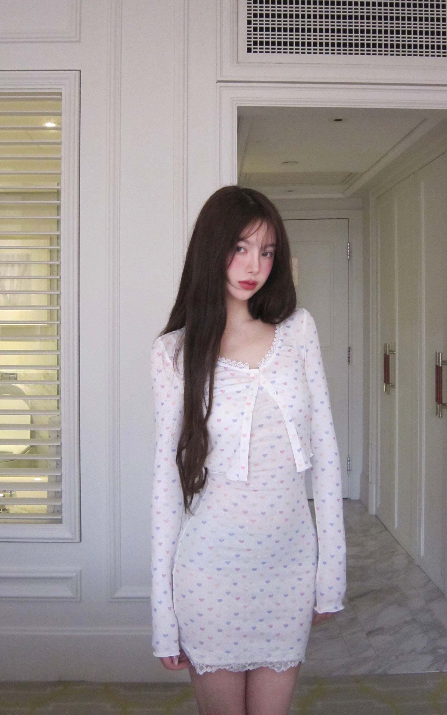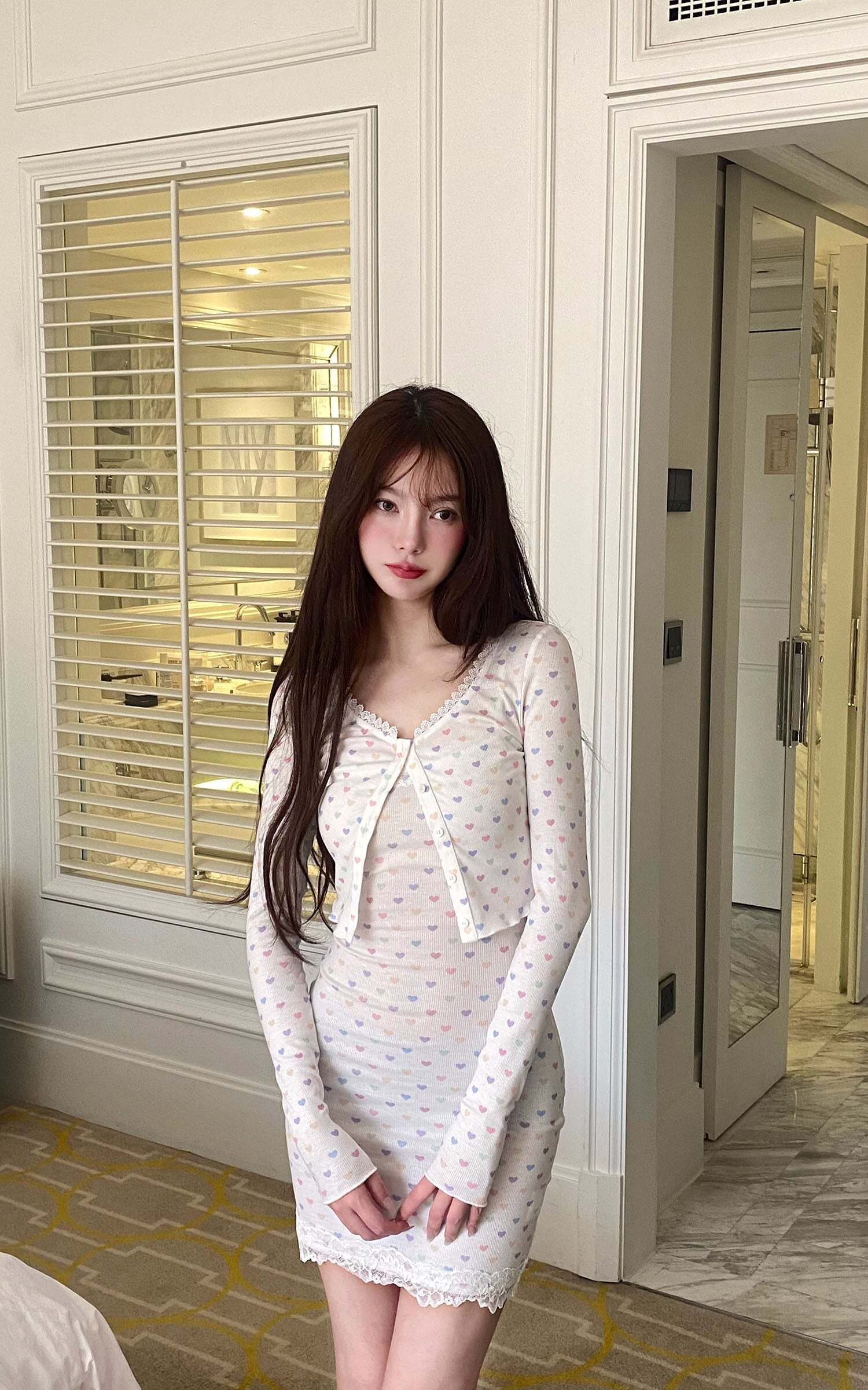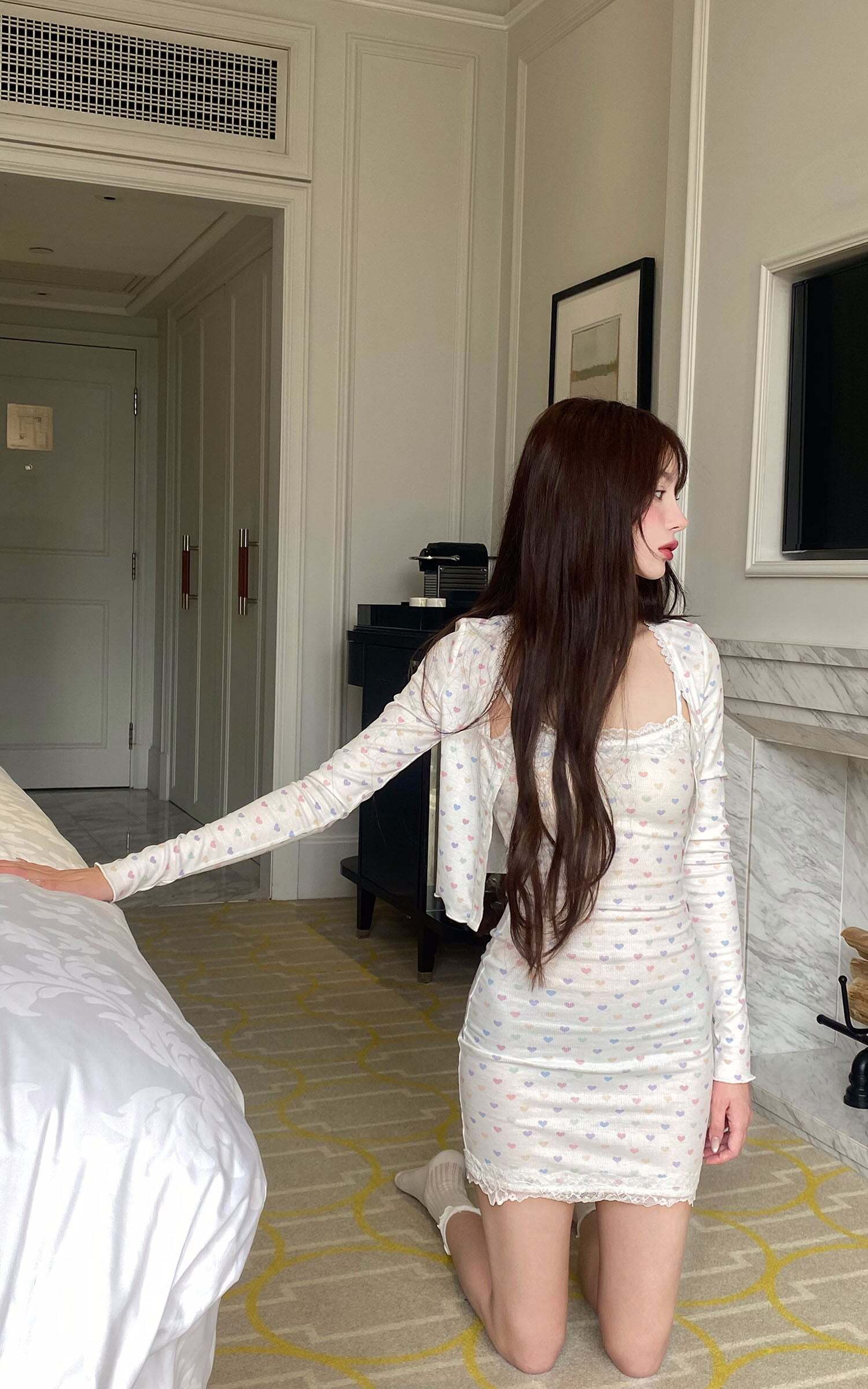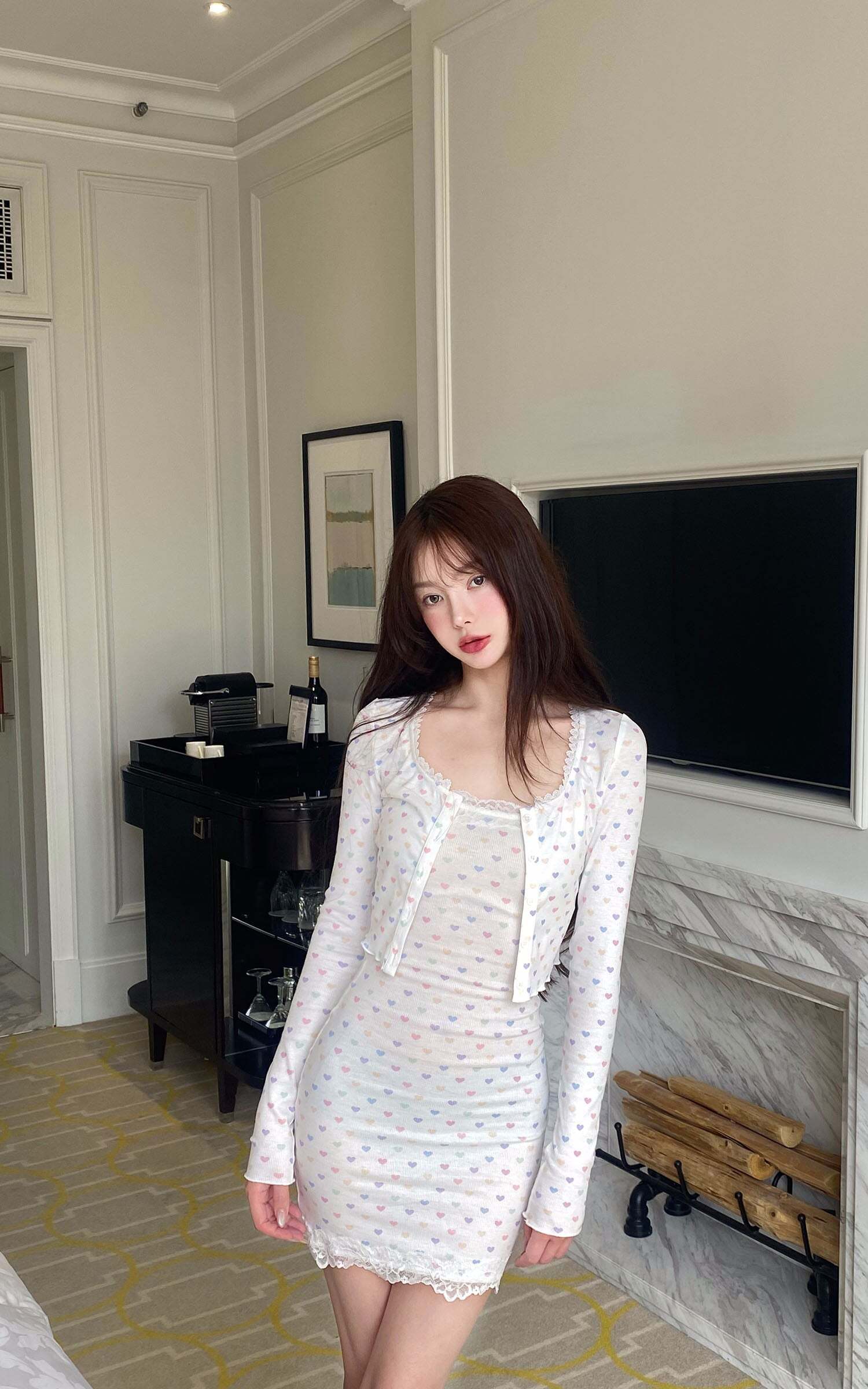 A darling set that feels like a secret love note tucked between pages. The fitted camisole dress traces soft curves with delicate lace trimming, while the cropped cardigan adds just the right dose of sweetness. Whether you’re out for a slow afternoon or curled up indoors, it’s the kind of look that turns an ordinary day into something tender and dreamy.