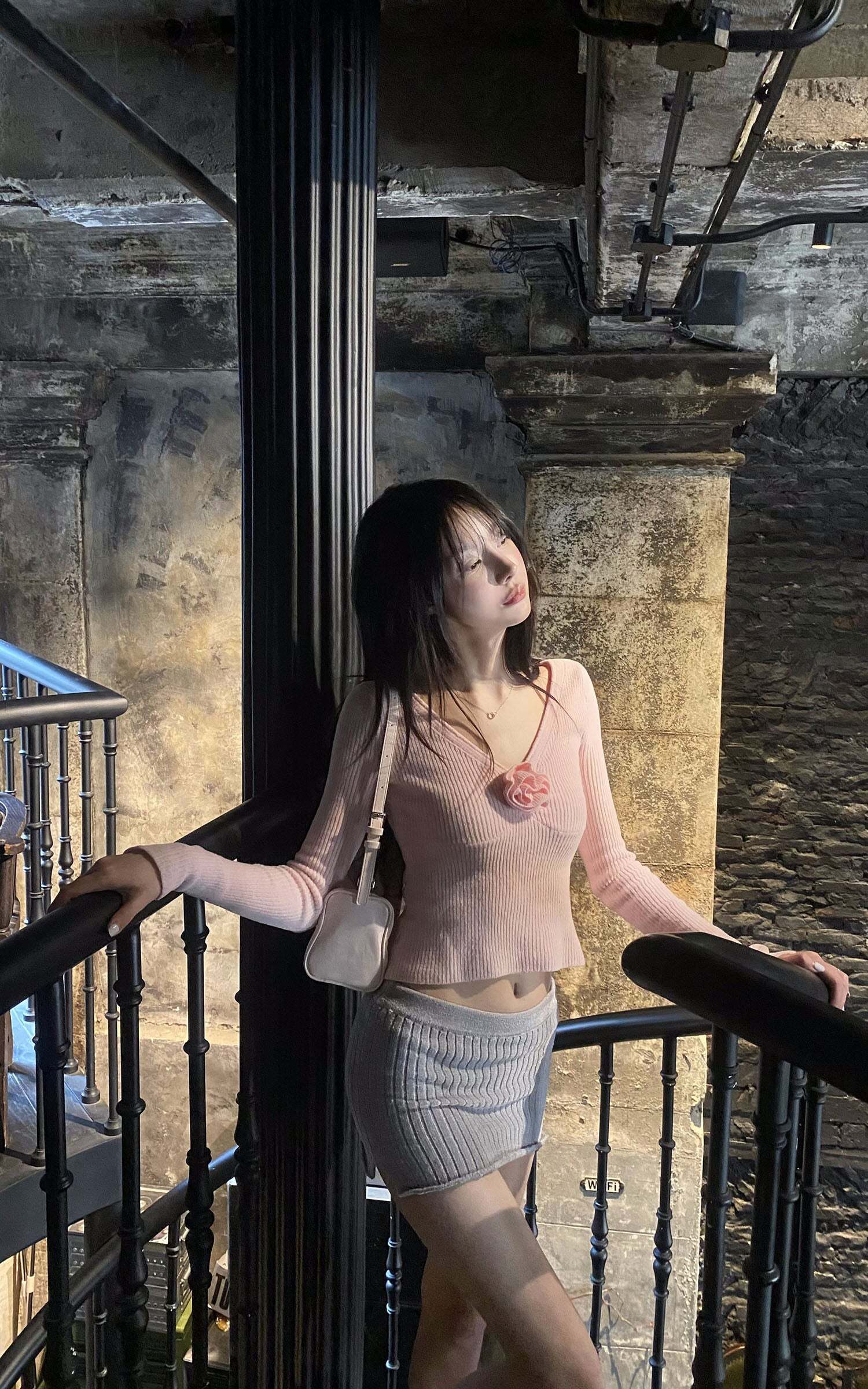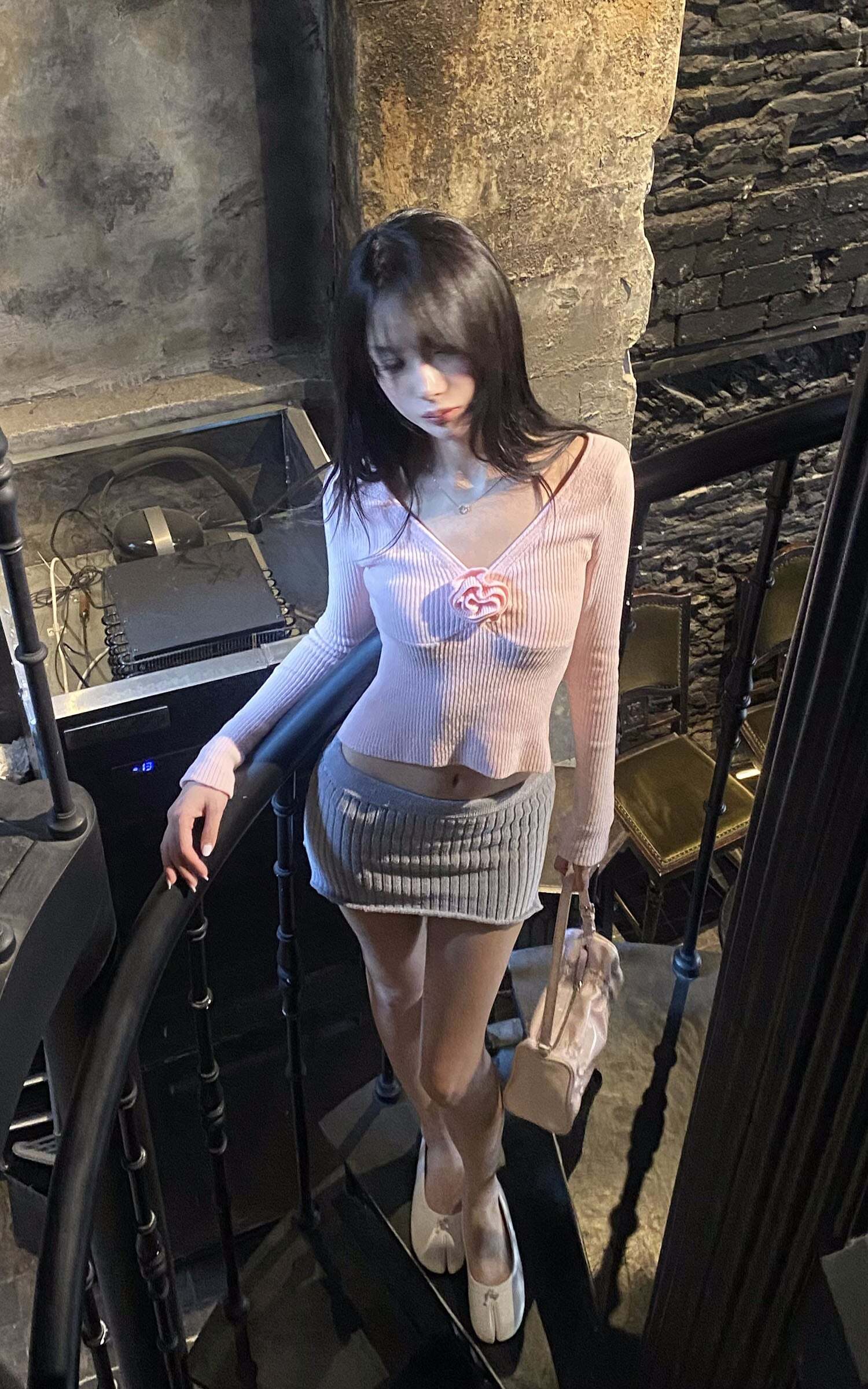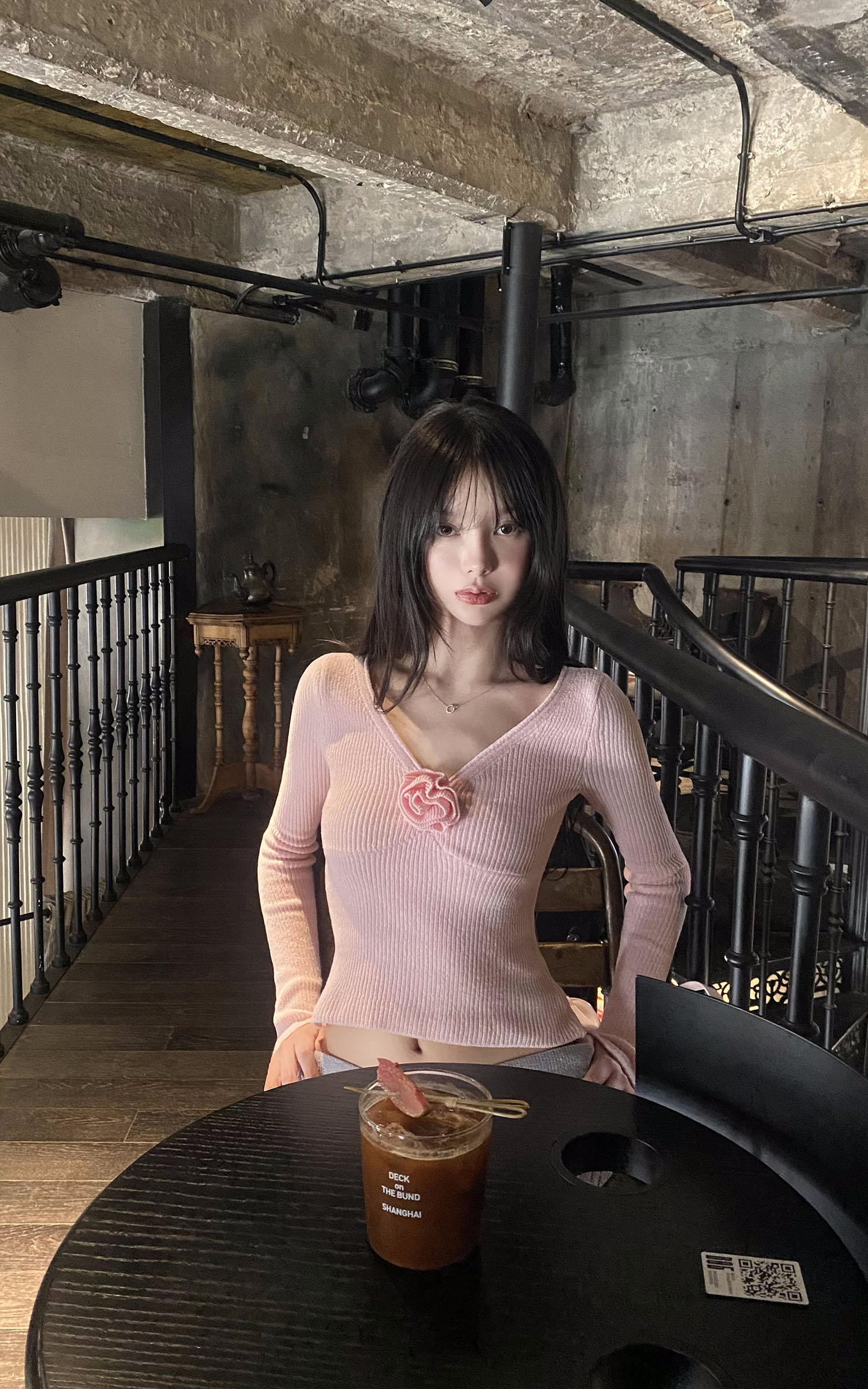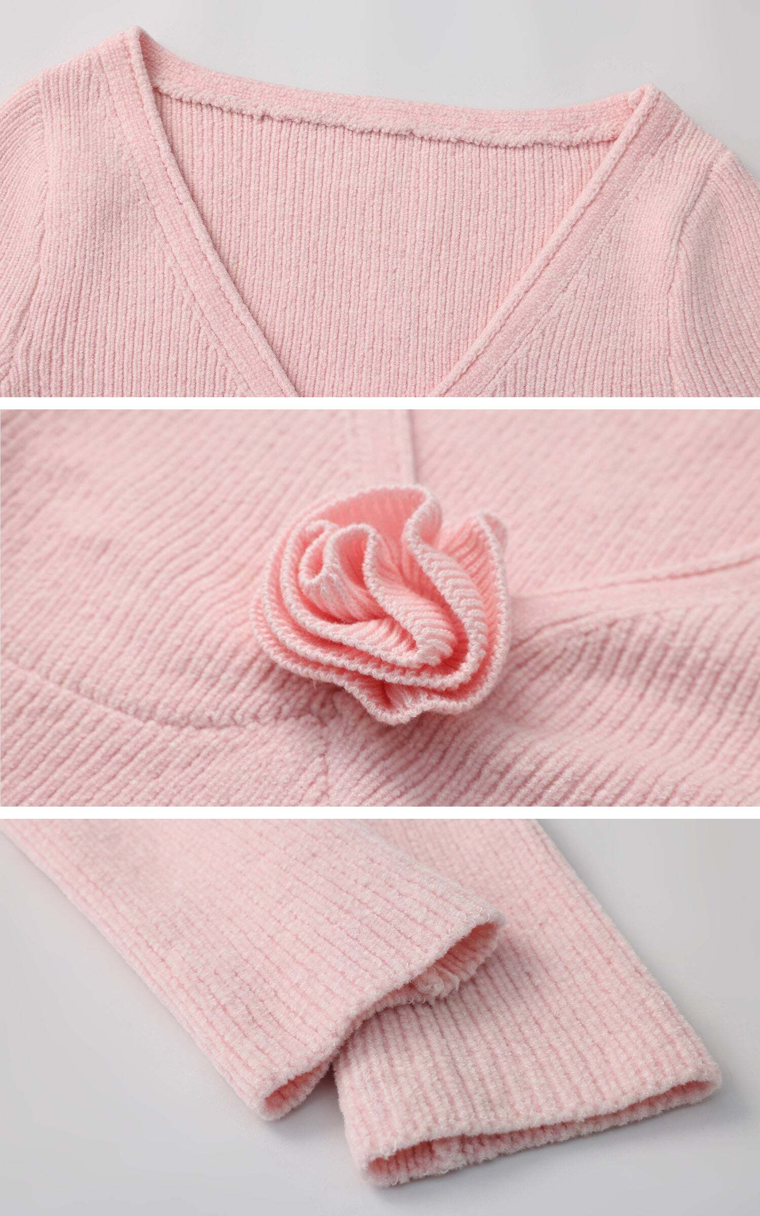 Soft to the touch, sweet to the soul.This ribbed knit top hugs you in all the right places with a subtle stretch and a flattering V neckline. The hand-crafted rose detail blooming at the chest adds a flirty, vintage-inspired twist. Its soft pastel pink shade evokes early spring mornings and cafe rendezvous, making it the perfect piece to pair with anything high-waisted—from pleated skirts to denim shorts.