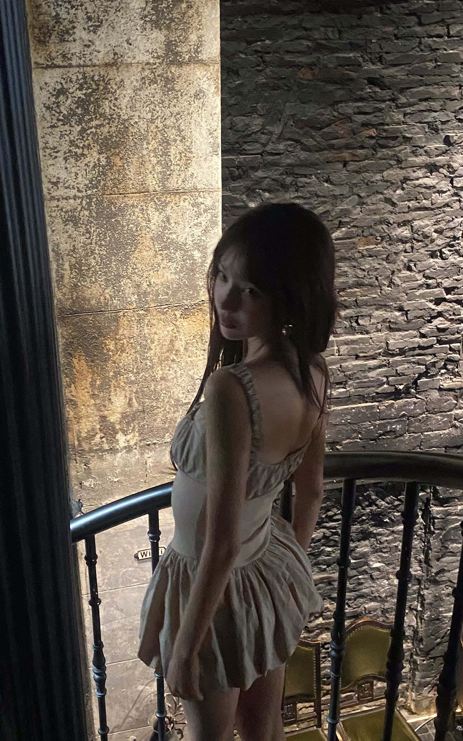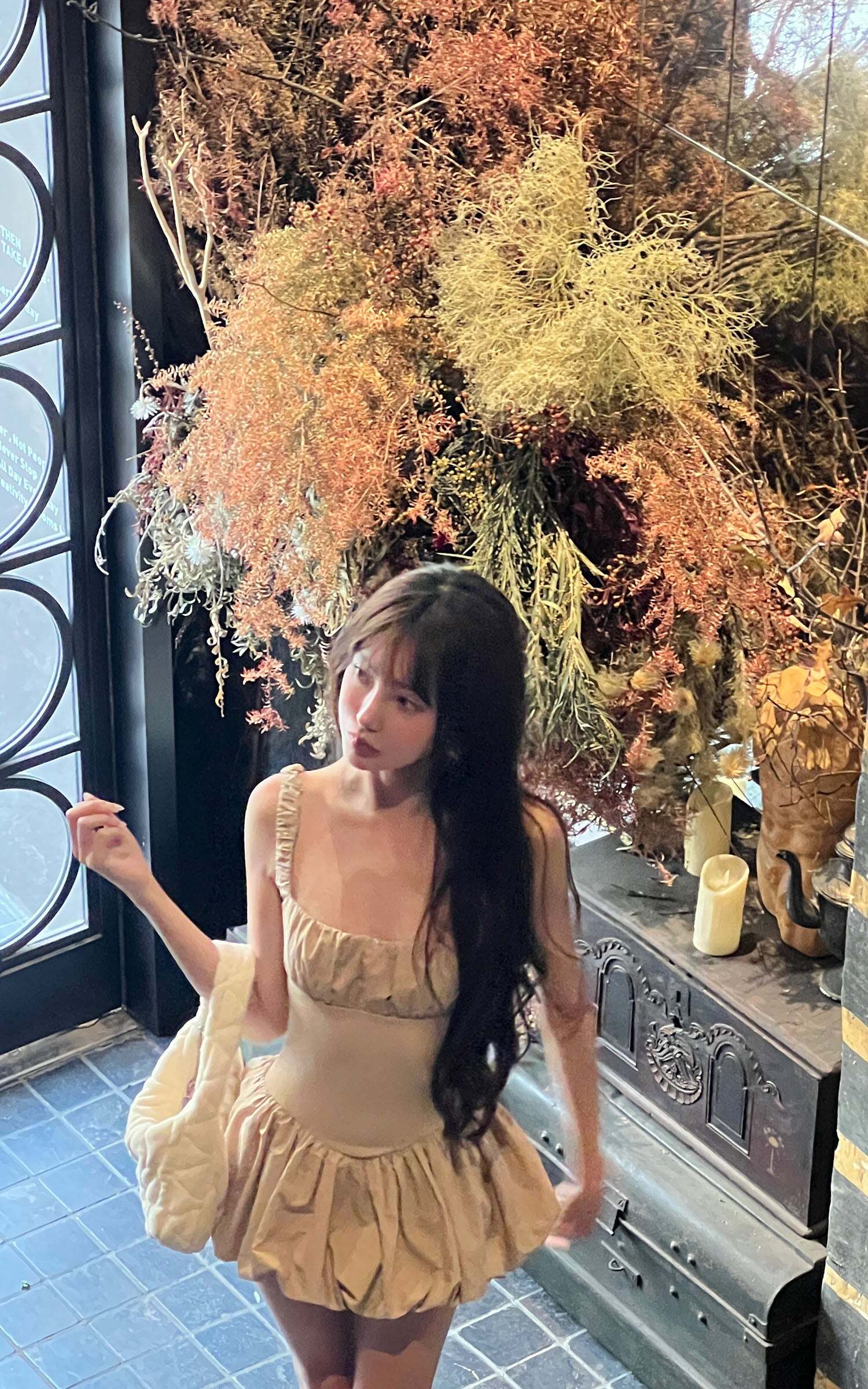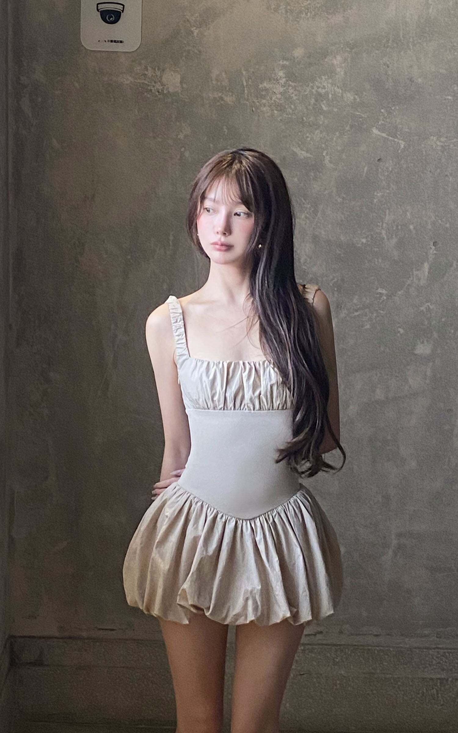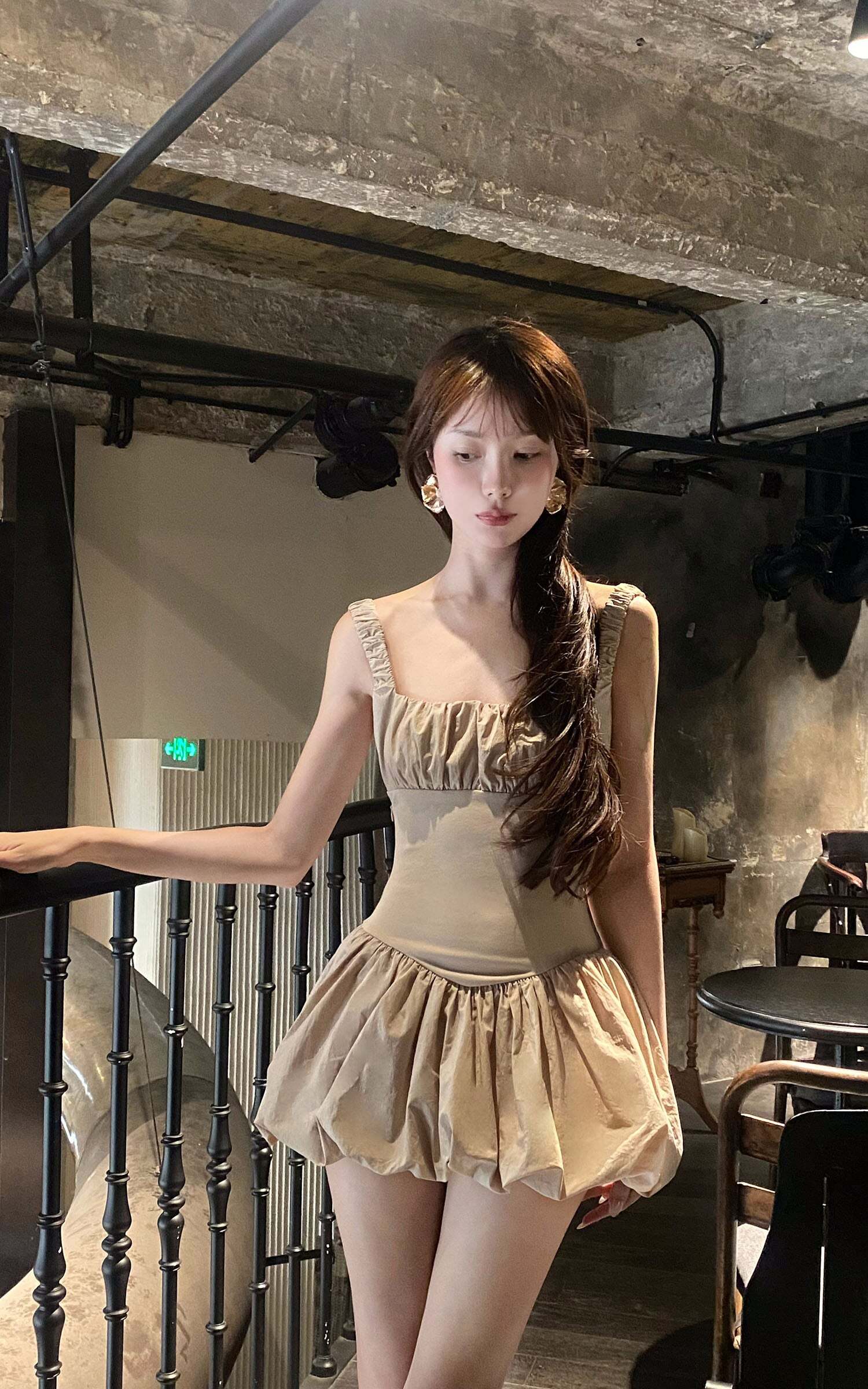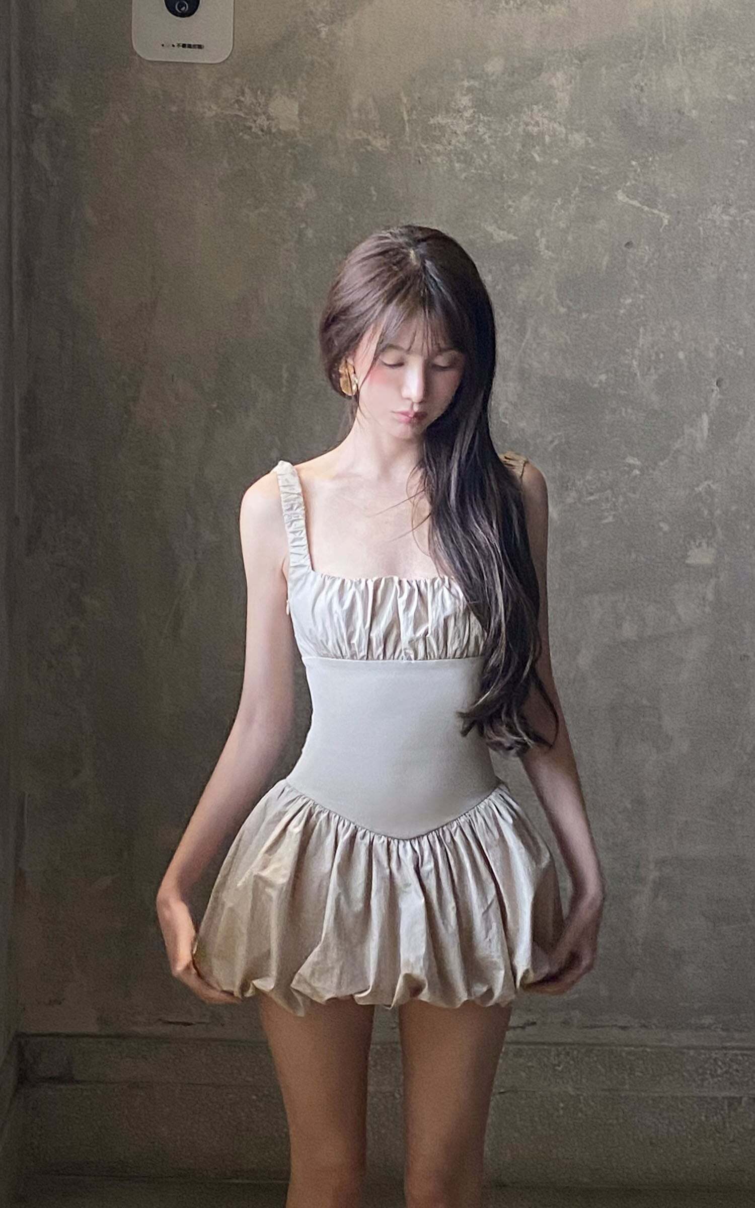 This romantic balletcore-inspired mini dress is a fairytale fantasy come true. Featuring a ruched bodice with delicate ruffle straps, a sculpting corset-like waist, and a voluminous bubble skirt in a soft champagne gold hue, it brings together vintage charm and dreamy femininity. Ideal for picnics, date nights, or whimsical city strolls. Style it with dainty flats or lace-up heels for the ultimate dreamy look.