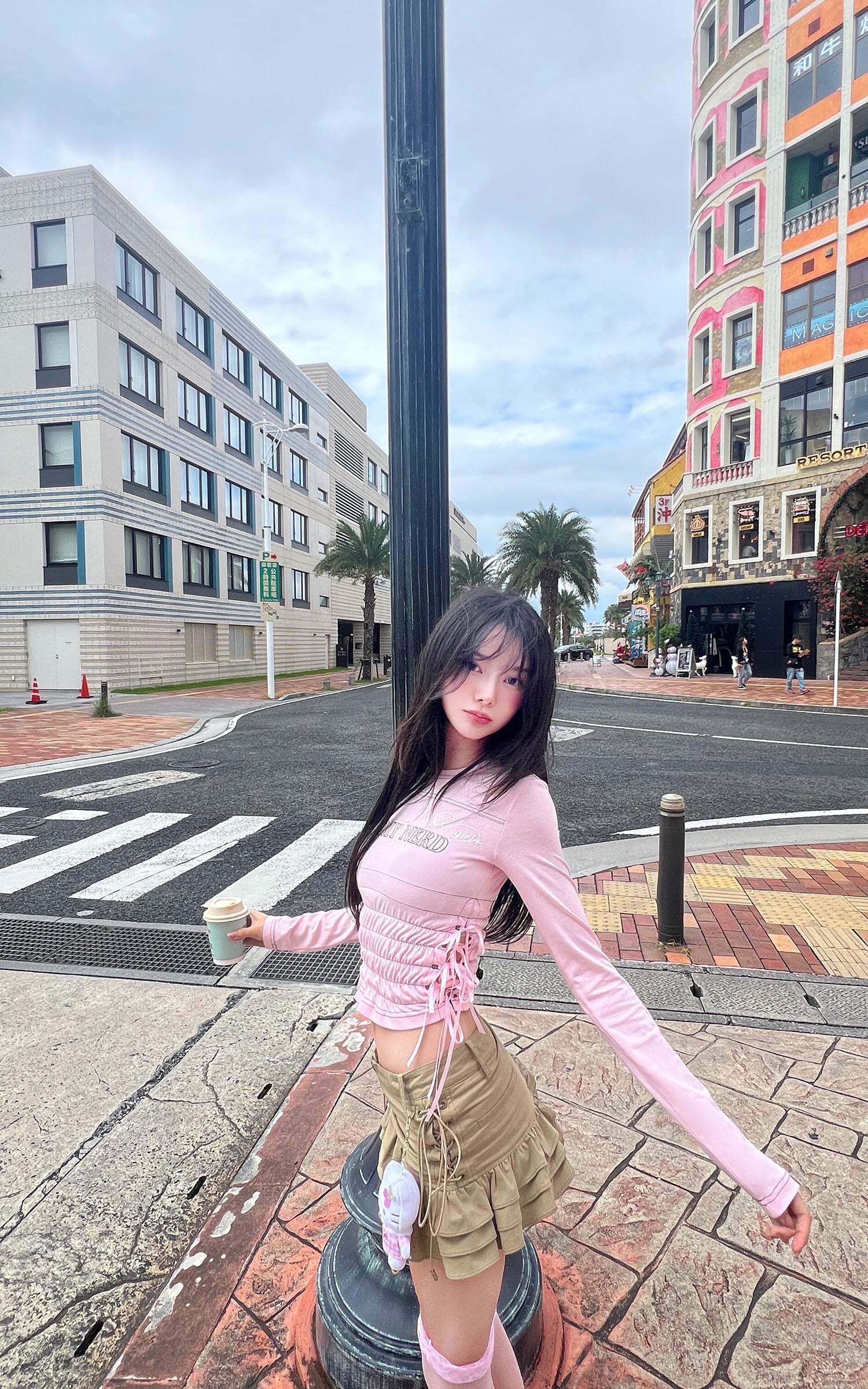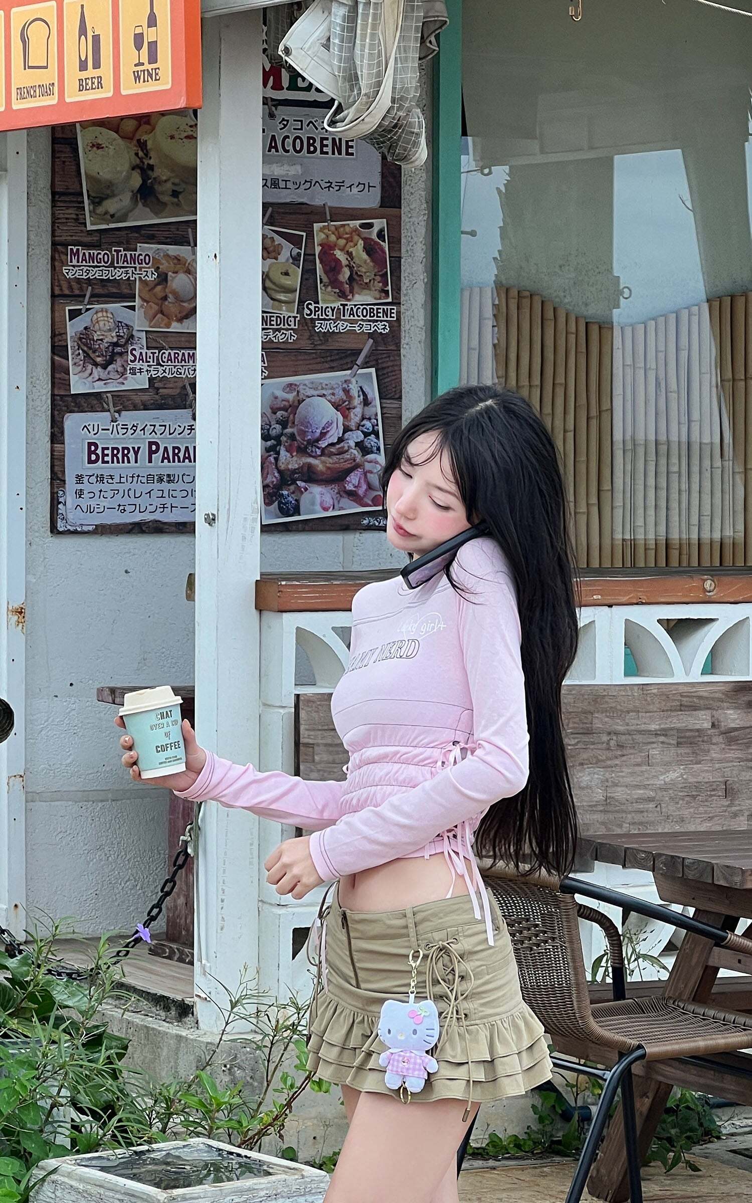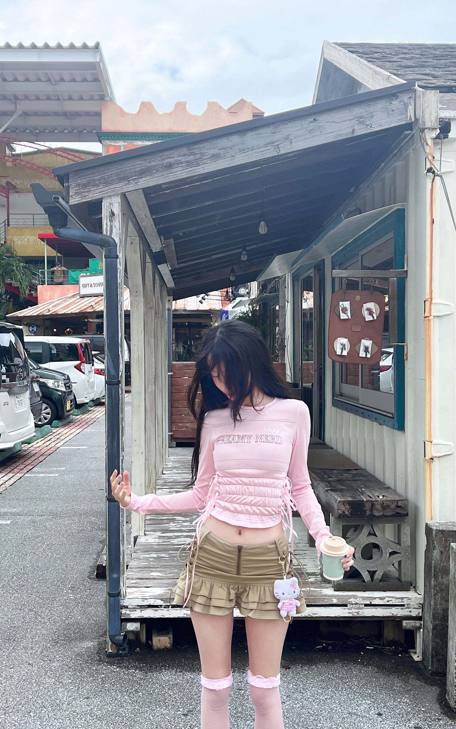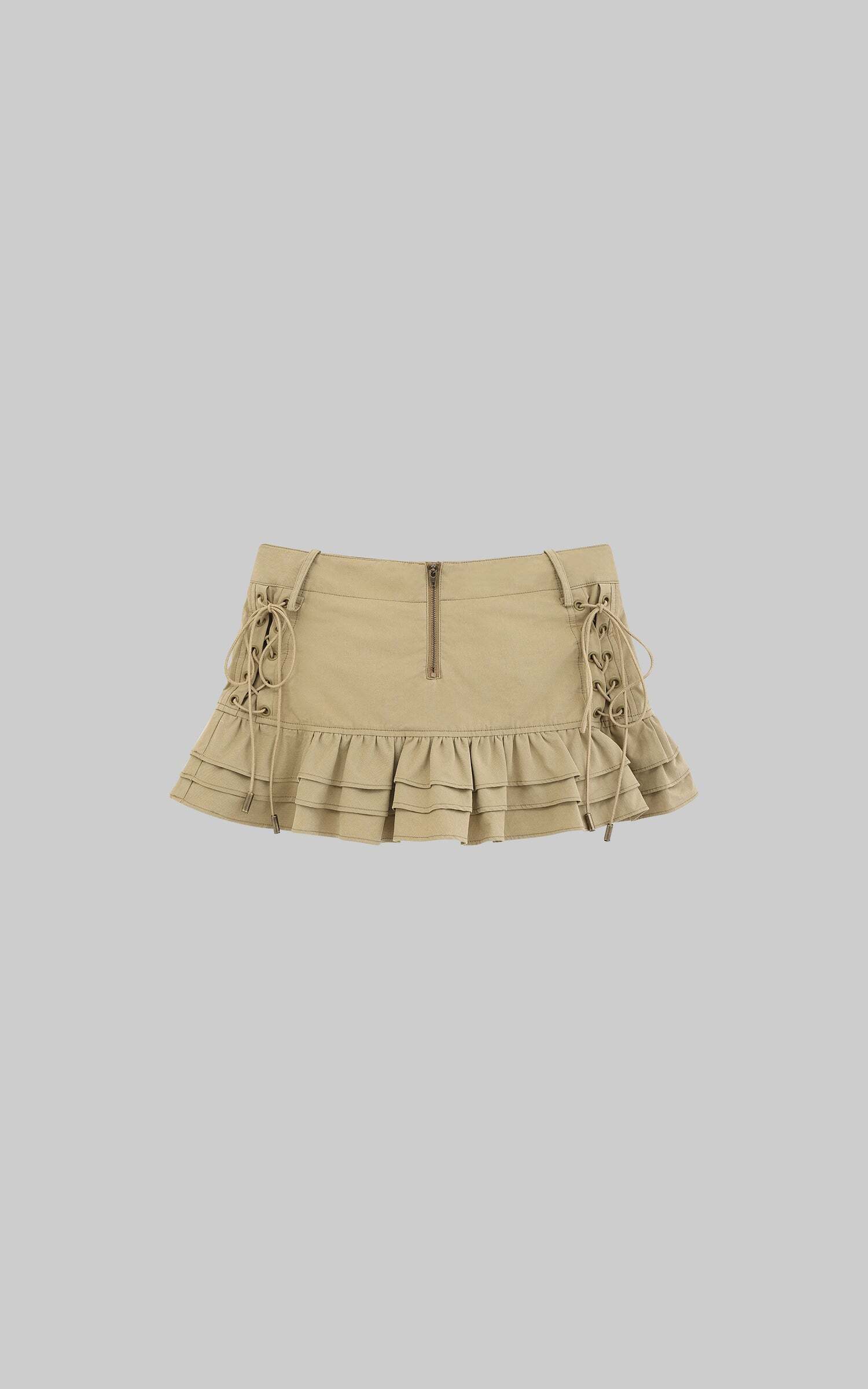 A sweet flirtation with utility. This low-rise mini skirt features a ruffled hem that flutters with every step, while the adjustable lace-up sides add a touch of edge to the softness. The structured fit hugs just right, and the built-in safety shorts give you all the confidence to twirl, bend, and dance under the sun. Pair it with a cropped baby tee or cozy hoodie for that effortless cool-girl vibe. Flirty meets functional—just how we like it.