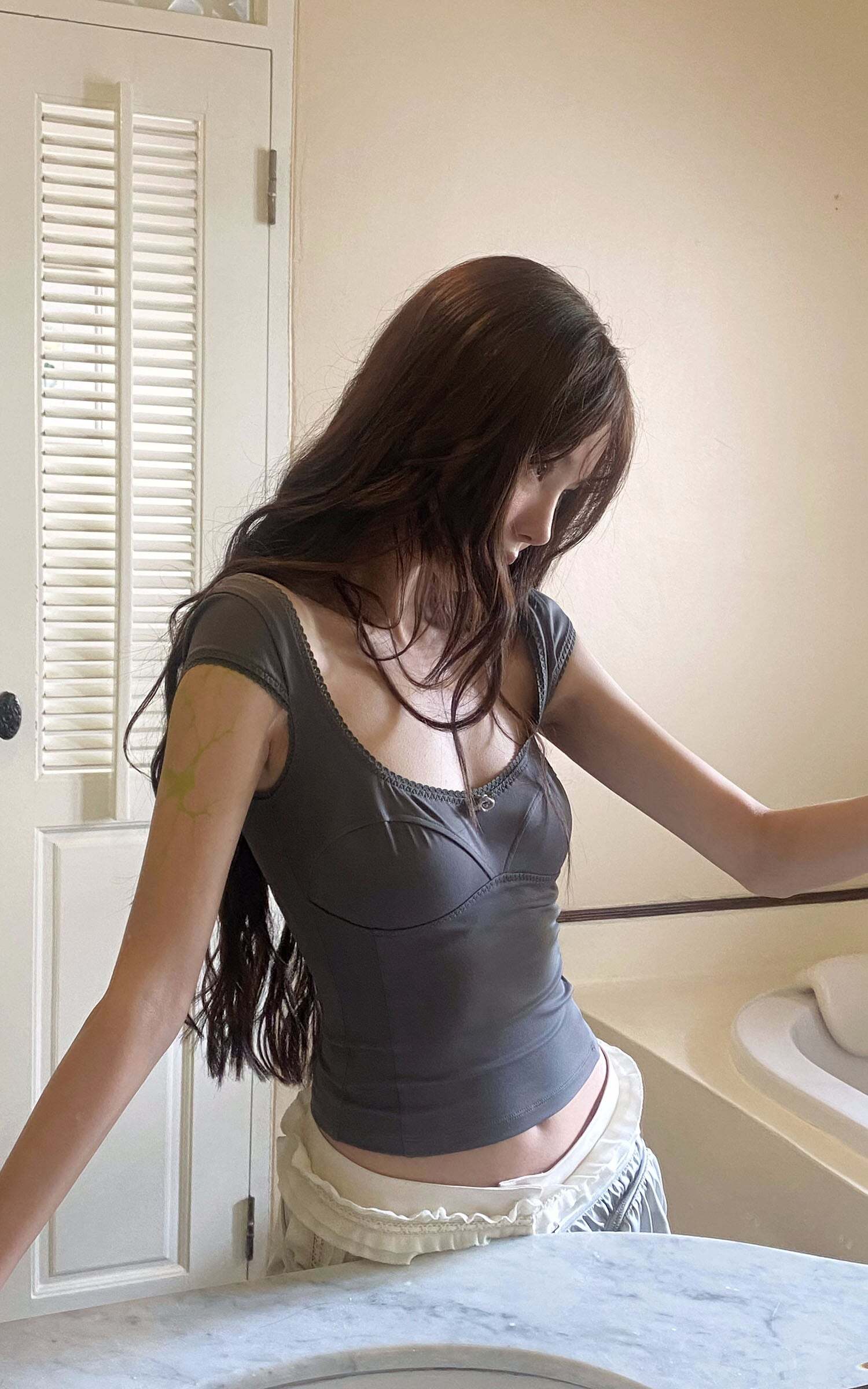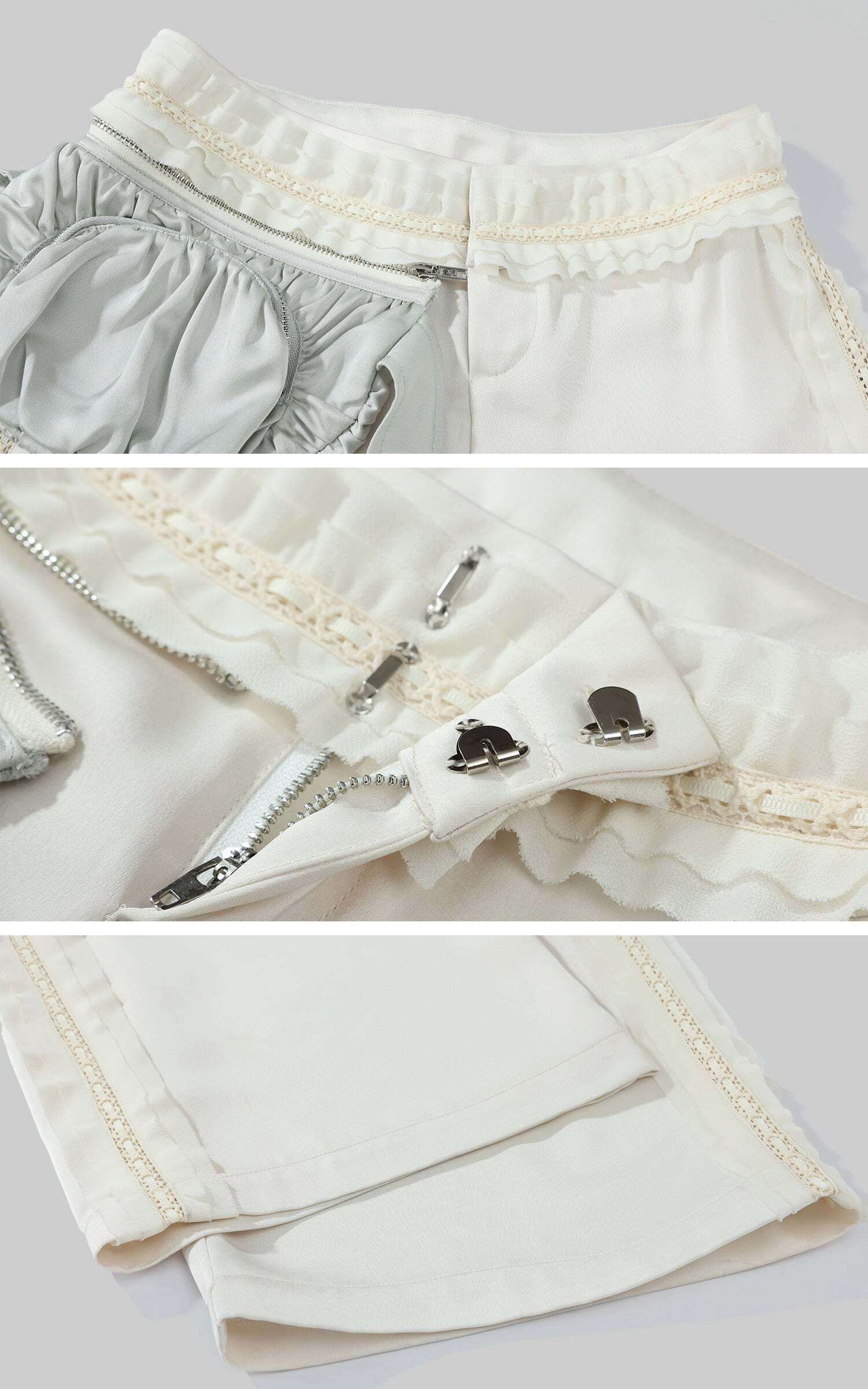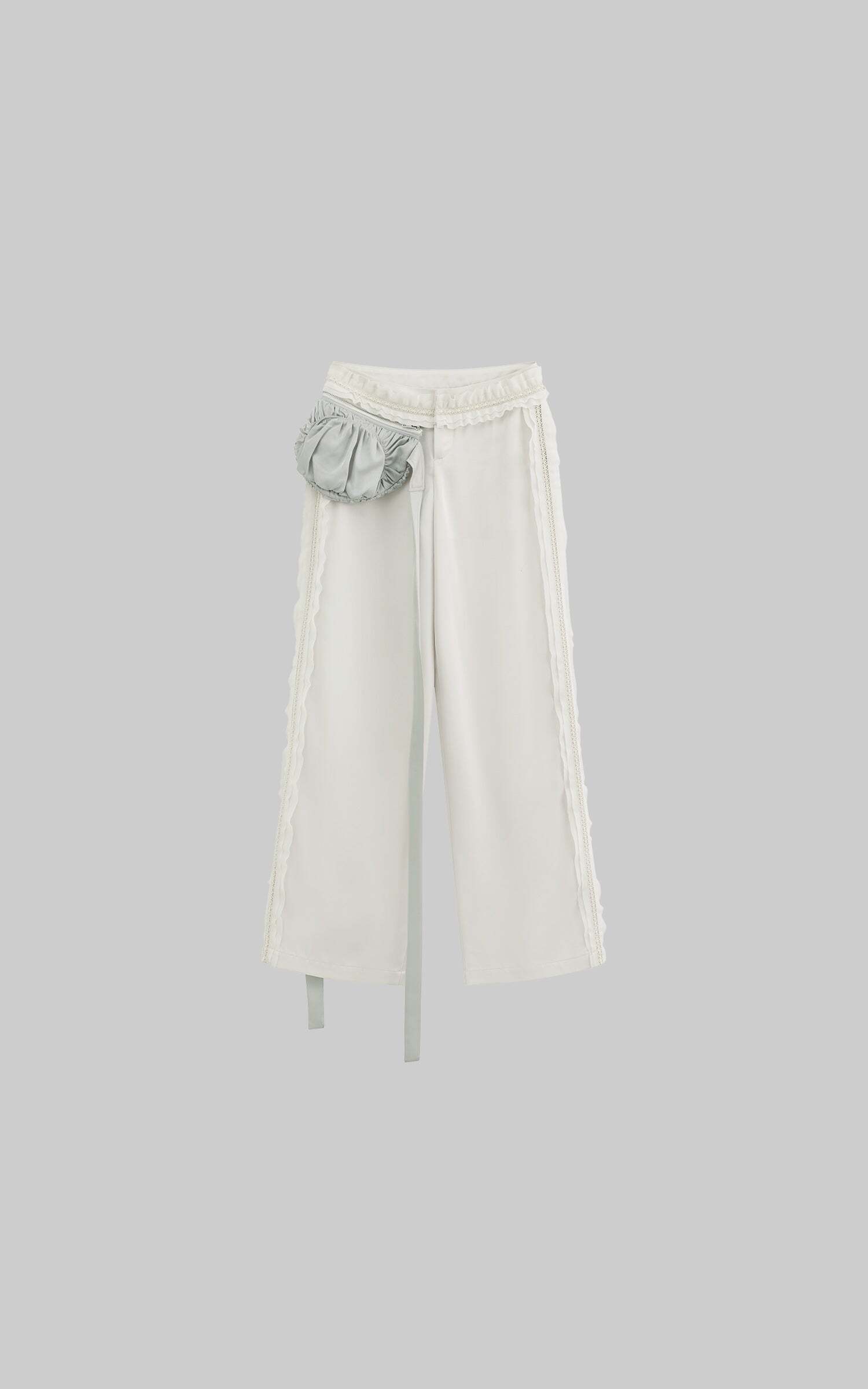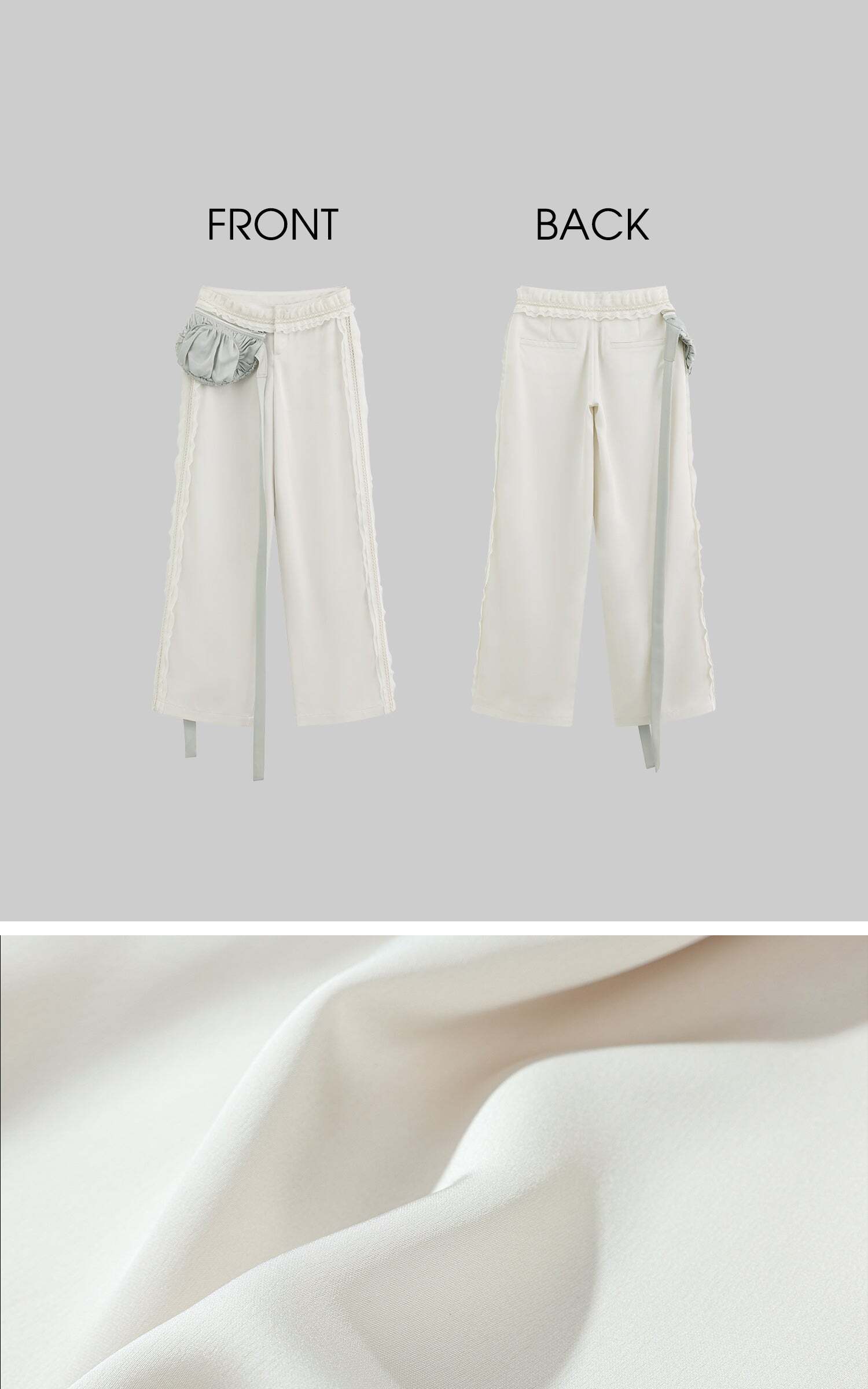 These wide-leg satin pants are a dreamscape of vintage femininity and soft rebellion. Designed with creamy ivory tones and a fluid drape, they flow with every step like a whispered ballet. Delicate ruffle trims trace the sides and waistline, adding texture and sweetness, while a detachable ruched mini pouch at the hip gives it that playful, unexpected twist—equal parts accessory and statement. Finished with a subtle slit at the hem and side tie detailing, this piece blurs the line between elegance and attitude. Wear it with a slinky cami or a soft knit and let the compliments pour in.