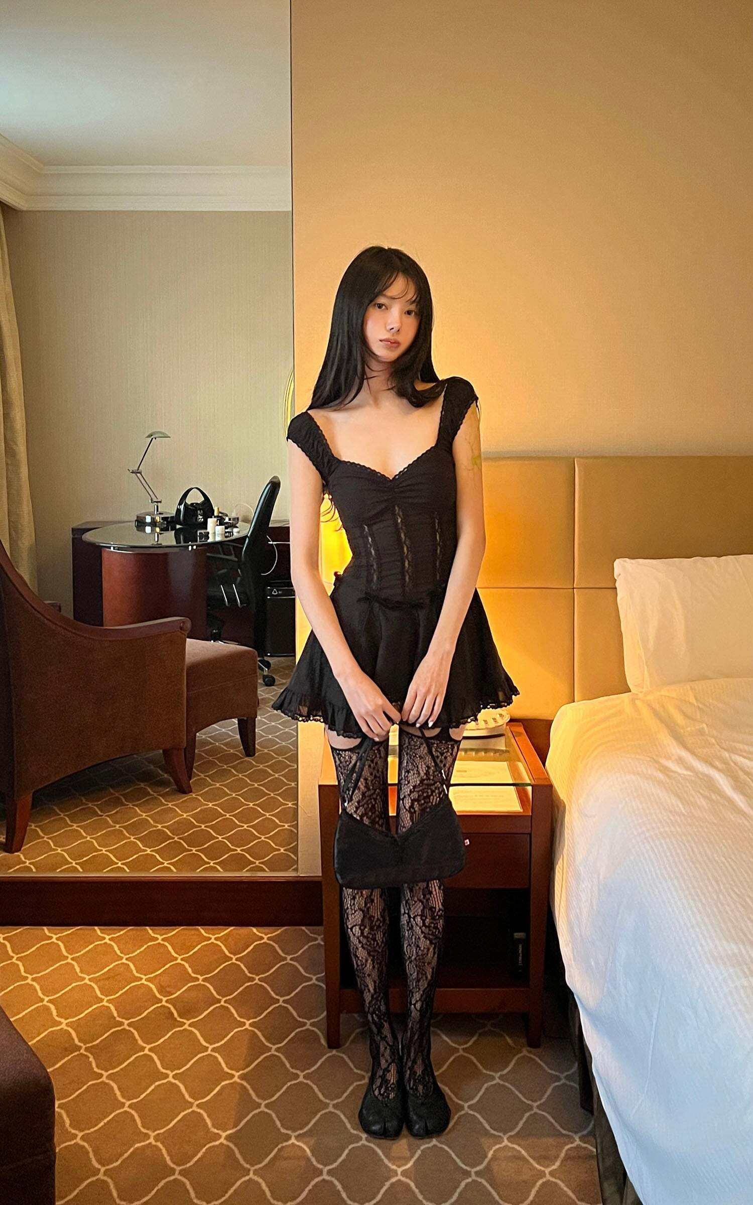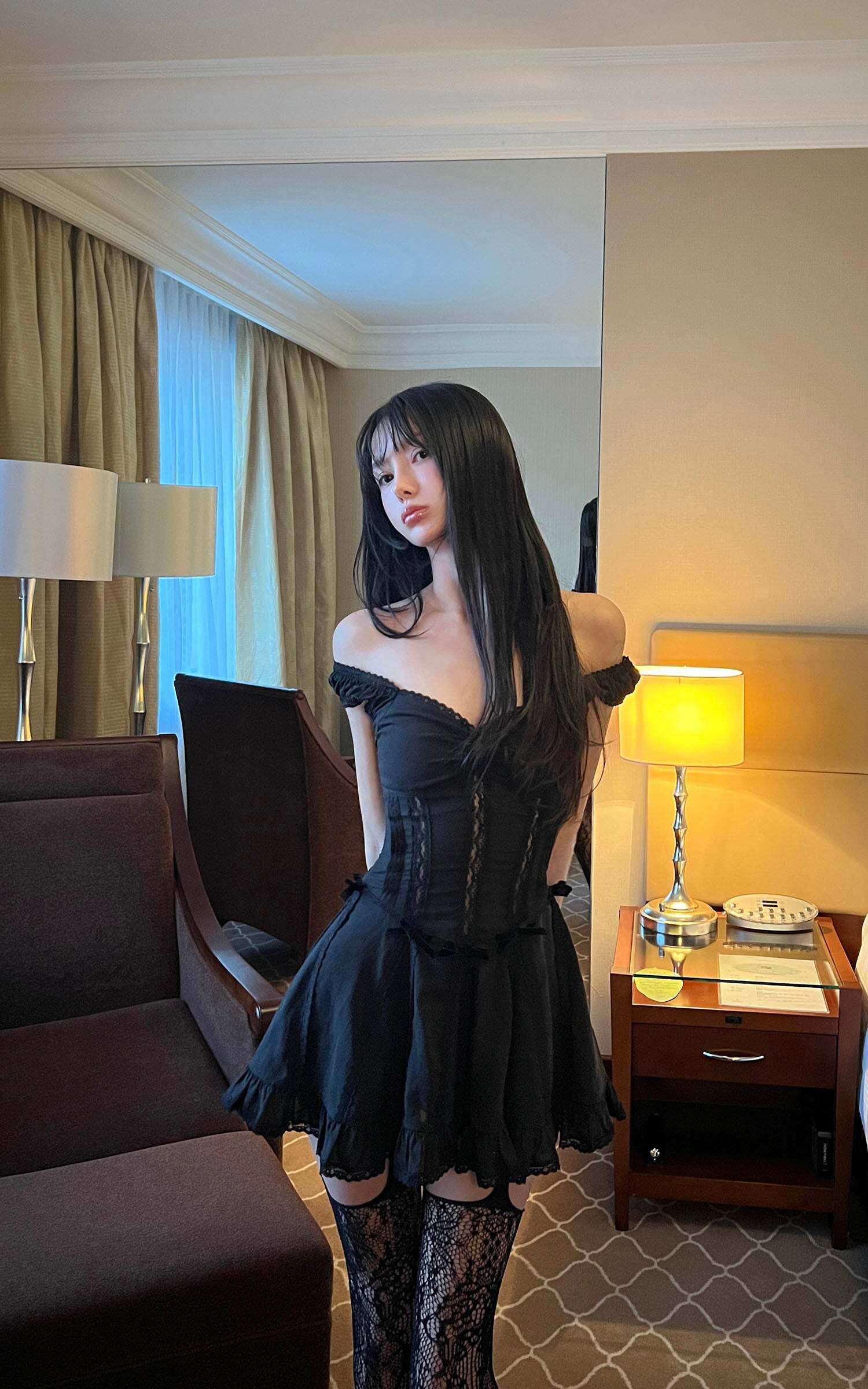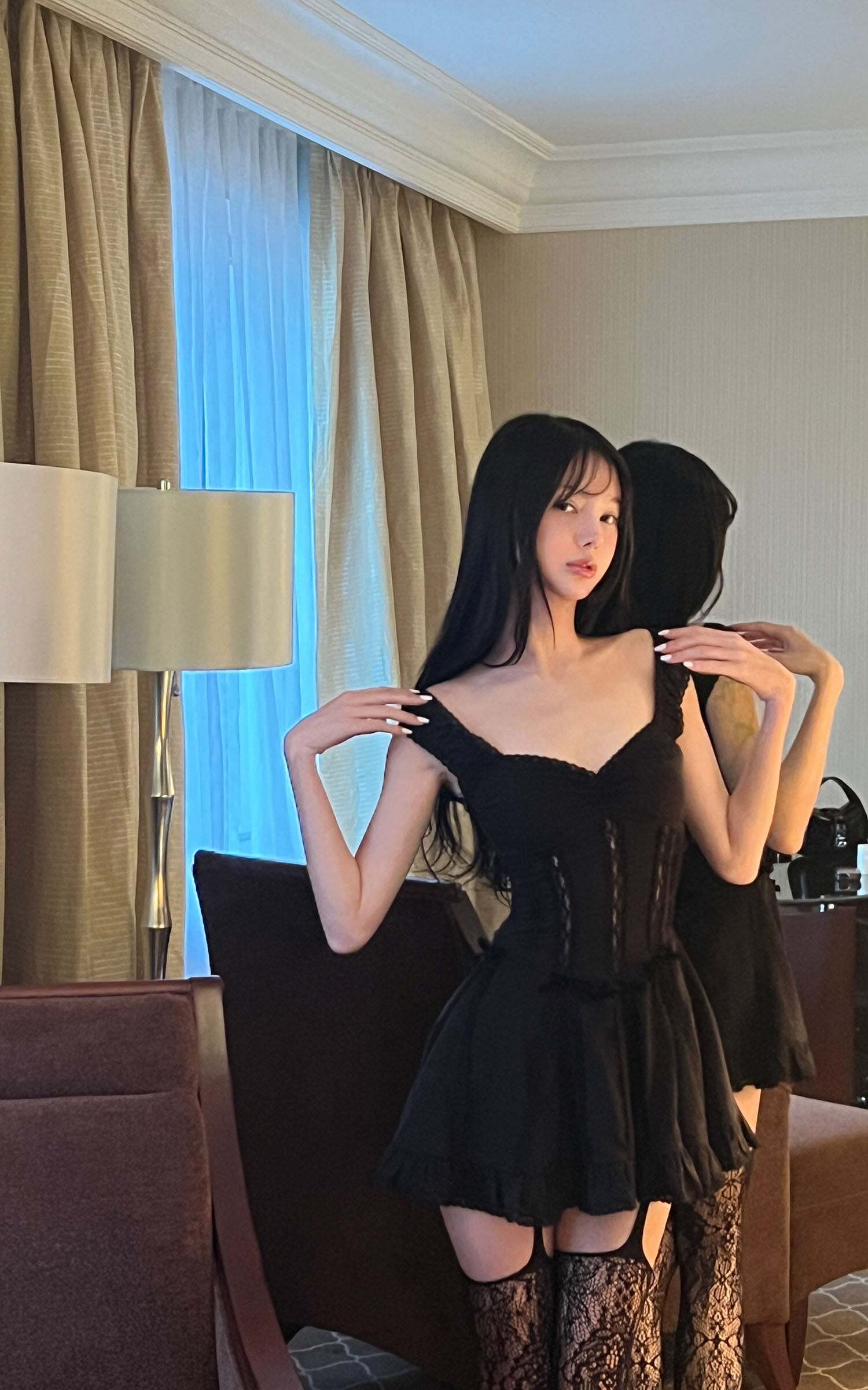 Soft shadows, vintage dreams. This little black dress features a romantic corset-style bodice with lace-trimmed panels and delicate velvet bows. Gently ruffled straps and hemline bring a soft movement to the silhouette, while the cinched waist flares into a fluttery mini skirt that feels made for twirling. The kind of dress that whispers secrets at midnight and steals glances in golden hour light.Pair it with lace stockings and Mary Janes for a coquette-inspired look, or layer it under an oversized blazer to flirt with contrast.