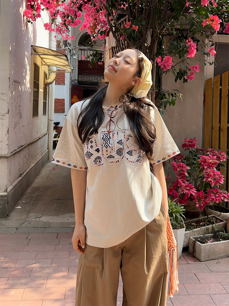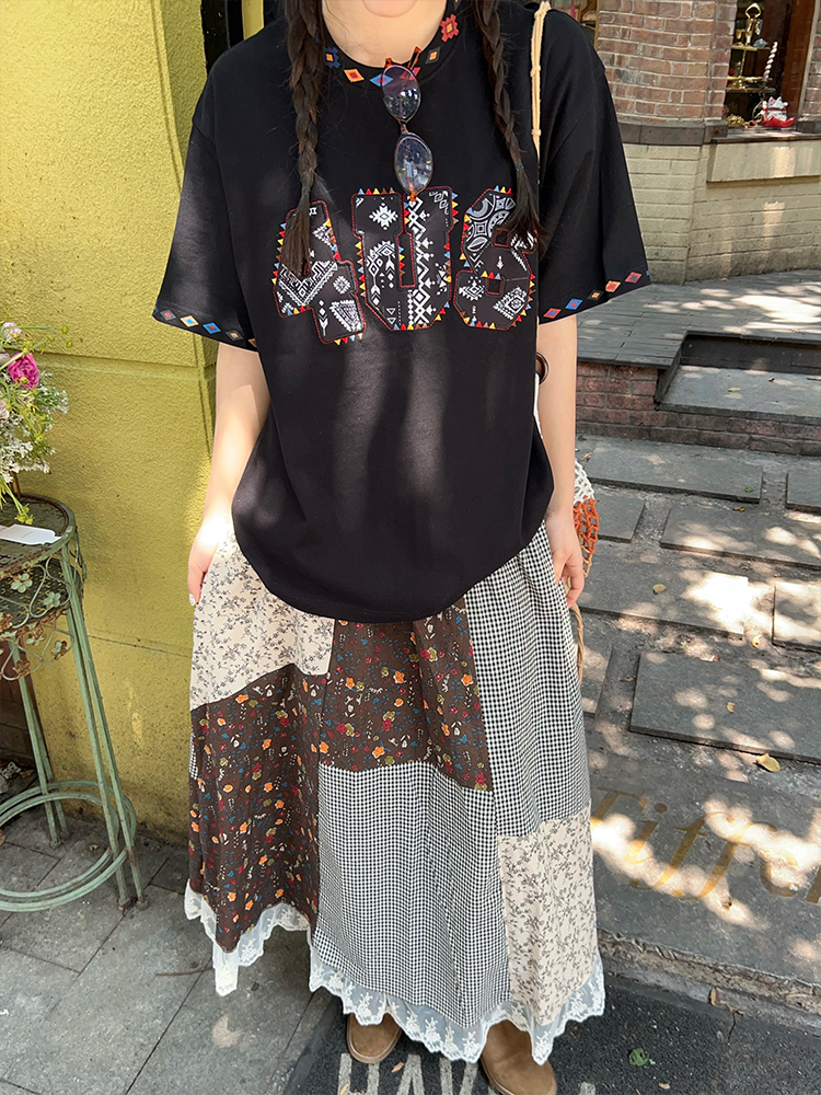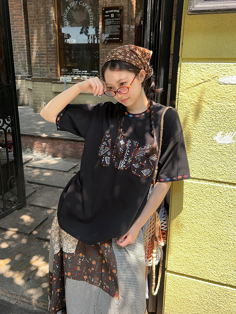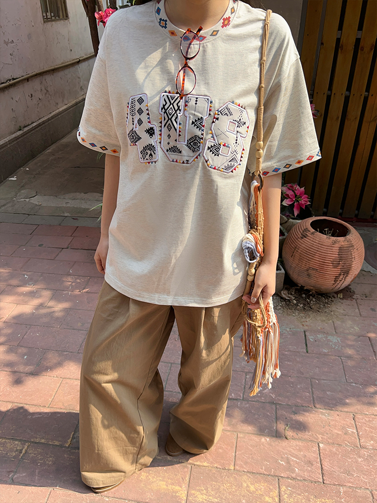 Ethnic Letter Pattern Embroidered Collar Short Sleeve Top Spring/summ – Spring Outfit