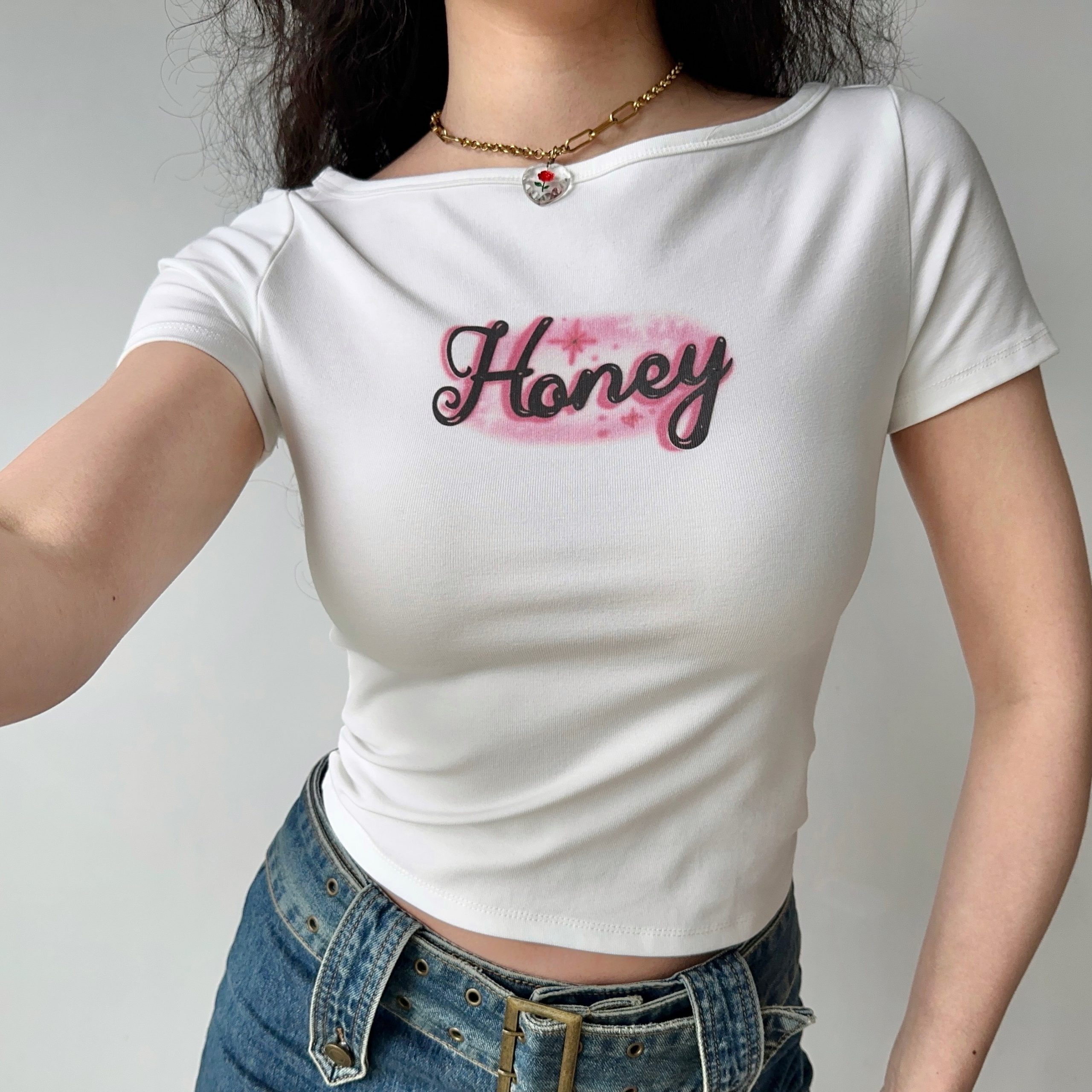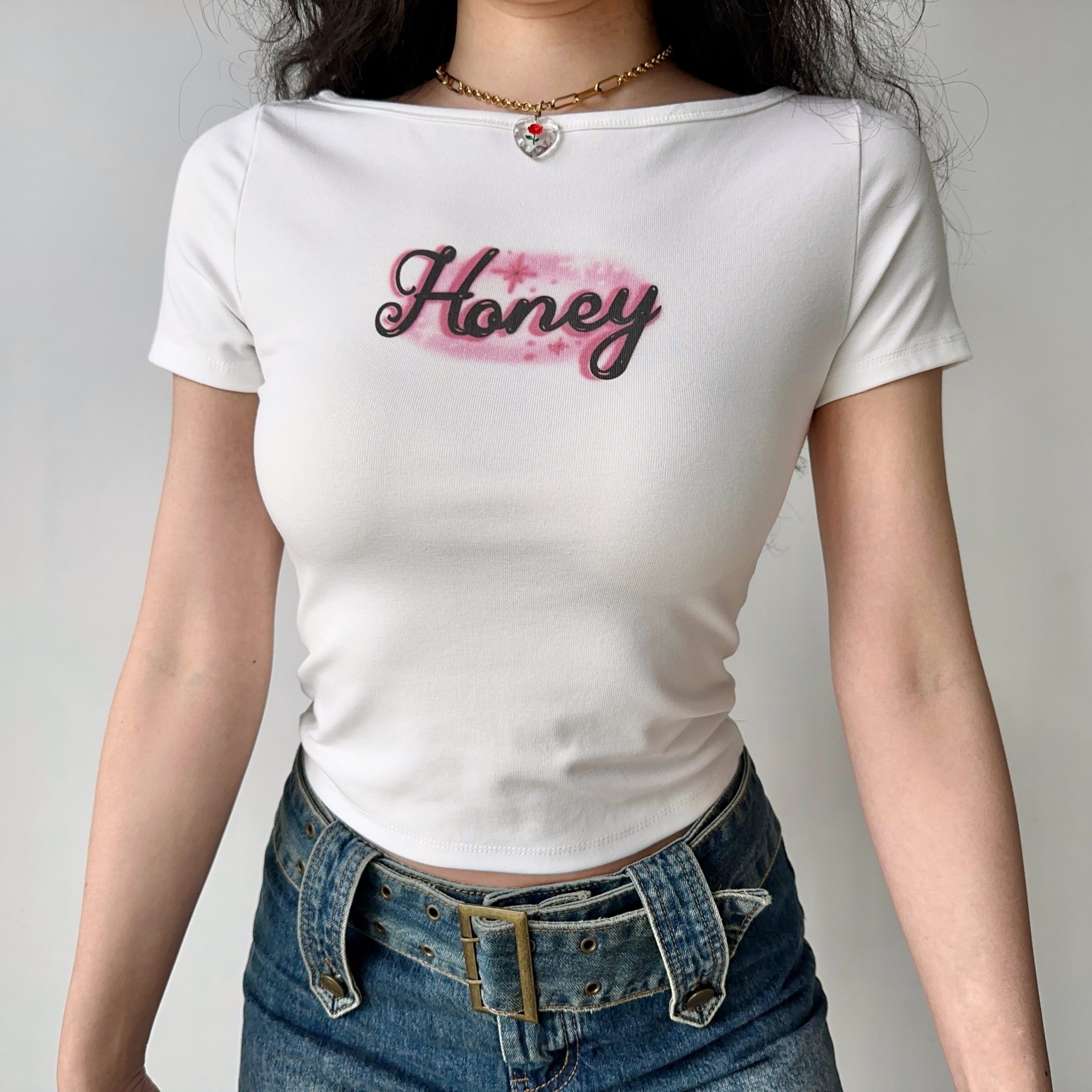 European, Honey Print White Shoulder Women, High Waisted Slim Short Sleeve Top, Y2K High-quality product featuring 2000s fashion, coquette outfit, 90s fashion and more. Modern design that fits the latest trends. Premium materials ensure durability and comfort. Order now for special offers! Product designed with attention to every detail. Suitable for all occasions and personal styles.