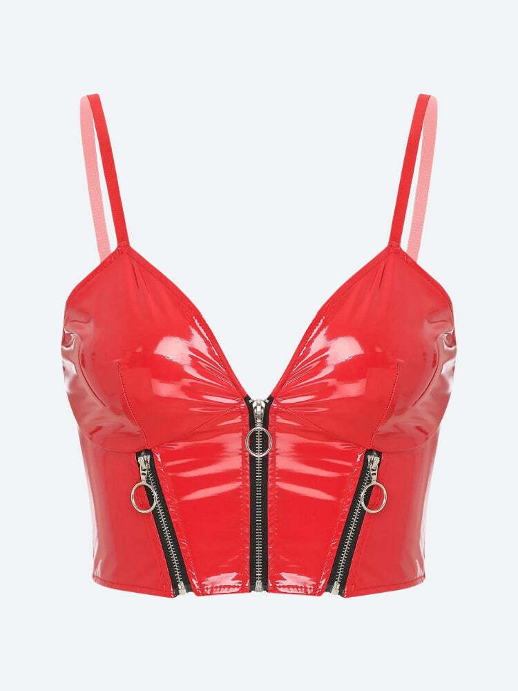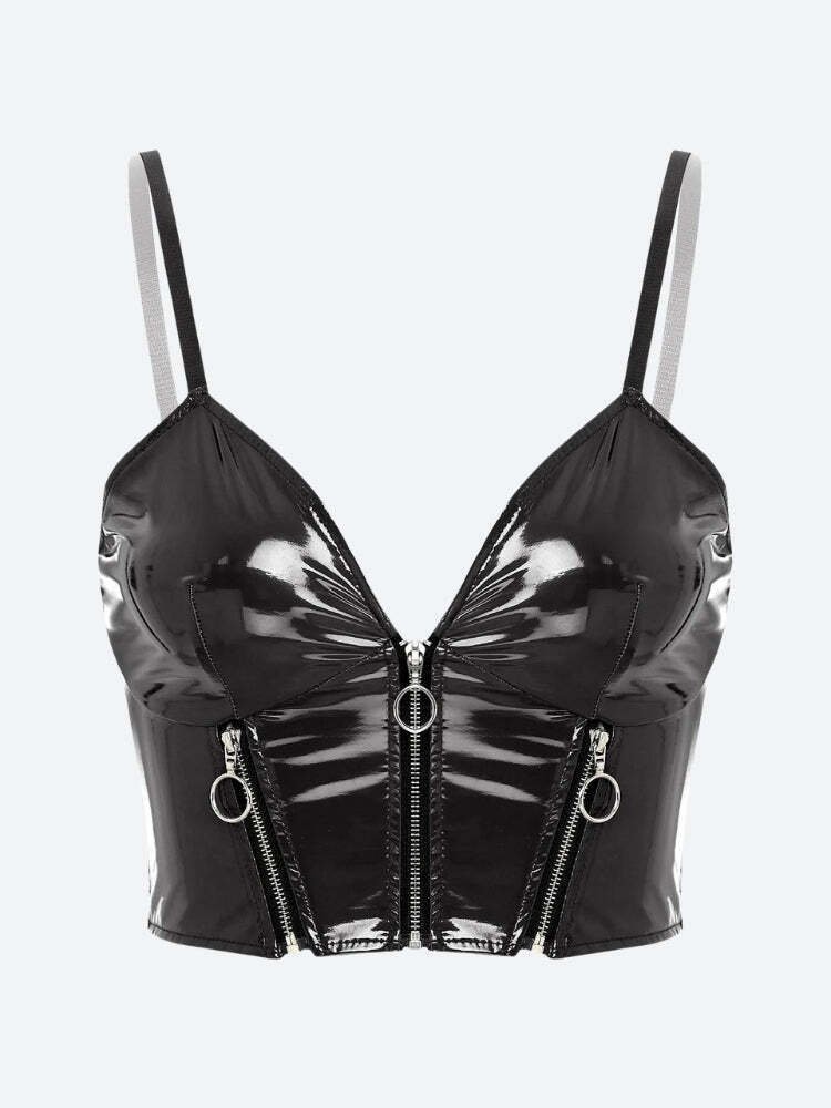 Make a statement with this faux patent leather bustier crop top. The glossy finish and front zip add bold flair, while adjustable straps and a cropped fit make it perfect for pairing with high-waisted jeans or skirts.