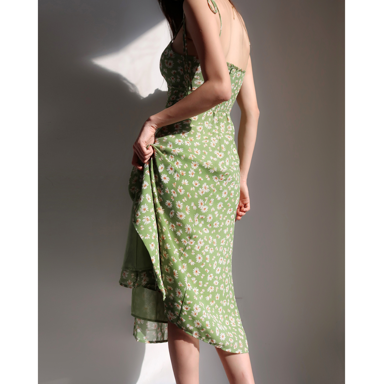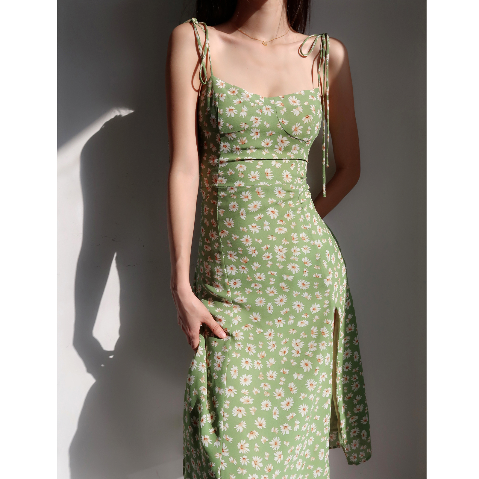 Step into effortless elegance with our Fitted Vintage Green Side-Slit Dress, adorned with charming small daisies for a touch of whimsy. This French-style sleeveless mid-calf dress offers a flattering fit that accentuates your silhouette while providing comfort for all-day wear, making it the perfect choice for your next vacation or casual outing. Embrace a blend of style and sophistication add this delightful dress to your cart today and elevate your wardrobe!