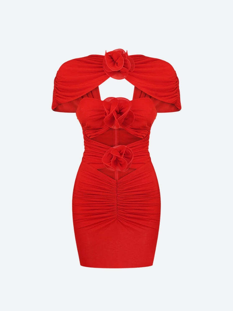 Make an entrance in this fiery red cut-out dress. With ruched mesh, floral appliqué accents, and dramatic skin reveals, this sculpted showstopper turns every event into your runway. It’s bold, artful, and unapologetically unforgettable.
