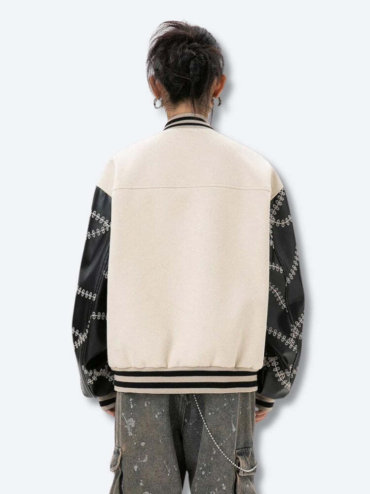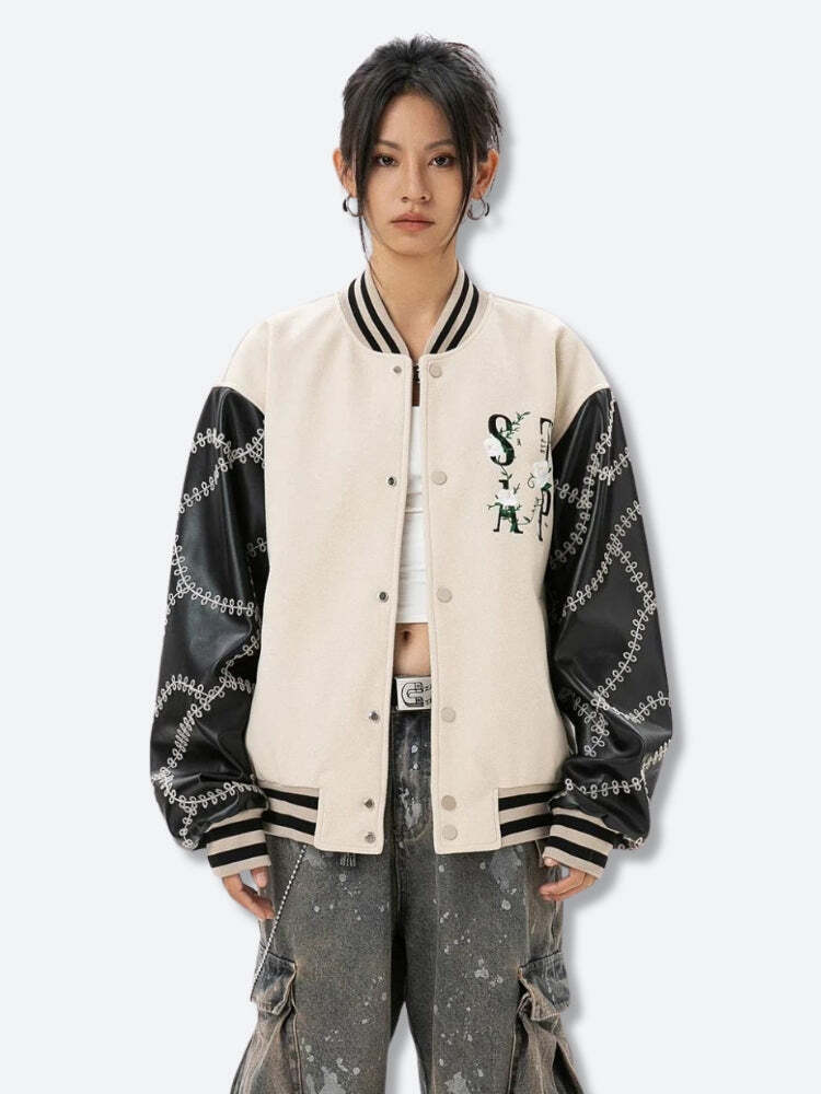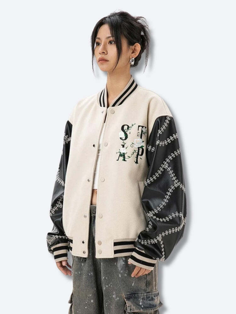 This Floral Embroidered Bomber Jacket is a stylish fusion of streetwear and delicate detailing. Featuring intricate floral embroidery on the front, this jacket adds a touch of nature-inspired elegance to a classic, varsity-style design. Its oversized fit provides a relaxed, yet fashionable look perfect for layering over any casual outfit.