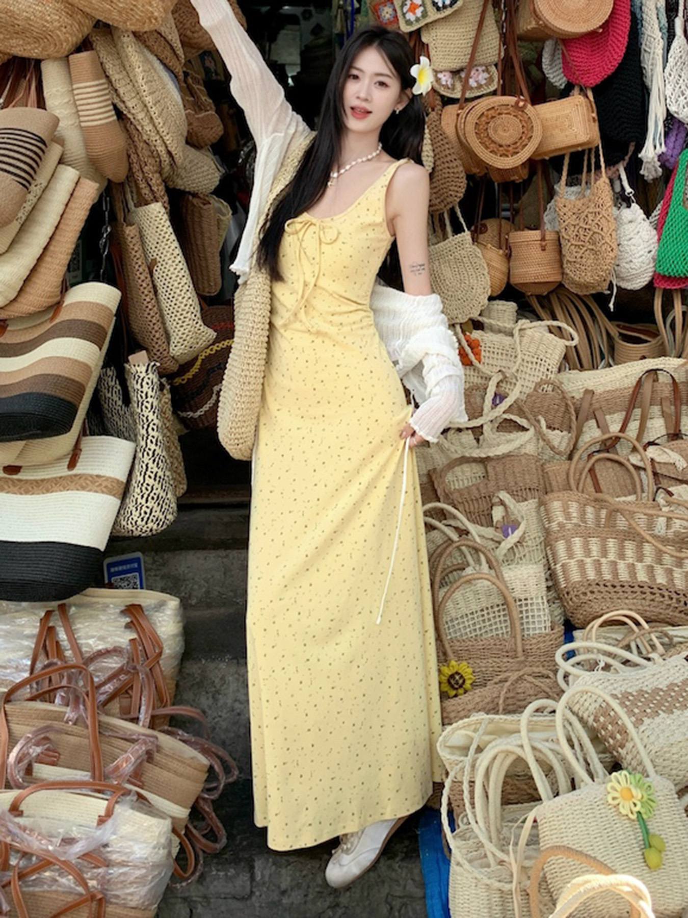 Floral Print Cami Long Dress Women, Low Neckline, Bow Tie, Fresh Healing, Summer, Boho High-quality product featuring spring outfit, summer fits, spring outfits and more. Modern design that fits the latest trends. Premium materials ensure durability and comfort. Order now for special offers! Product designed with attention to every detail. Suitable for all occasions and personal styles.