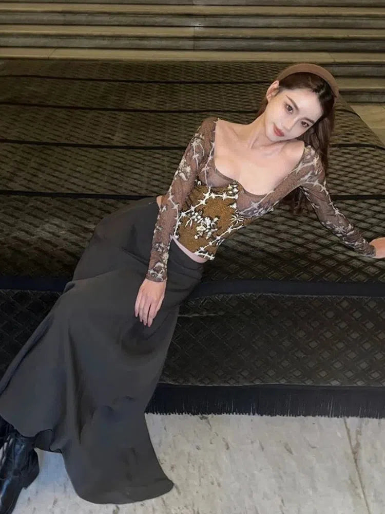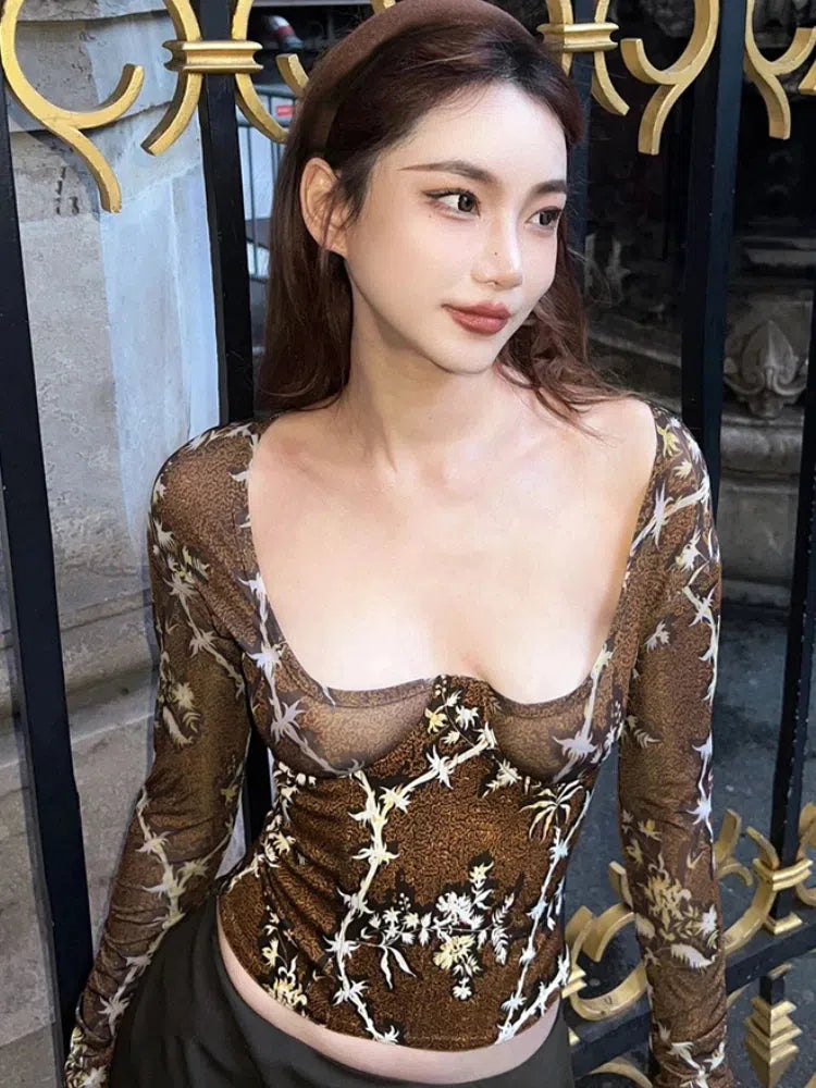 The Floral Square Neck Corset Top is an ultra-feminine piece that combines vintage elegance with modern allure. Designed with a deep square neckline and semi-sheer long sleeves, this top accentuates the silhouette with its corset-like fit and delicate floral print.
