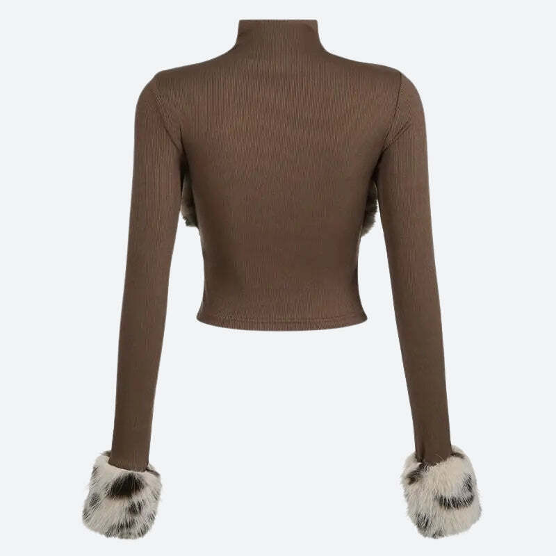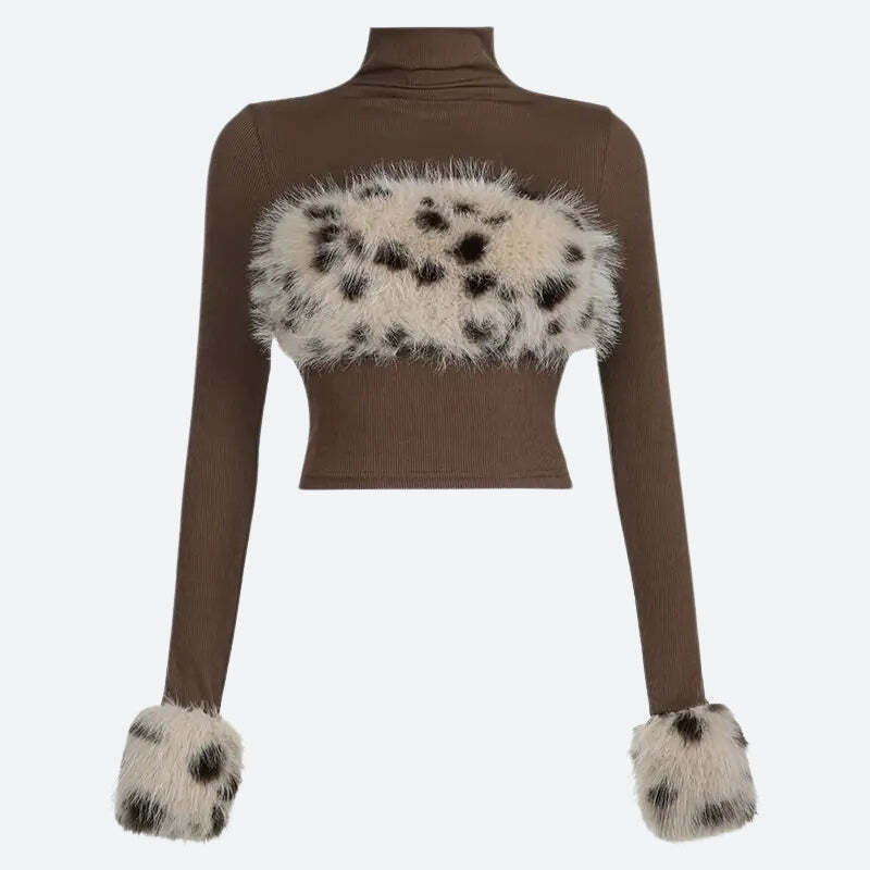 Go bold in this fluffy leopard top with a turtleneck and plush cuffs for a standout look. Ideal for party nights or edgy daywear.