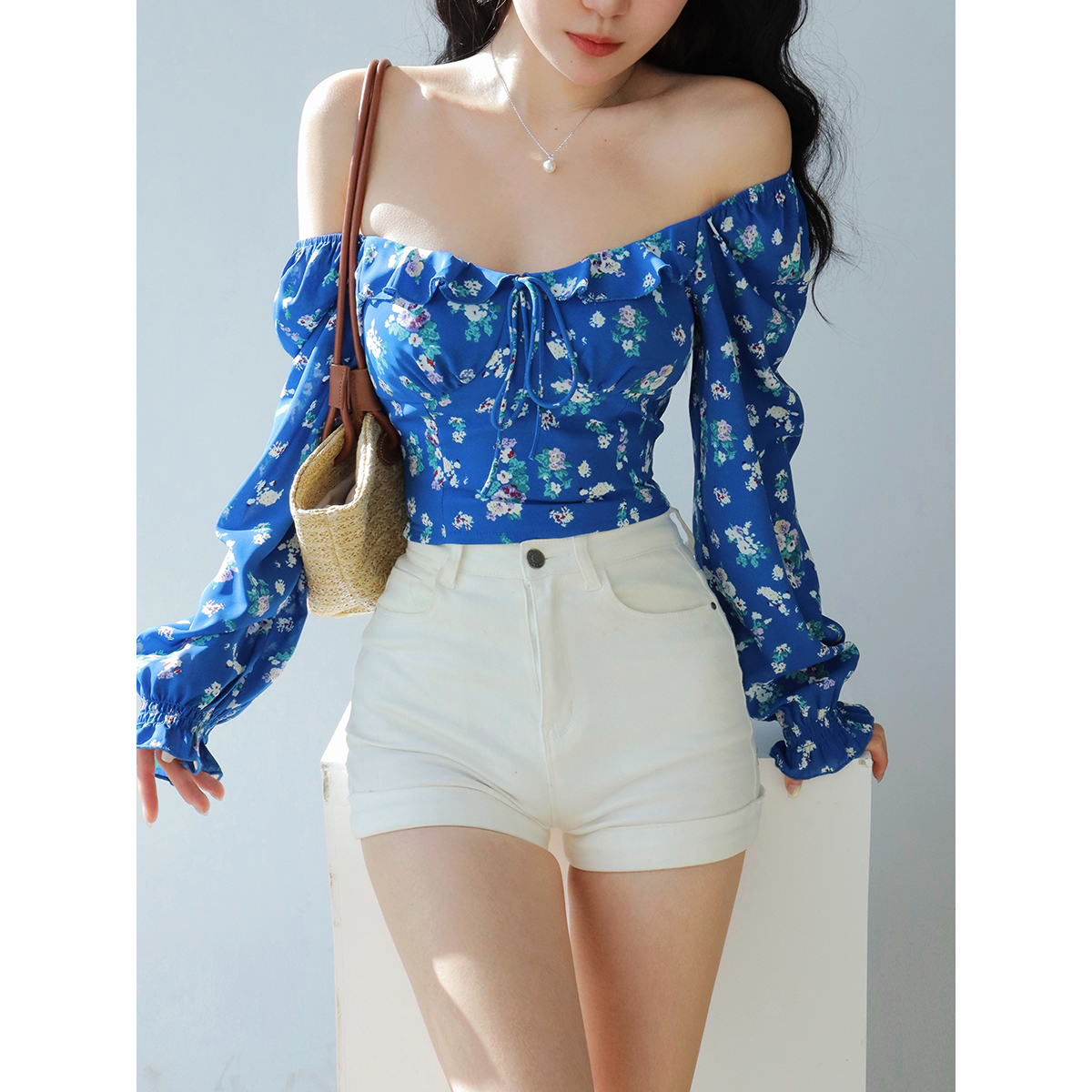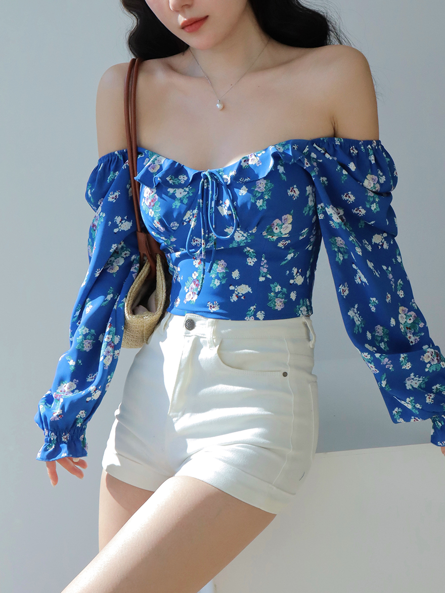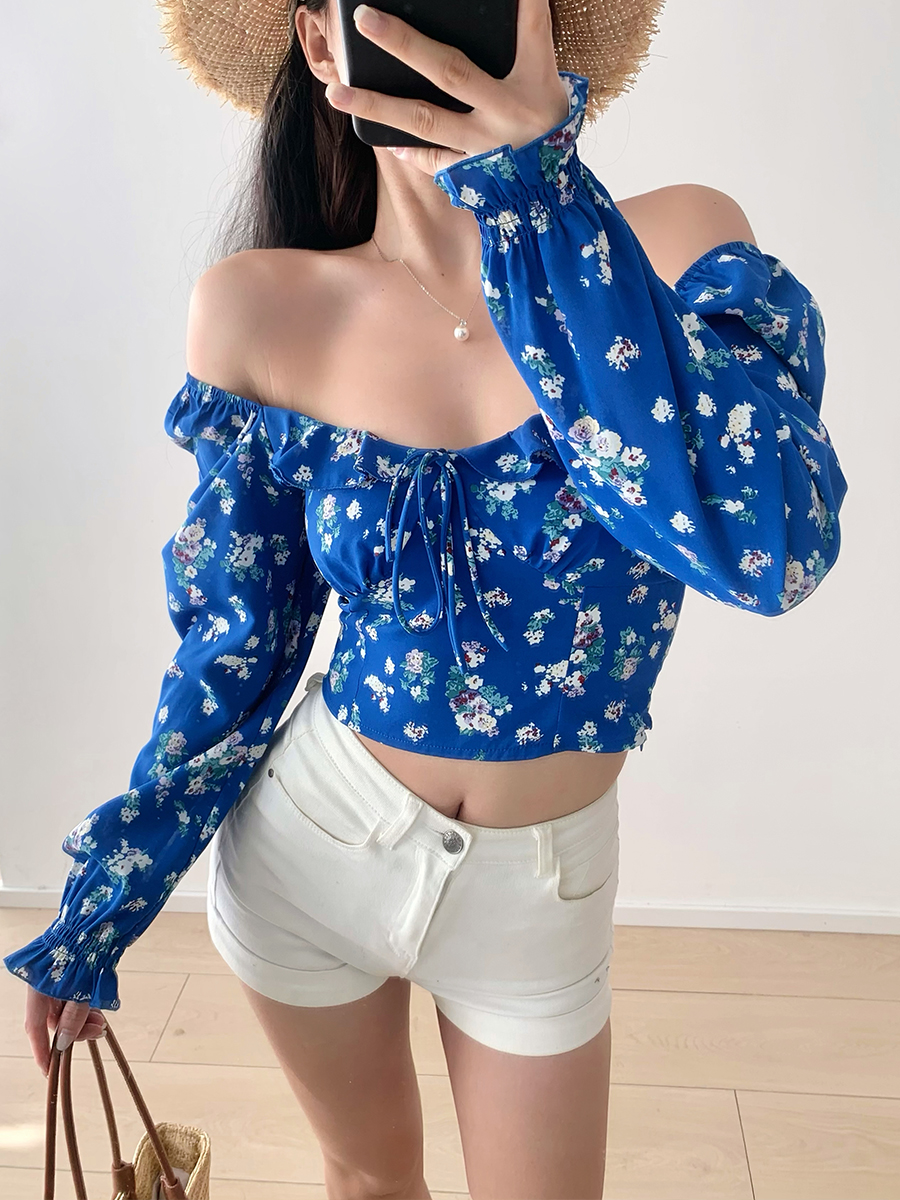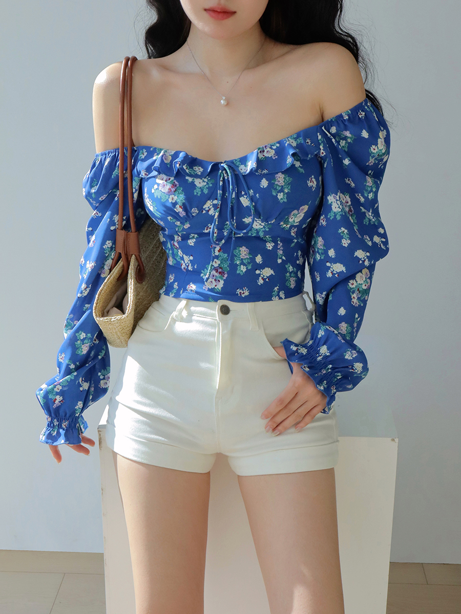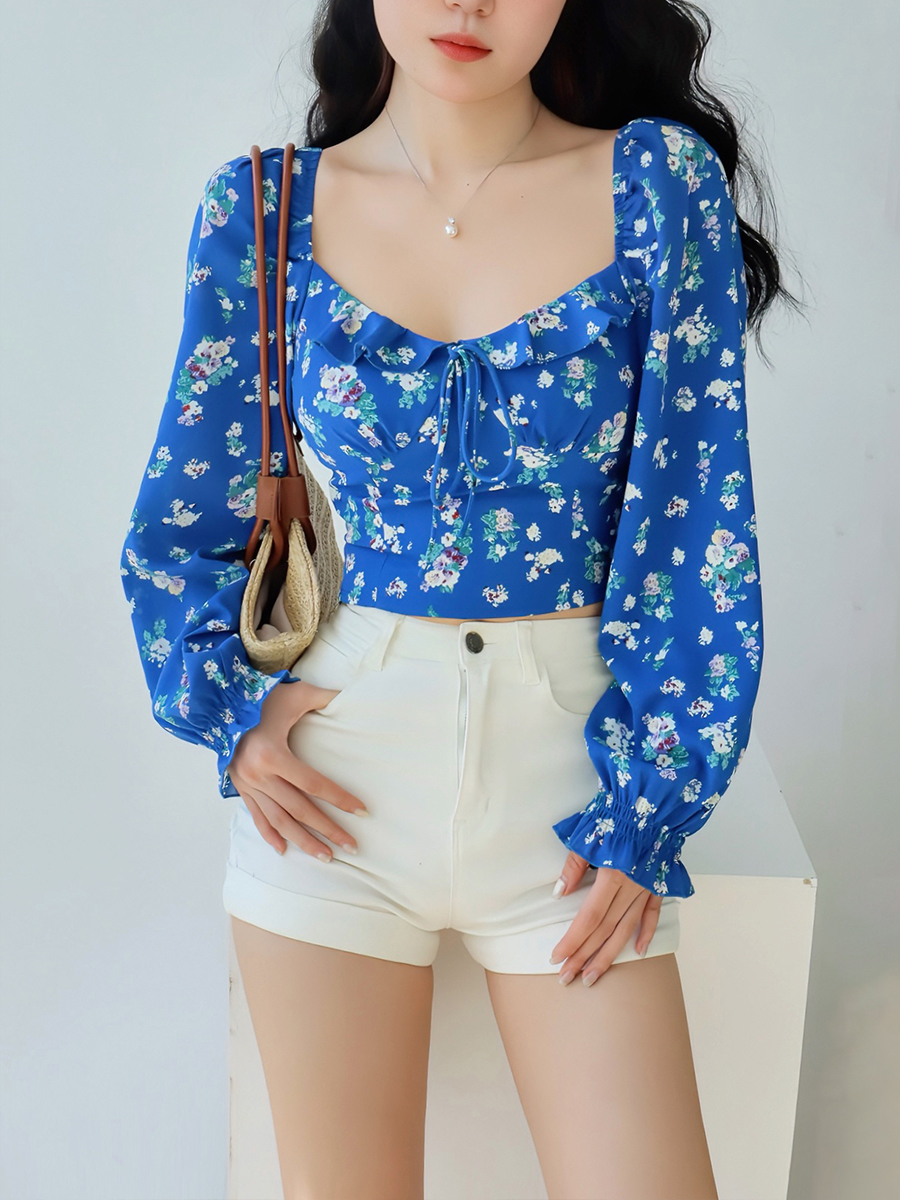 Blue Floral Square Neck One Shoulder Puff Sleeve Shirt Women, Long Slee – Y2k Outfits