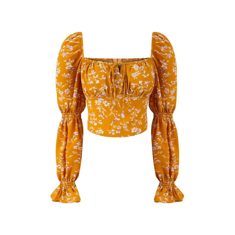 Square Neck Lantern Sleeve Floral Blo Drawstring Waipring/summer Top – Summer Fits
