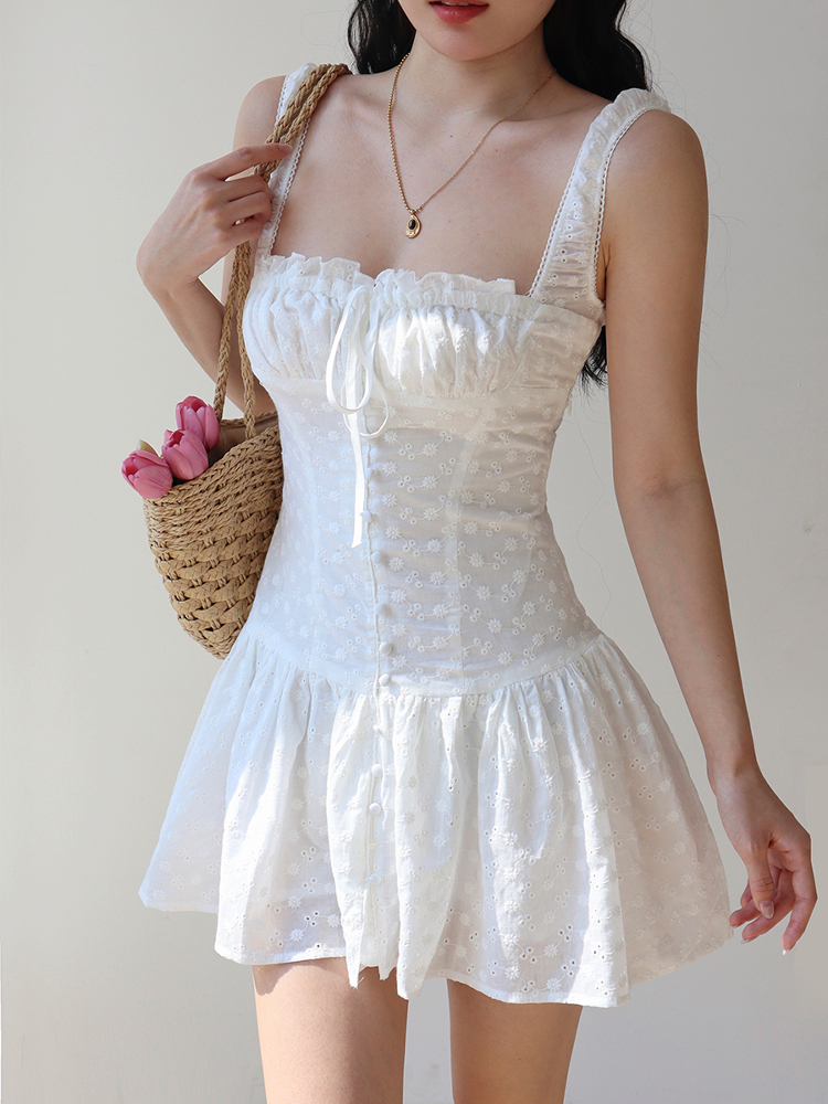 Square Neck White Hollow Embroidery Dress Wide Shoulder Straps, Drawstring Short Dress Summer High-quality product featuring casual summer outfits, hoco dresses, thanksgiving dress and more. Modern design that fits the latest trends. Premium materials ensure durability and comfort. Order now for special offers! Product designed with attention to every detail. Suitable for all occasions and personal styles.