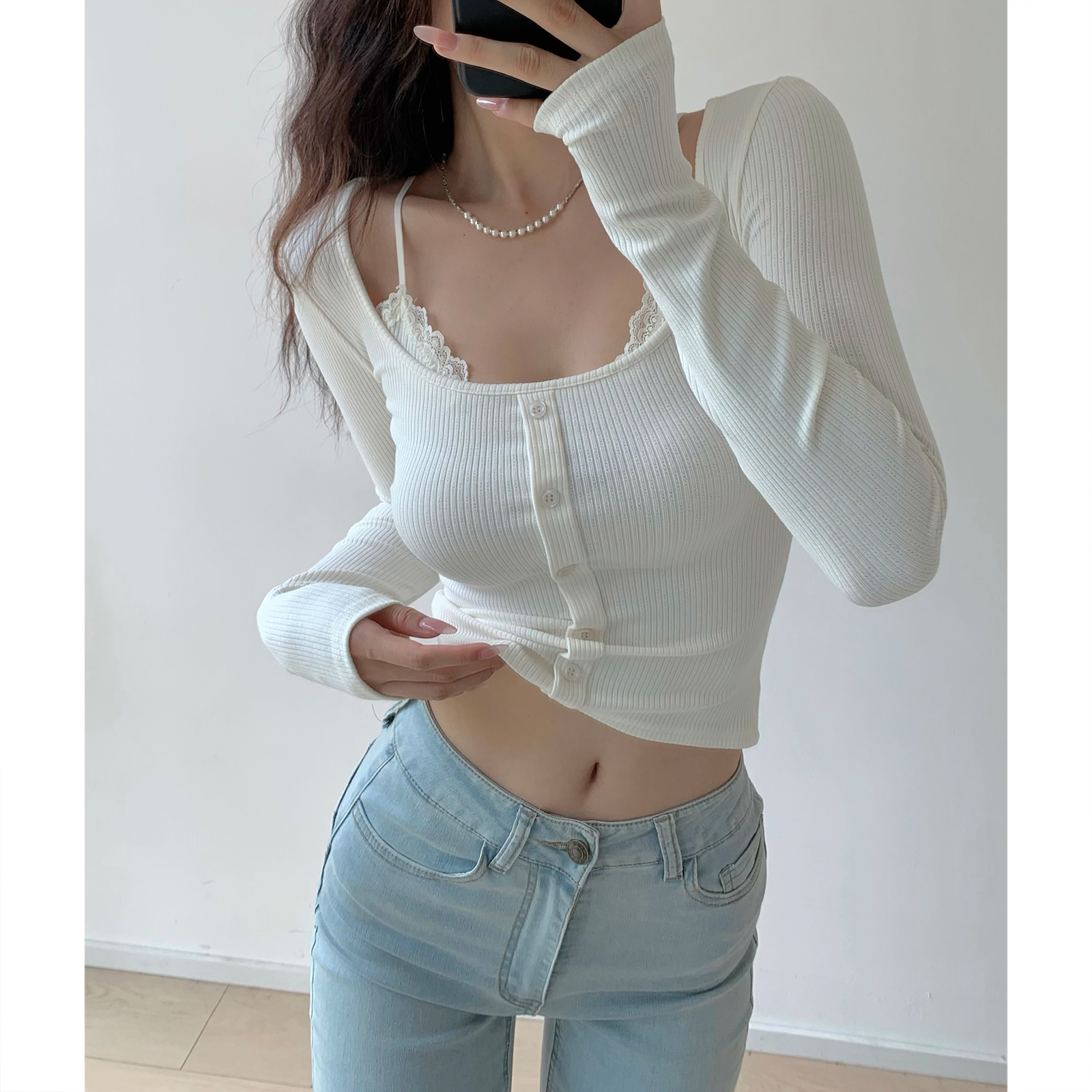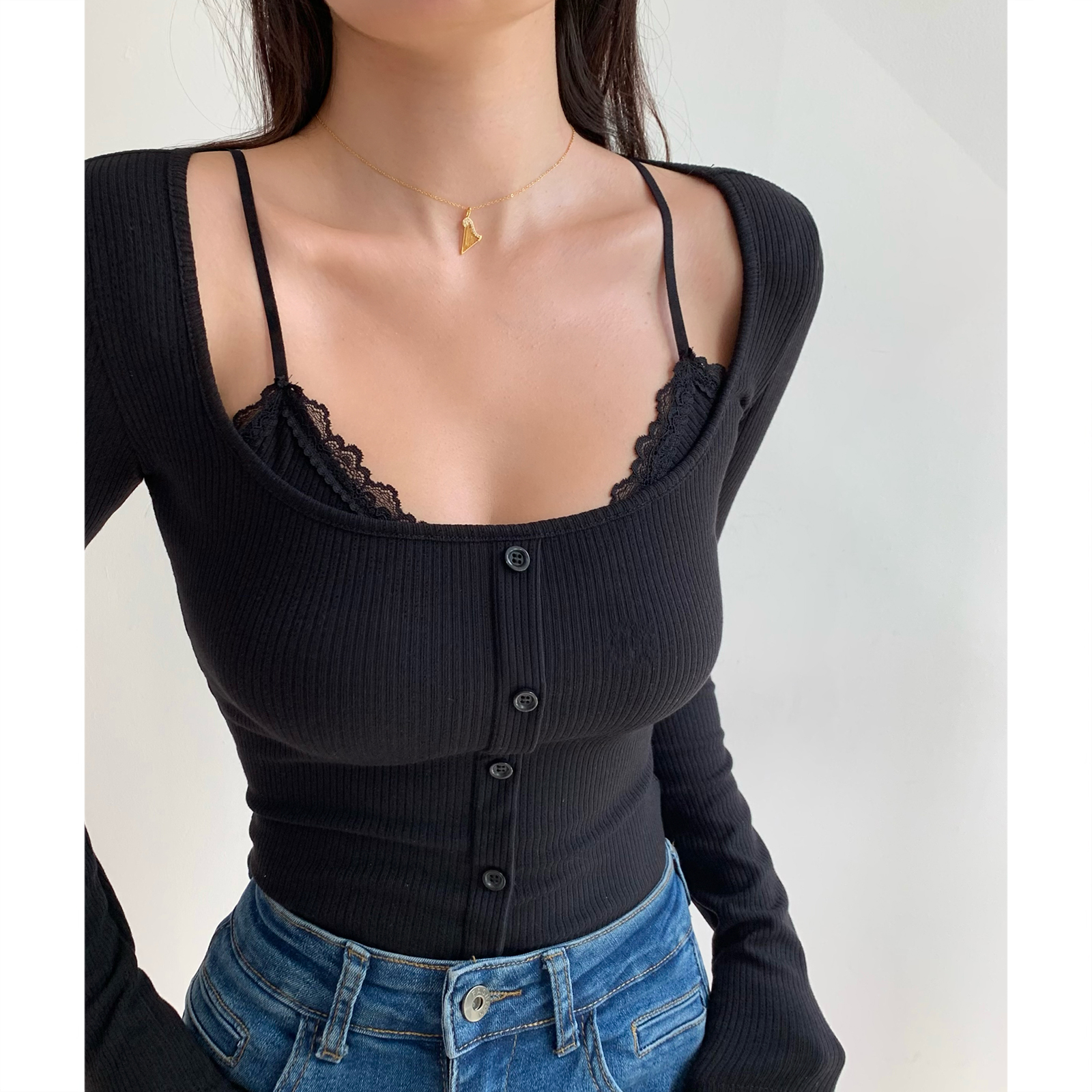 Faux Two Vintage Lace Trim Long Sleeve Slim Fit Neck Top Women – Fall Outfits Women