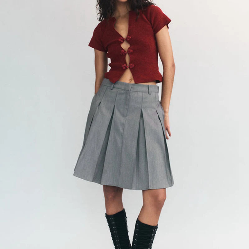 A cropped knit cardigan with bold frog button closures down the front for a statement look. Short sleeves and a fitted cut give it a Y2K edge, while the playful detailing makes it easy to style with low-rise pants, skirts, or cargos for streetwear outfits.