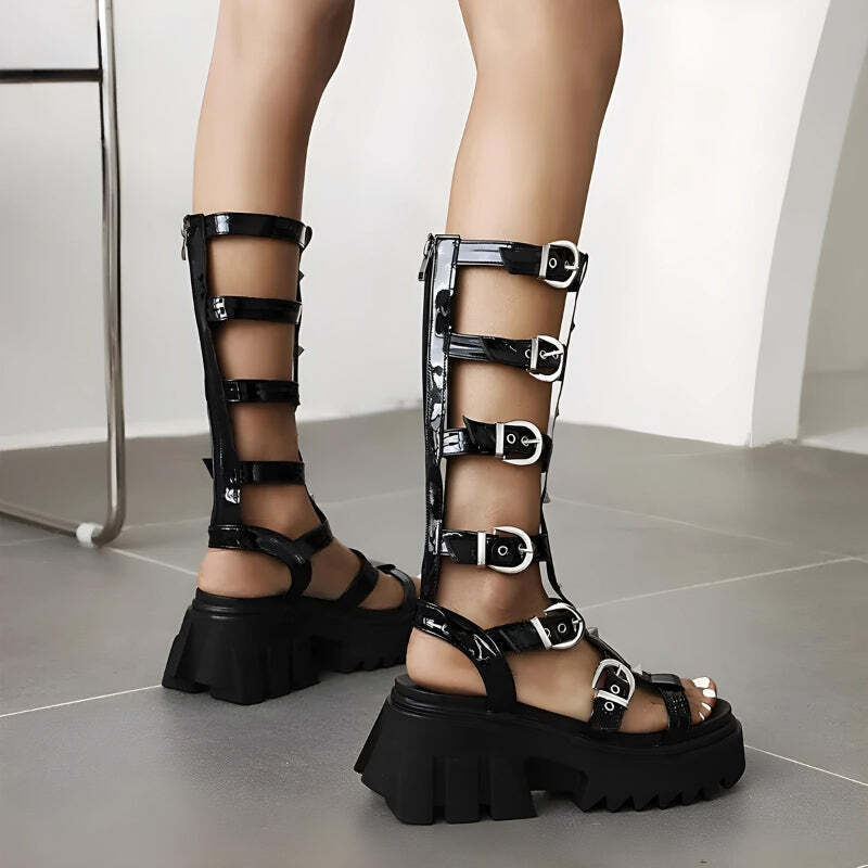 Boldly express your edgy style with these platform gladiator sandals. Multiple buckle straps and chunky soles make a strong statement. Ideal for making a lasting fashion impression.