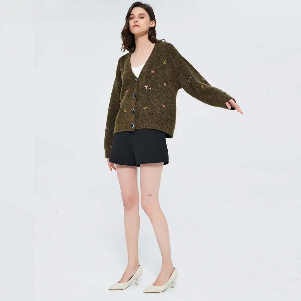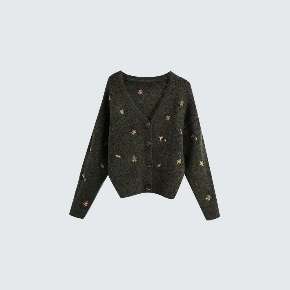 Immerse yourself in the whimsical world of Goblincore with this enchanting knit cardigan. Adorned with leaf and mushroom embroidery, the V-neck silhouette is as poetic as it is comfortable. Ideal for those who find solace in the imaginary woods of their minds.
