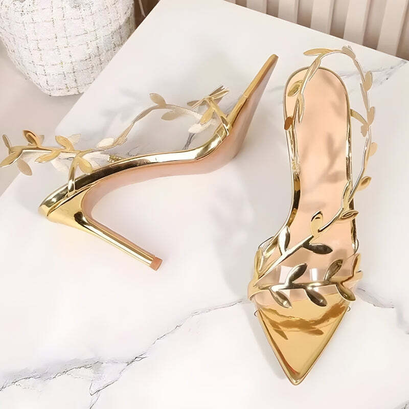 Bring goddess energy to every step with these Golden Leaf Heels. Their vine-like metallic straps wrap around your feet like art, making you feel ethereal, elegant, and bold—all at once.
