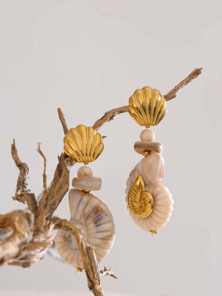The Golden Seashell Earrings channel beach glam with spiral shell motifs and luxe gold detailing. A sculptural piece that feels both mythical and modern—ready for your next coastal escape.