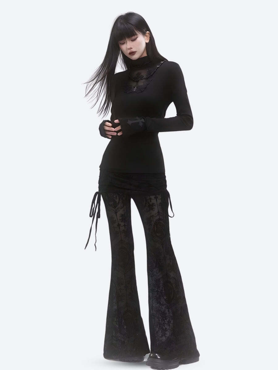 Channel edgy vibes with this goth cross turtleneck top. The sheer mesh cut-out and slim fit bring a bold look for parties or streetwear.