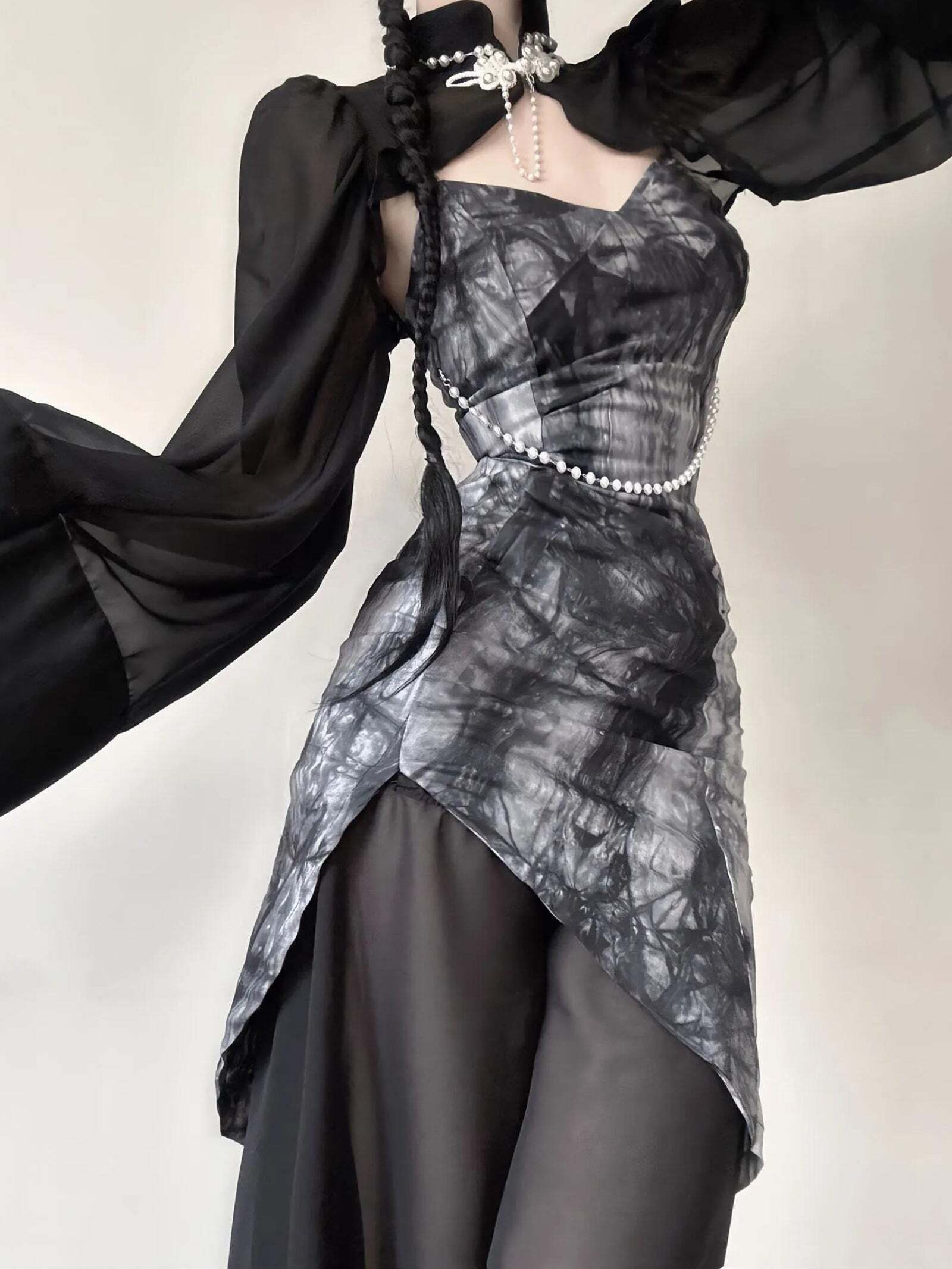 Goth Wide Sleeve Qipao Midi Dress for a Striking Vampire Costume Aesthetic