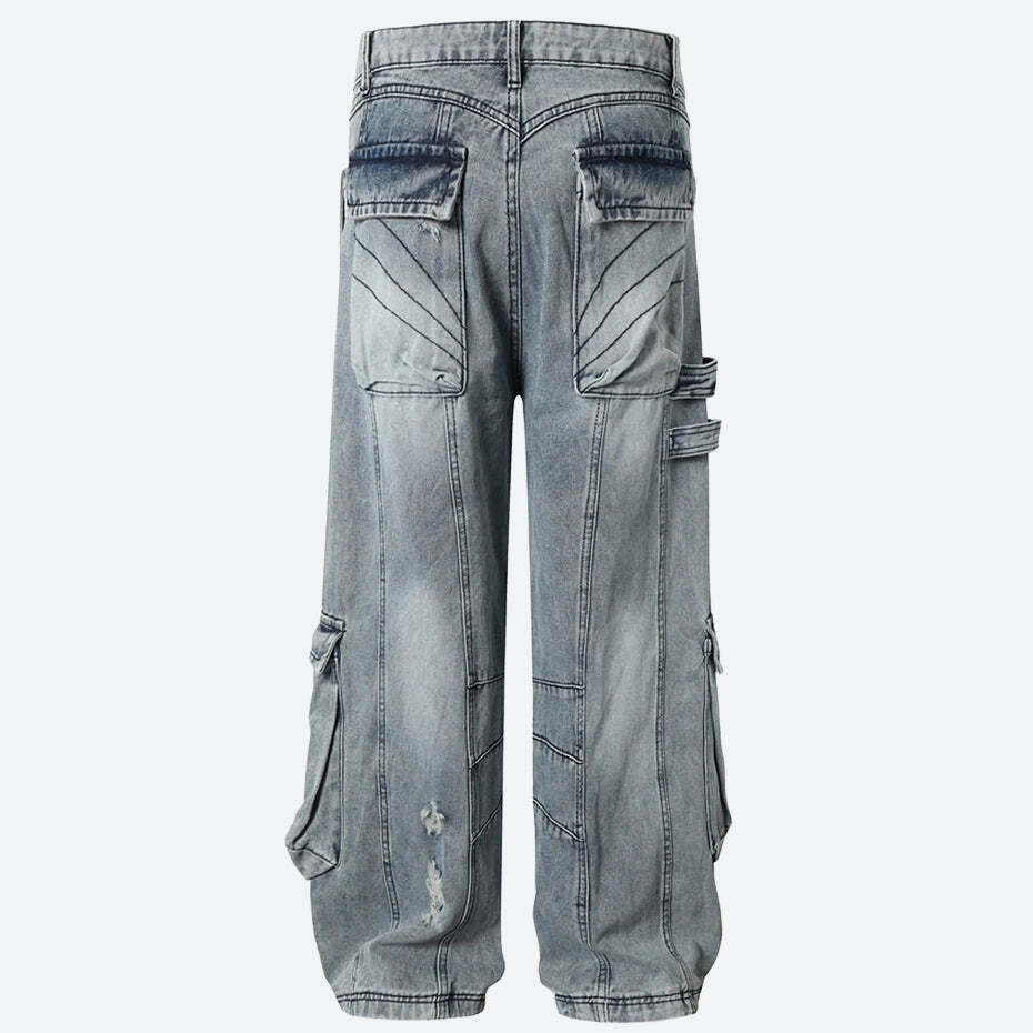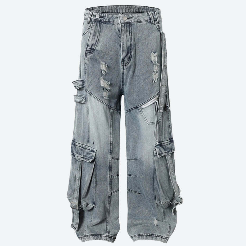 These Grunge Cargo Jeans are made for rule breakers and risk takers. With asymmetrical seams, distressed rips, and oversized cargo pockets, they bring industrial energy to everyday wear. The washed-out gray tone and stacked details scream edgy Y2K streetwear with a utilitarian twist.