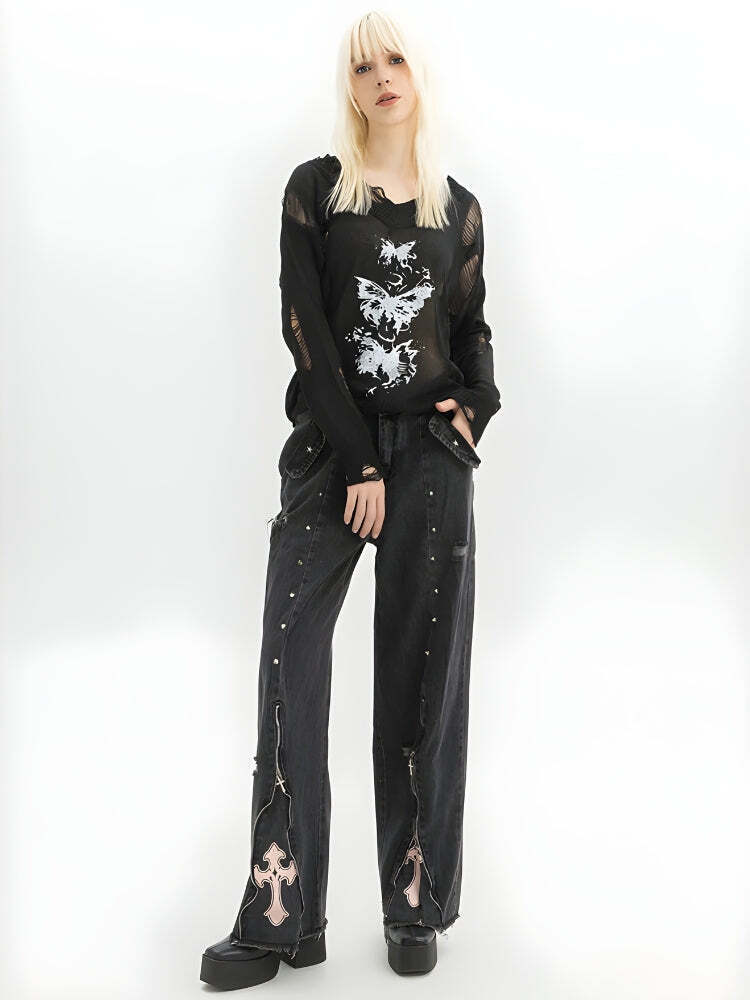 Grunge Cross Zip-Up Jeans High-quality product featuring 90s fashion, black jeans outfit fall, outfit inspo and more. Modern design that fits the latest trends. Premium materials ensure durability and comfort. Order now for special offers! Product designed with attention to every detail. Suitable for all occasions and personal styles.