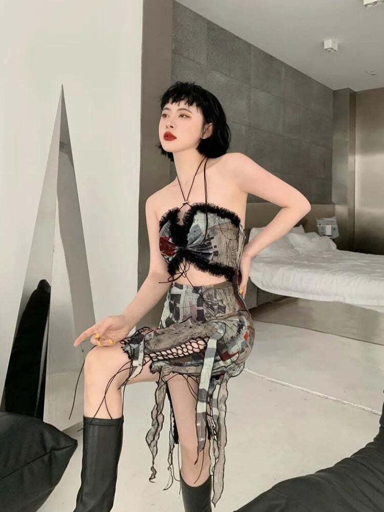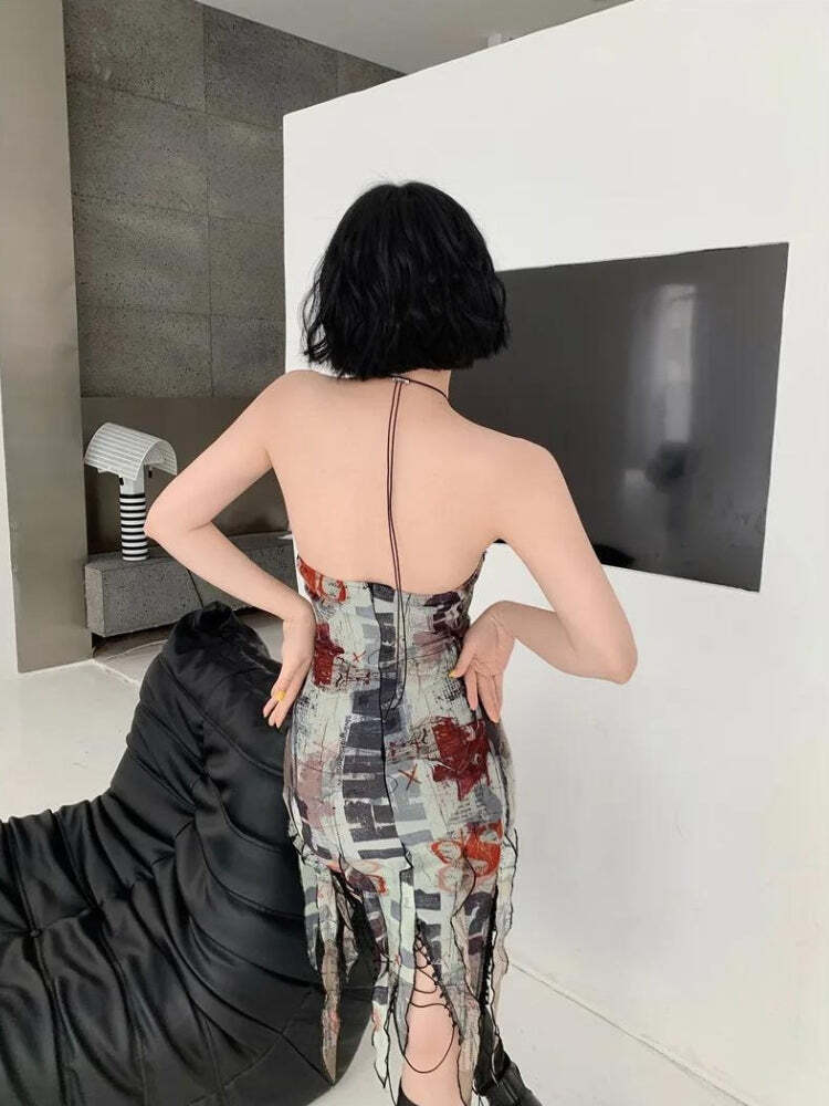 Embrace an edgy look with this grunge-inspired midi dress featuring bold cut-outs and a split design. Perfect for making a statement, it combines artistic prints with unique detailing for a truly standout piece.