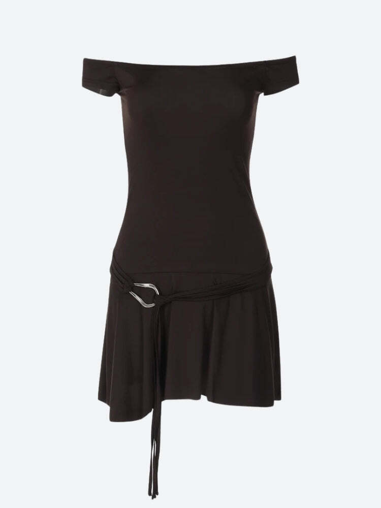 Sleek, sultry, and unapologetically cool. This off-shoulder mini dress serves grunge-girl vibes with a modern twist. The fitted bodice, asymmetrical hem, and edgy rope belt with metal loop detail make it a go-to for low-effort, high-impact style.