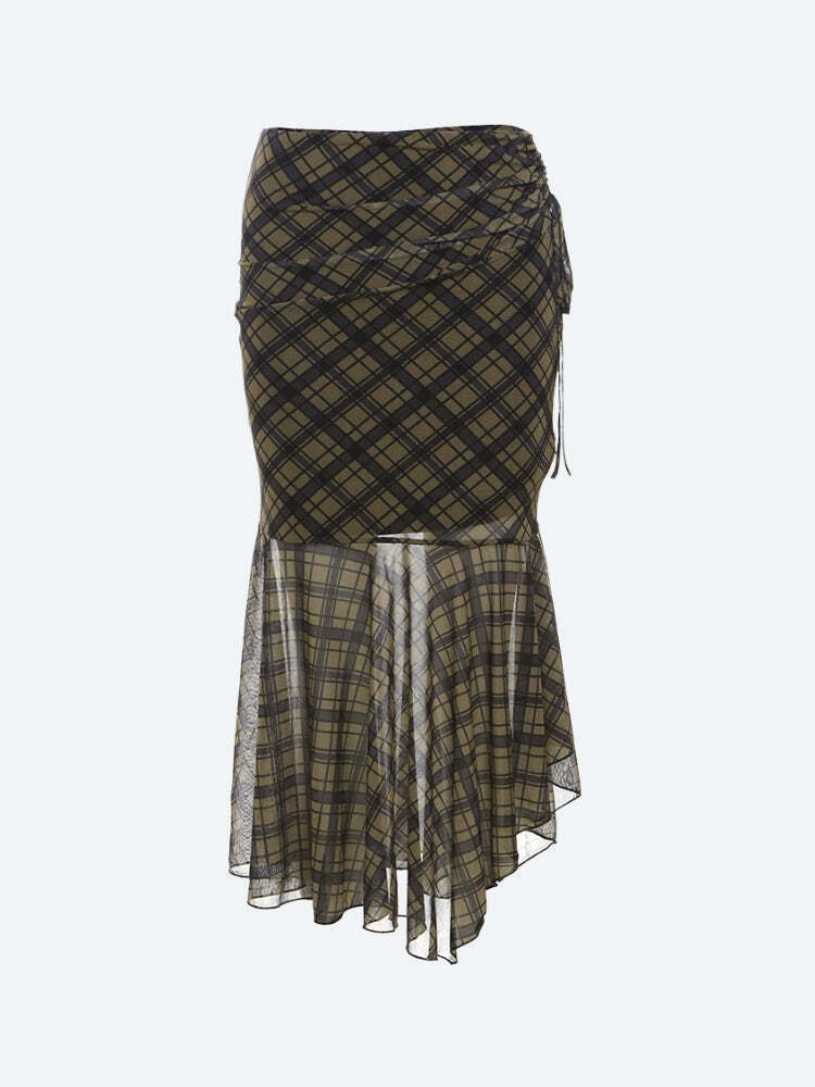 Serve soft grunge vibes in this plaid mesh midi skirt. With its layered design, semi-sheer hem, and adjustable side tie, it blends edgy and ethereal effortlessly. The high-waisted cut hugs your silhouette while the flared bottom adds movement—perfect for alternative fits, concert looks, or streetwear styling.