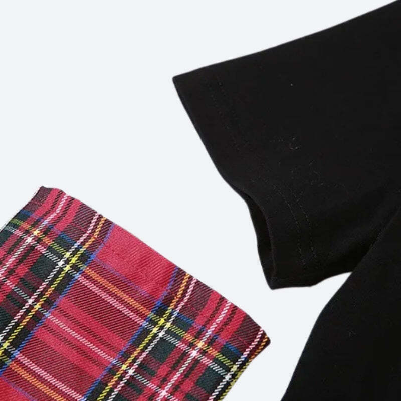 Turn heads in the Grunge Plaid Star Patch Top. Asymmetrical cuts, buckle strap, and plaid star bring alt-core energy. Includes mismatched arm warmers for a full edgy vibe.
