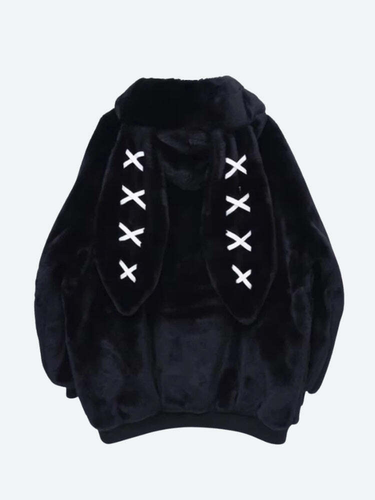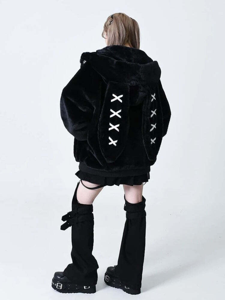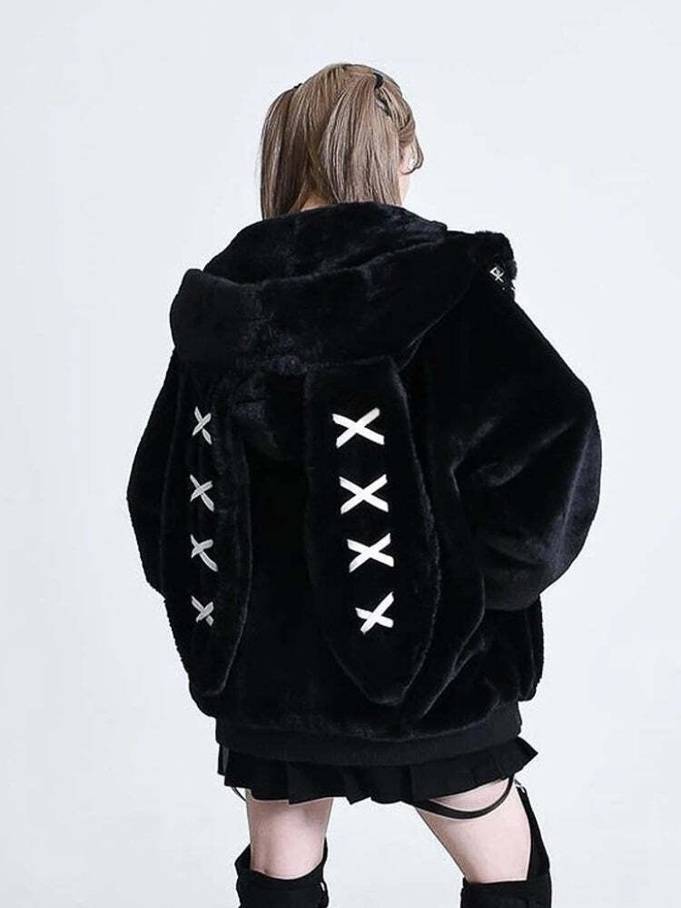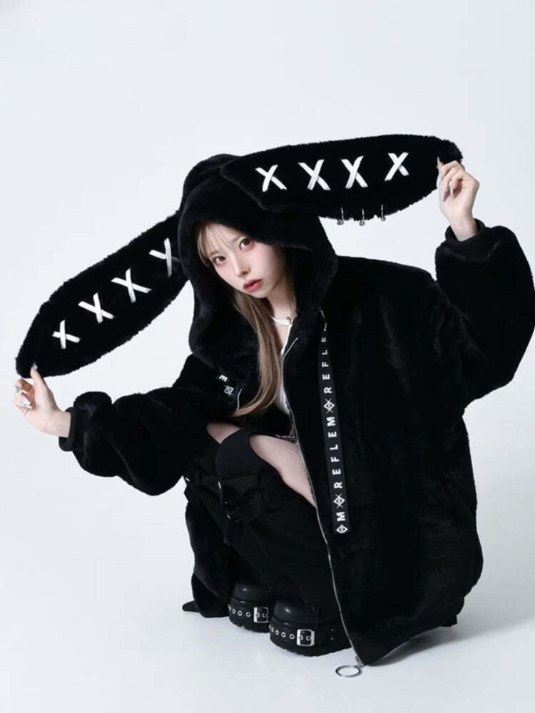 The Grunge Rabbit Ear Plush Jacket blends edgy fashion with cozy vibes. Designed with oversized bunny ears featuring cross-stitch details, this faux fur hoodie adds a rebellious touch to any outfit. Perfect for Harajuku, goth, and grunge aesthetics.
