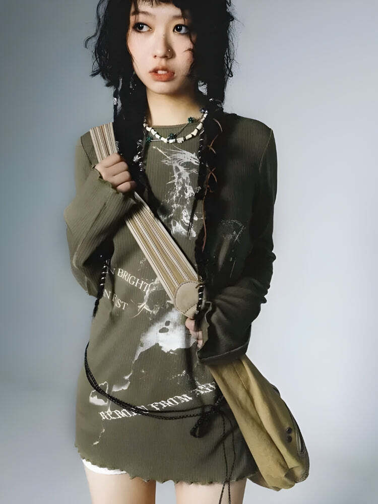 This grunge-inspired tunic top features unique print details and side belt loops for a rope belt. With long sleeves, it’s versatile for casual events, parties, or punk and e-girl inspired streetwear, making it a standout addition to any edgy wardrobe.