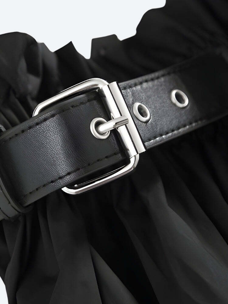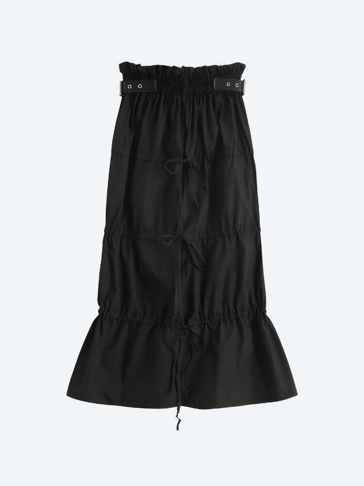 Channel edgy flair with this black midi skirt. Ruched layers and drawstring details create a layered silhouette. Rock it with chunky boots or a sleek top for daily or night looks.